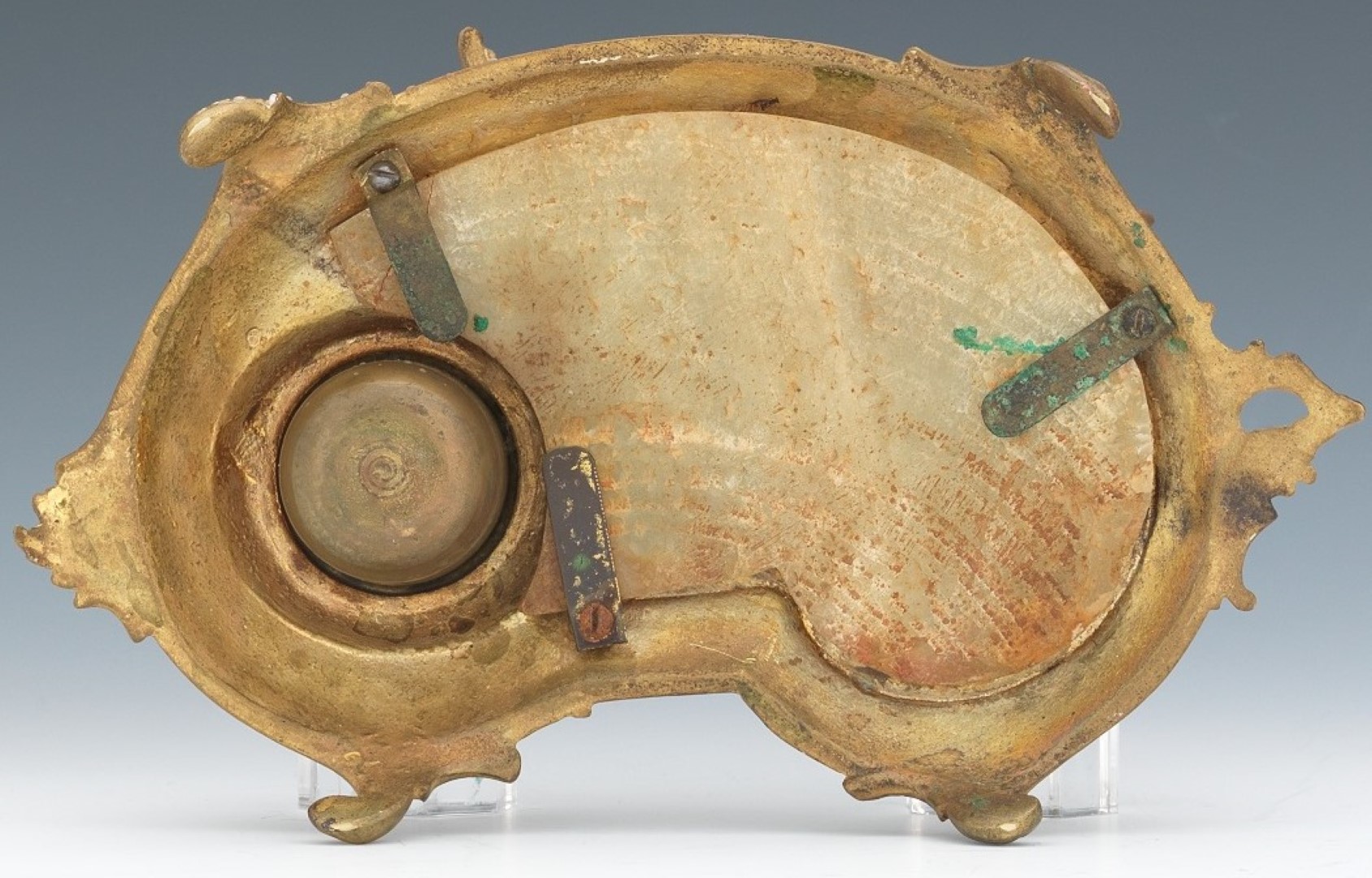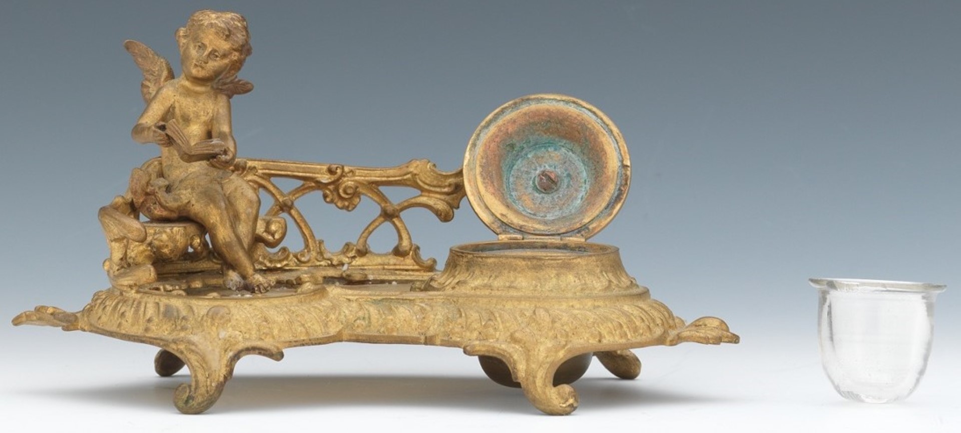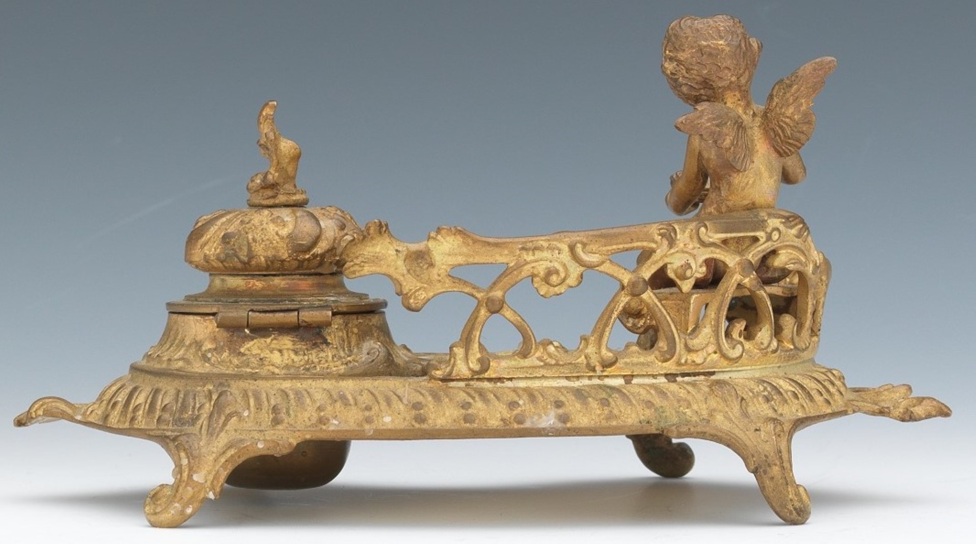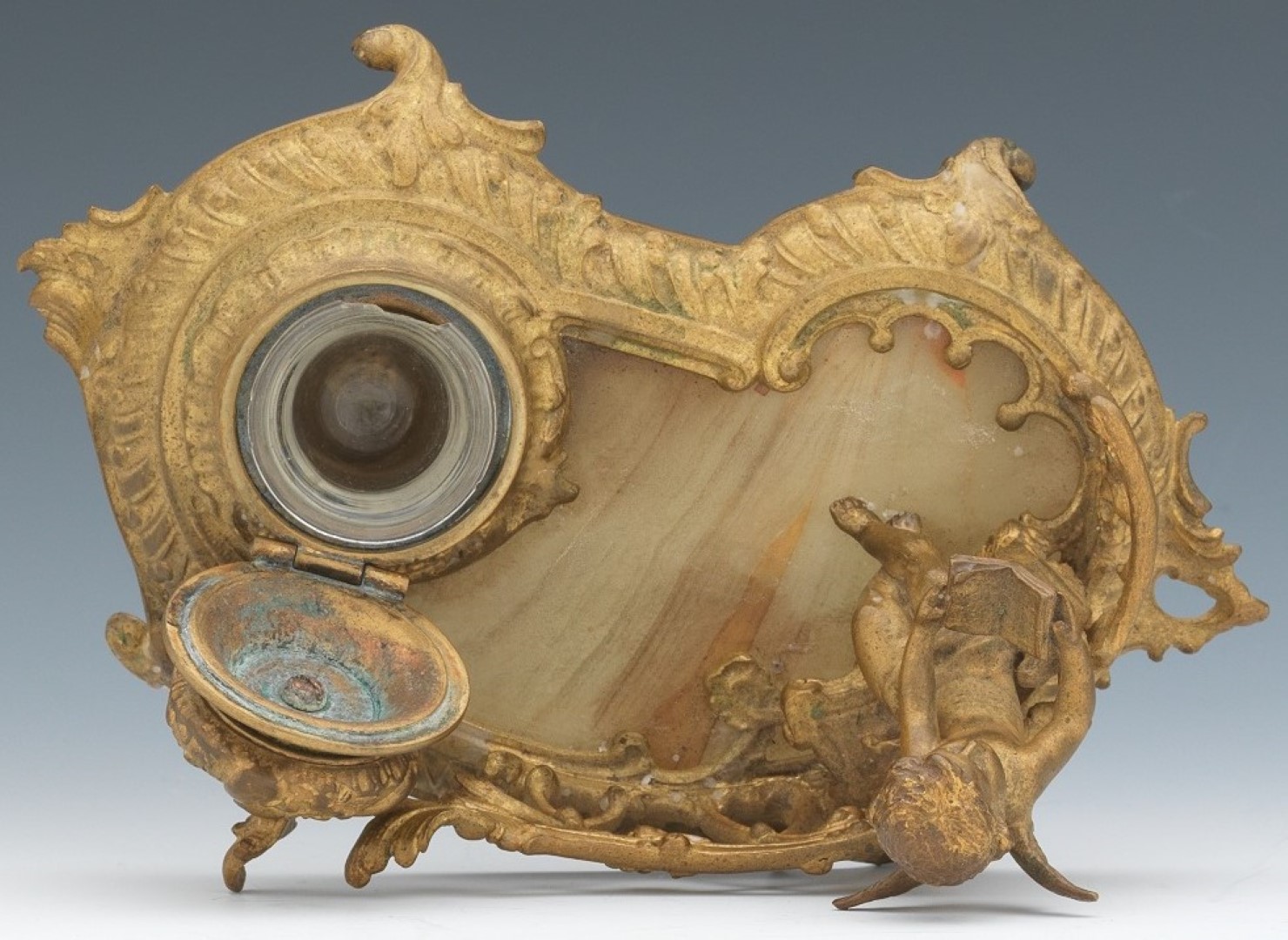 Rococo designed bronze Doré inkwell with the figure of Cupid reading a book while seated on a bench before a balustrade. On the other end is an inkwell with a hinged lid and a glass insert. Under Cupid’s feet is a sheet of natural agate. Unmarked.
