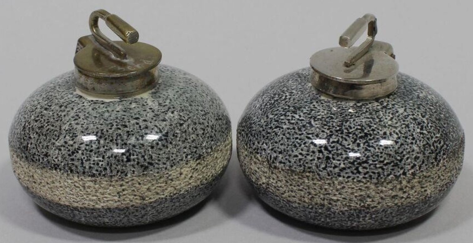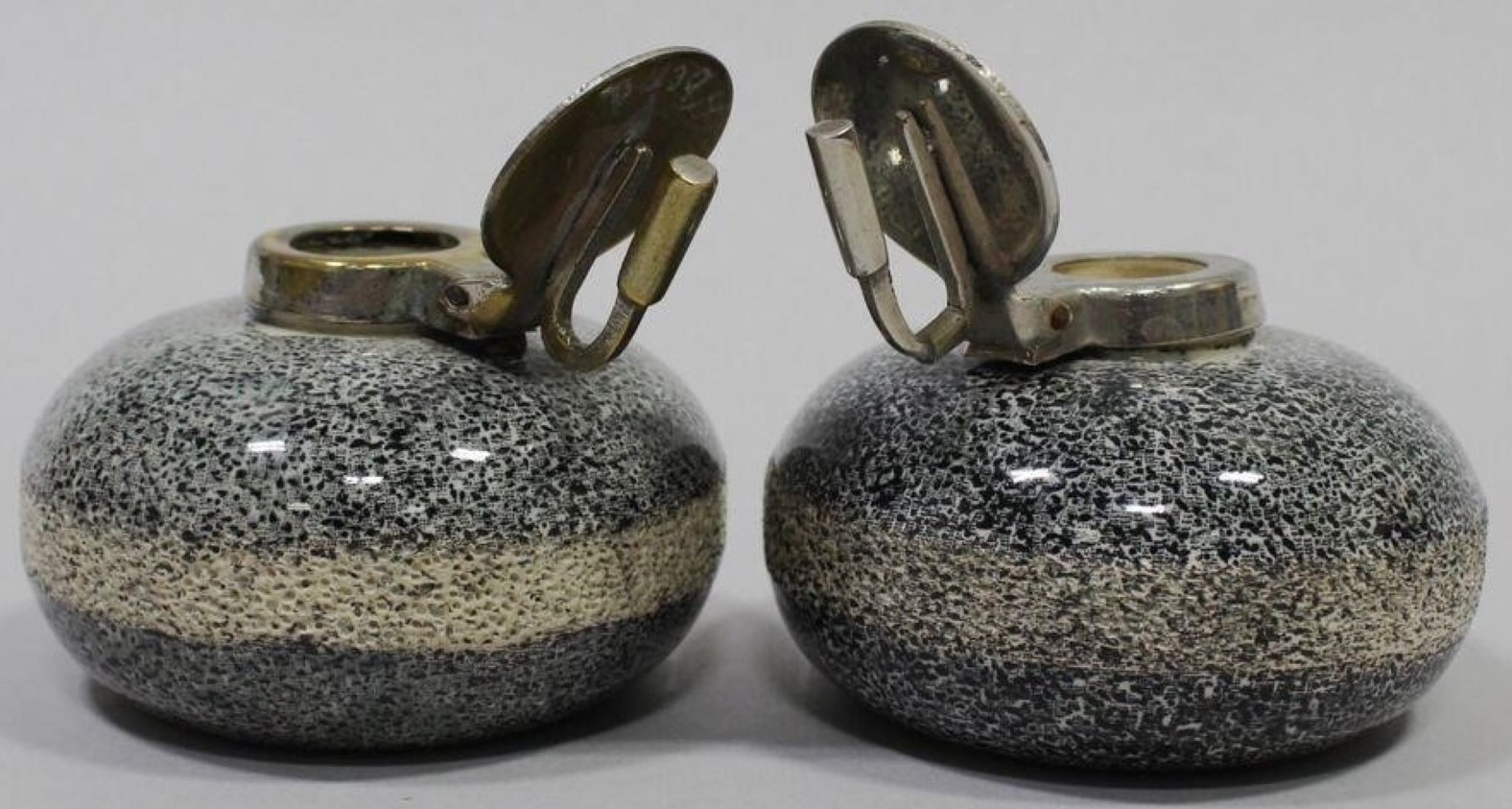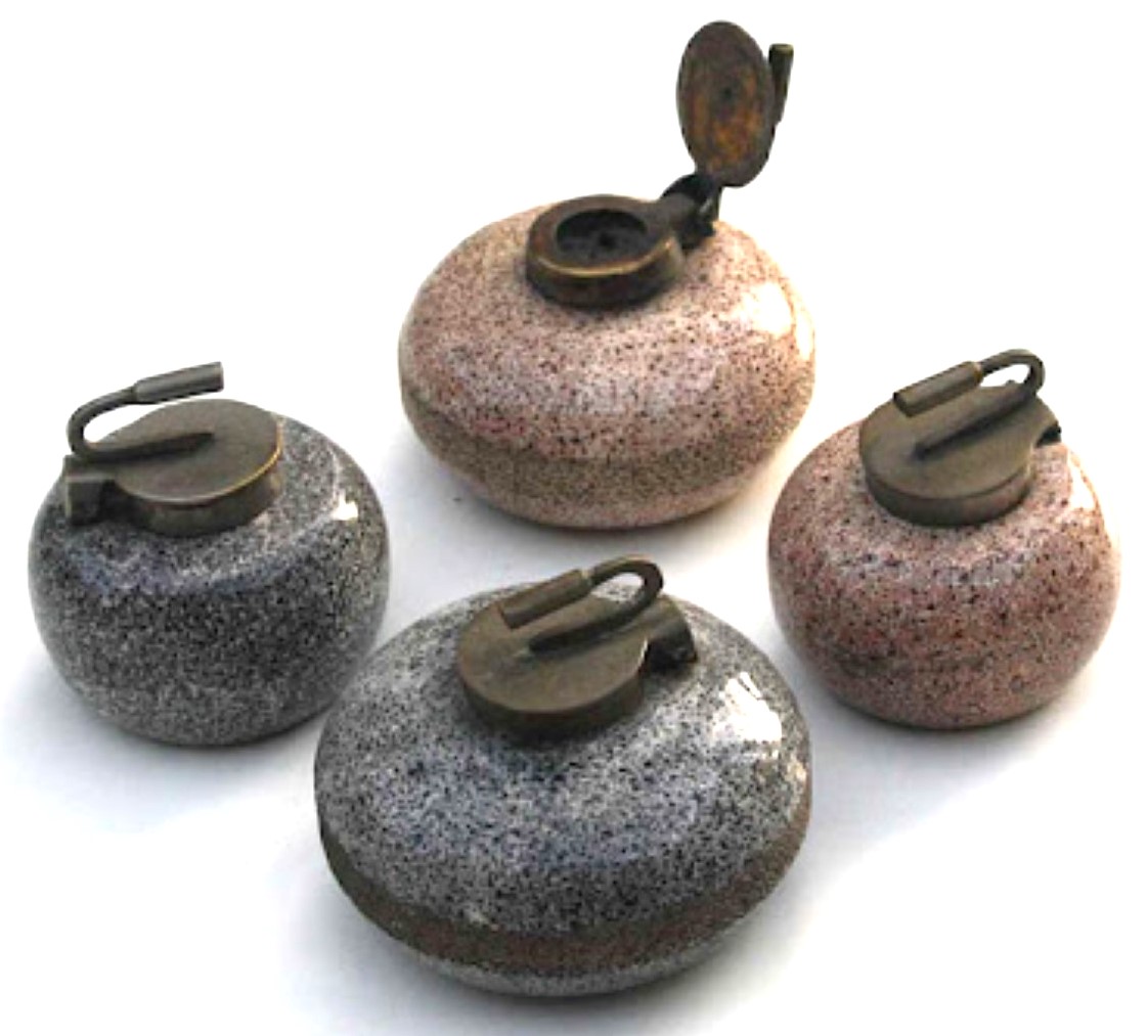 A sample of curling stone inkwells is displayed here. They are NOT made of stone, but rather with a high glaze pottery with transferred designs to simulate a granite effect. The hinged lid with a gooseneck handle replicates the handle of a curling stone.
