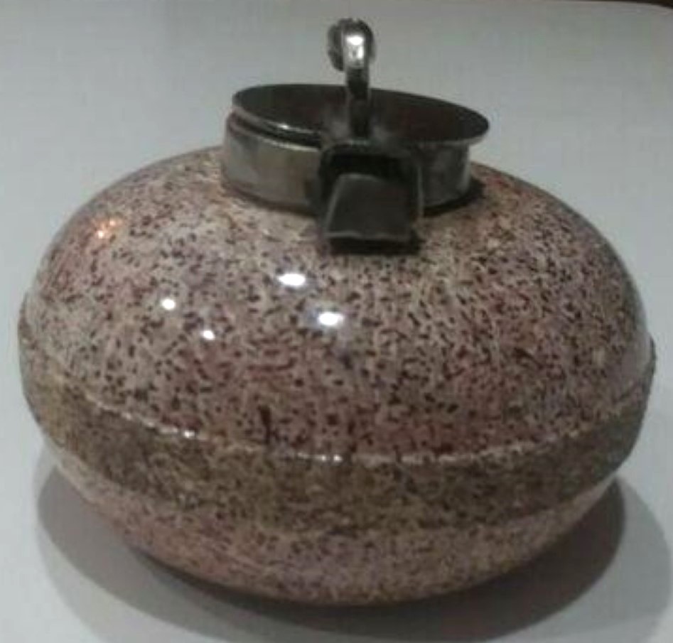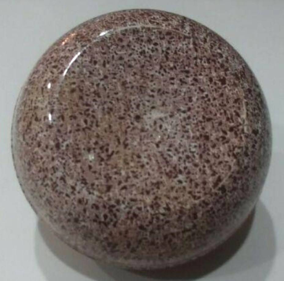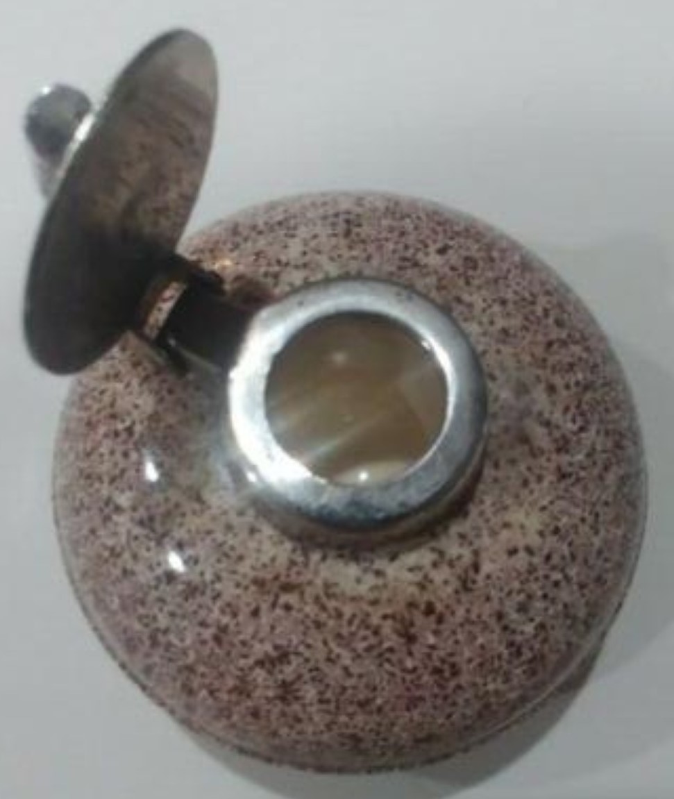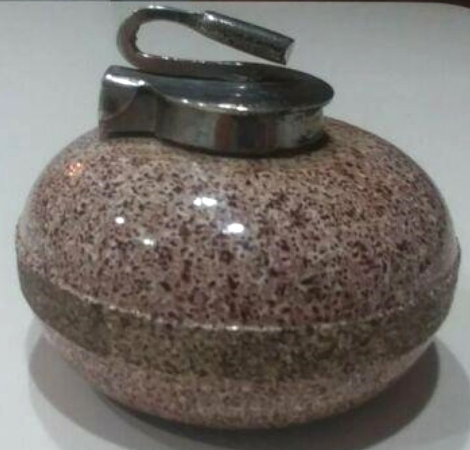 A sample of curling stone inkwells is displayed here. They are NOT made of stone, but rather with a high glaze pottery with transferred designs to simulate a granite effect. The hinged lid with a gooseneck handle replicates the handle of a curling stone.
