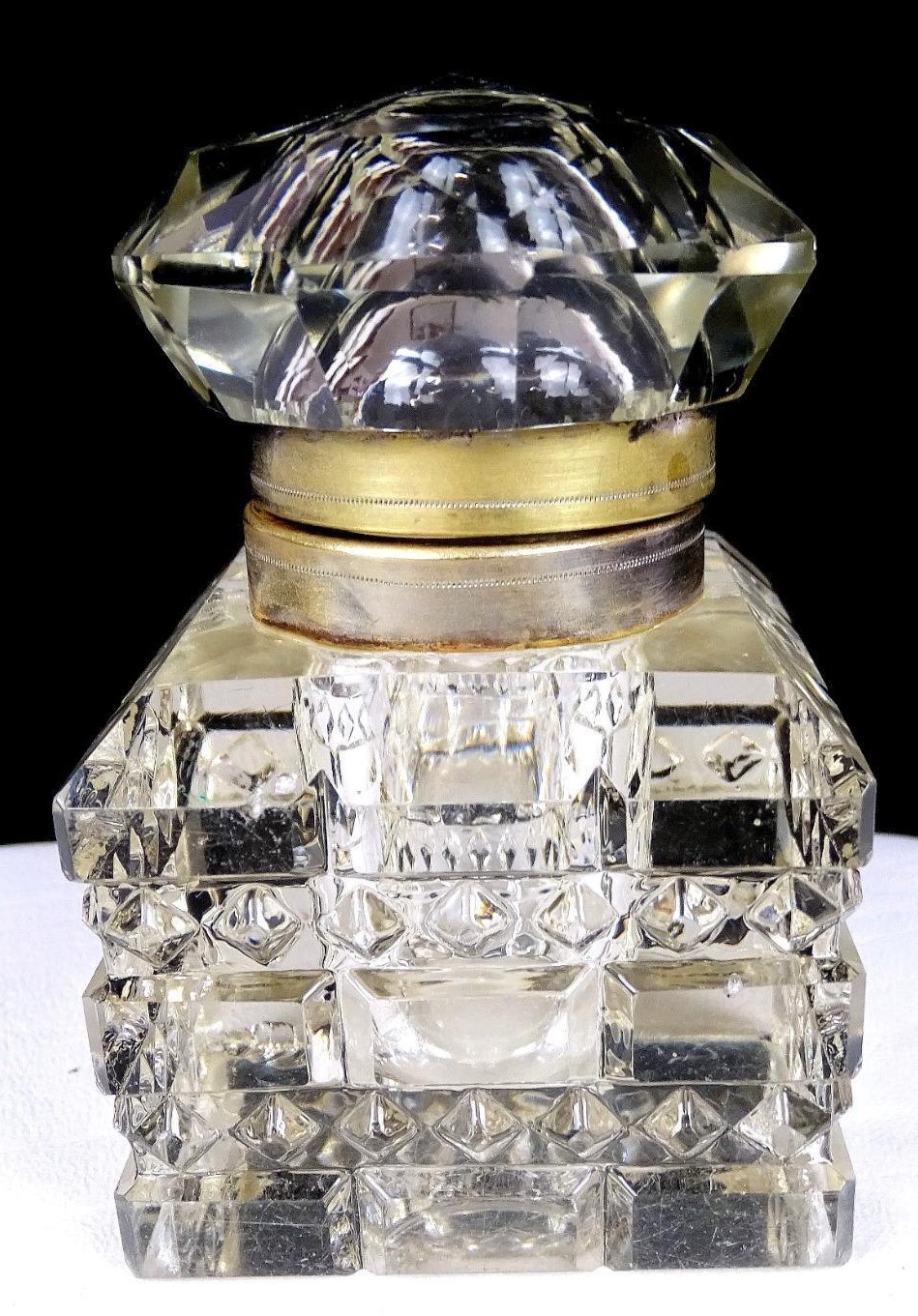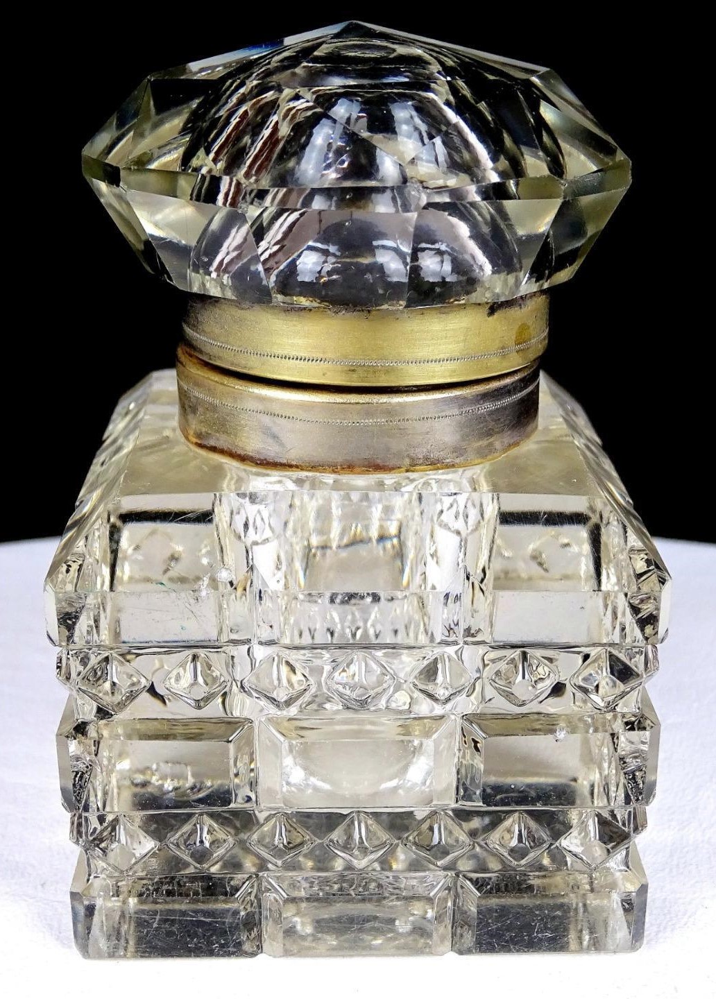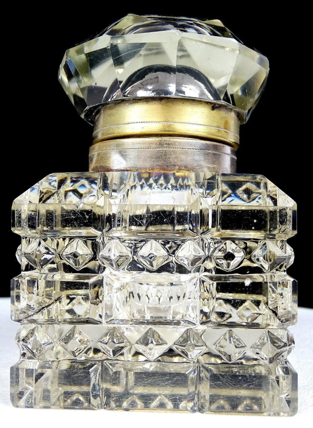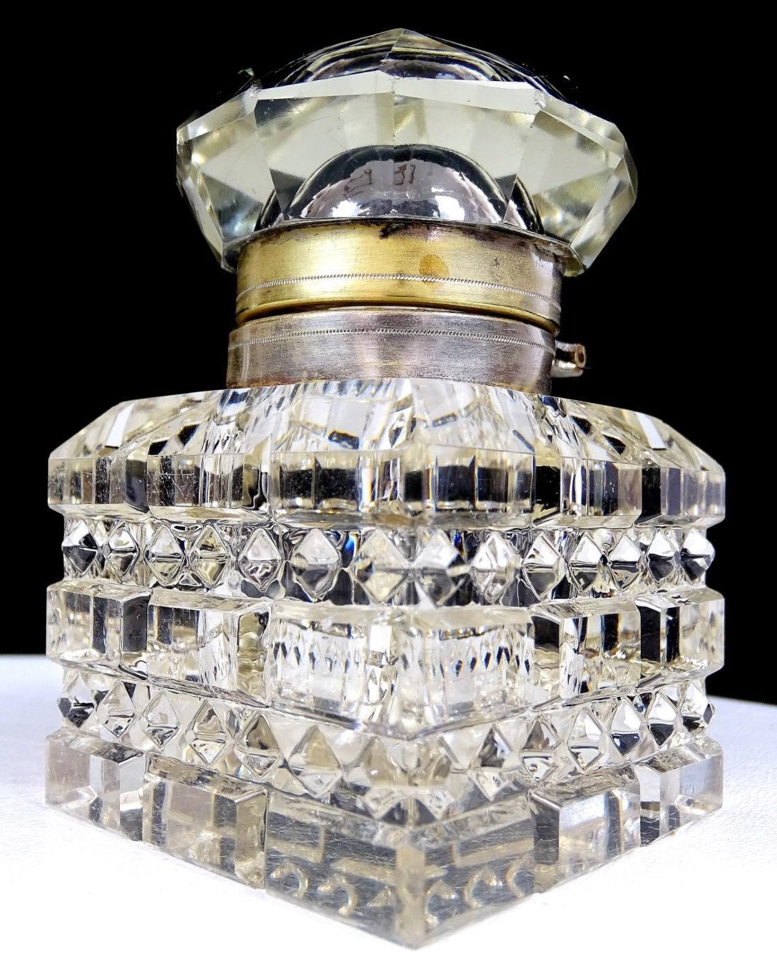 Crystal inkwell cut into rectangular blocks and diamonds. There are two rows of small-cut diamonds around. The corner edges are chamfered. The lid is cut in the shape of a large diamond. It has a silver tone collar.
