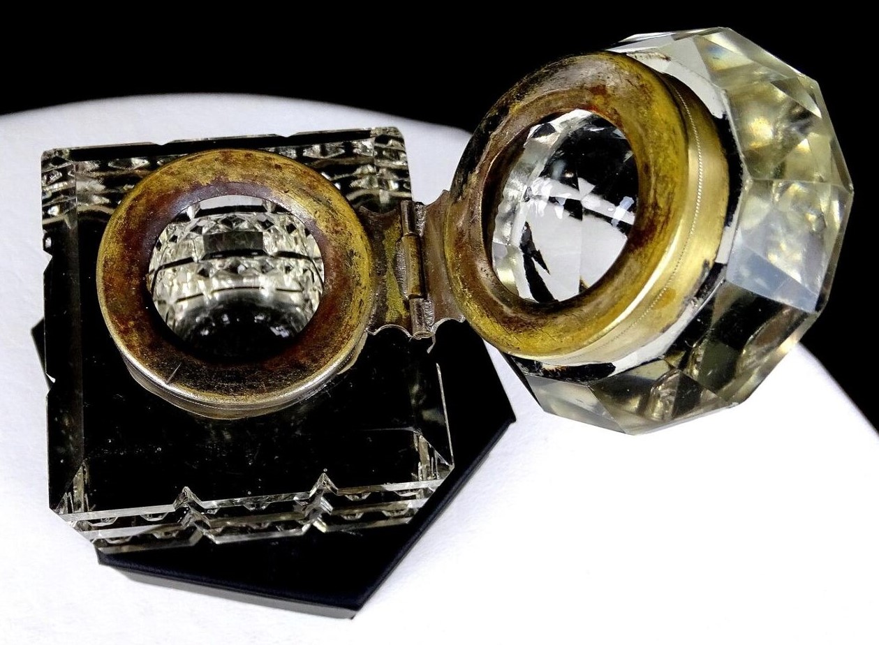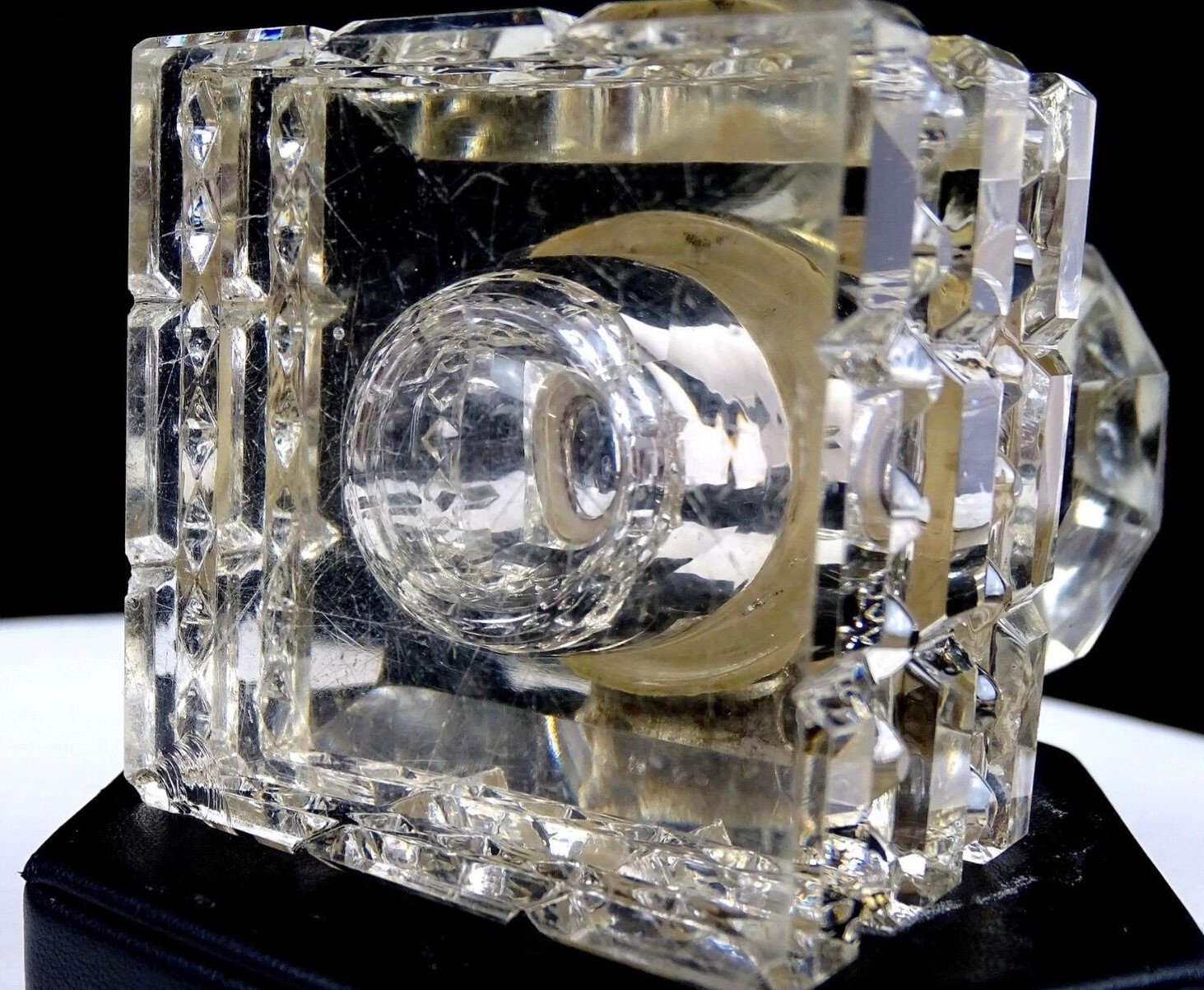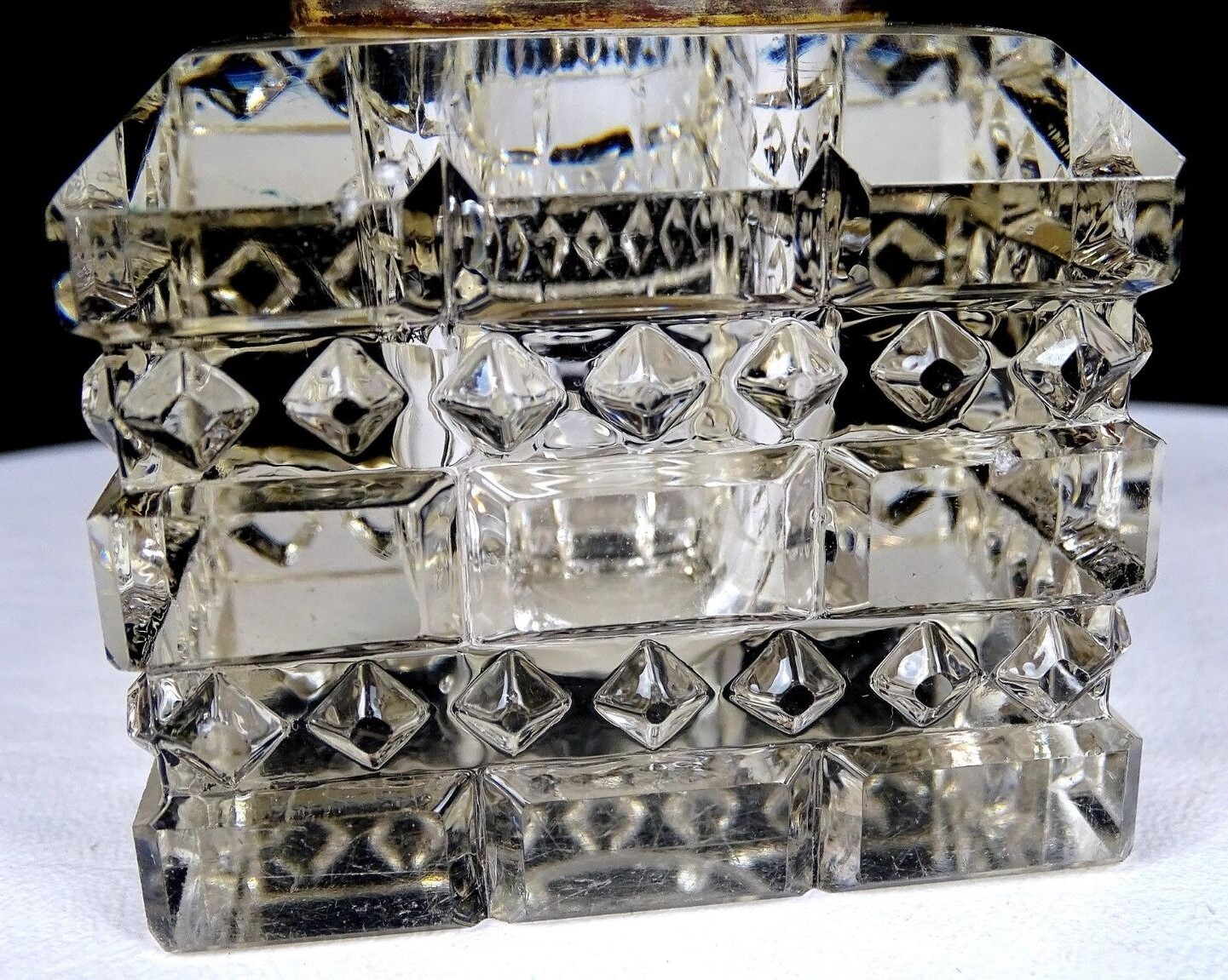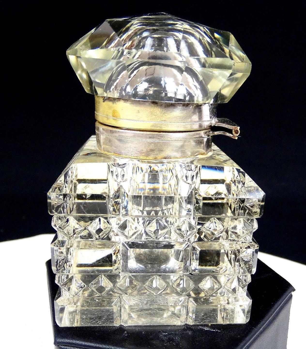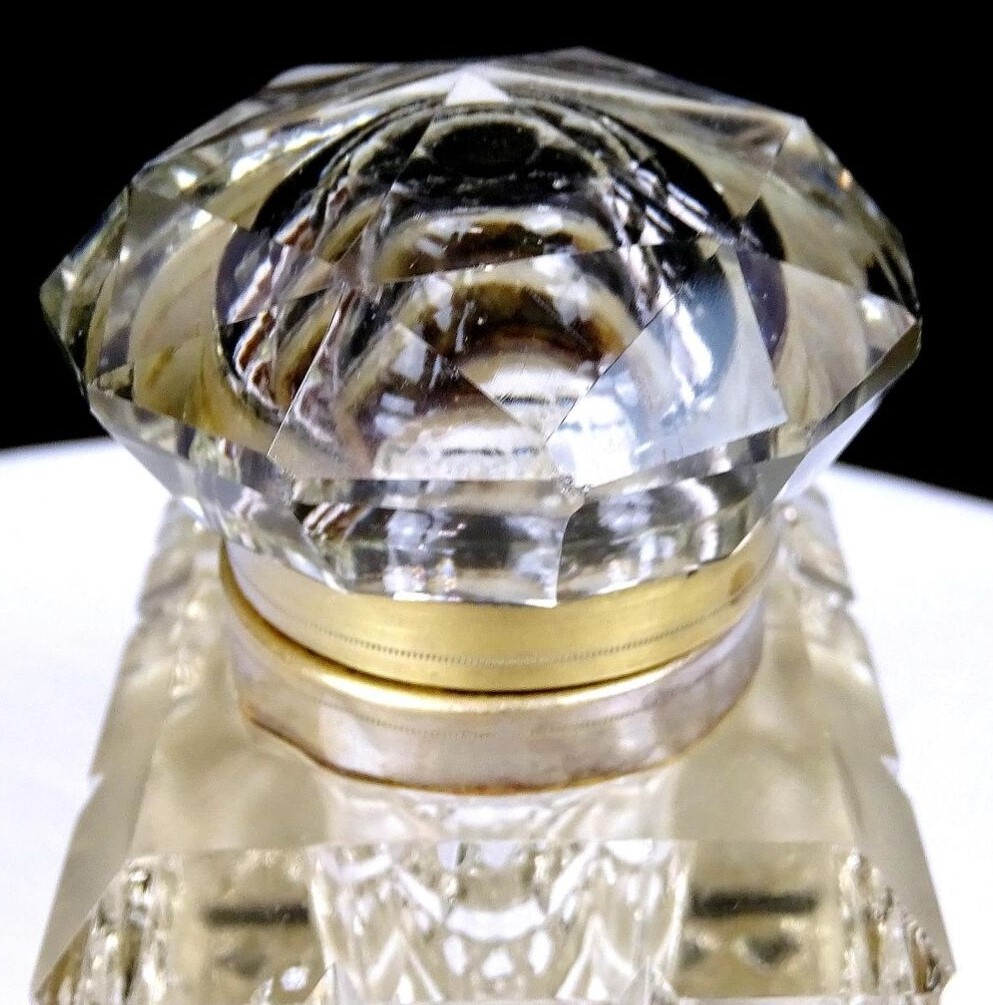 Crystal inkwell cut into rectangular blocks and diamonds. There are two rows of small-cut diamonds around. The corner edges are chamfered. The lid is cut in the shape of a large diamond. It has a silver tone collar.