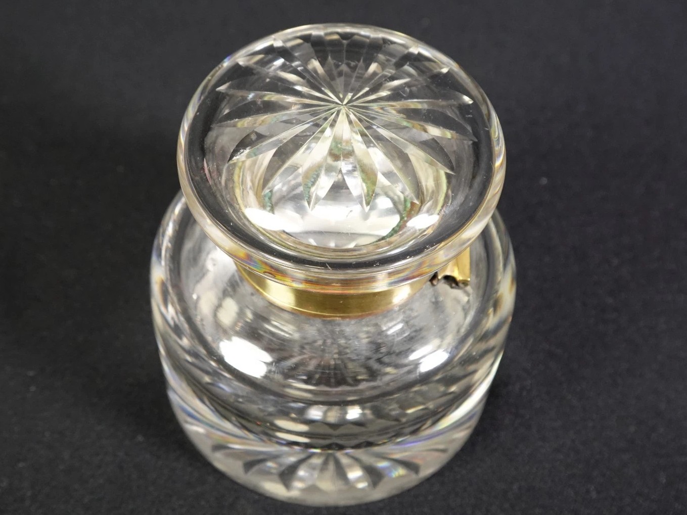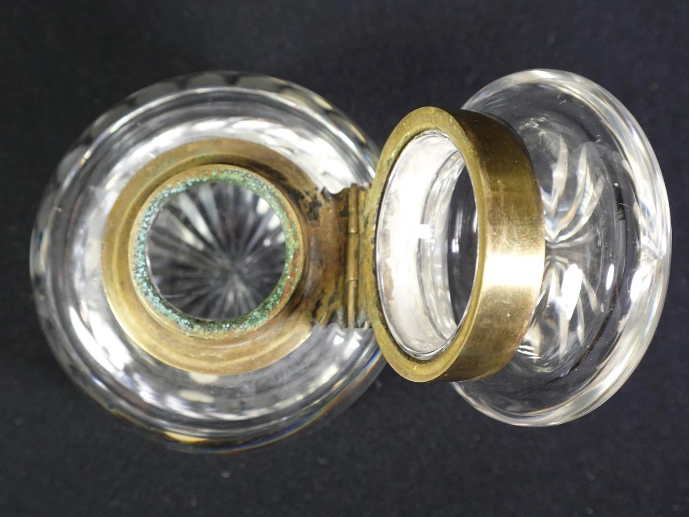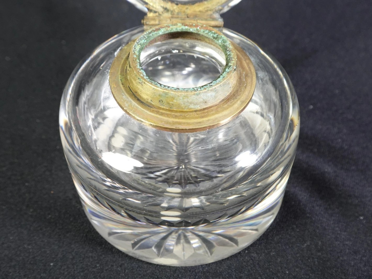 - The simplicity of the brass hinge, combined with the starburst cutting patterns, is most characteristic of the Late Victorian or Edwardian eras. During this period, these heavy crystal wells were standard in professional offices and upper-class libraries before the widespread adoption of the fountain pen.