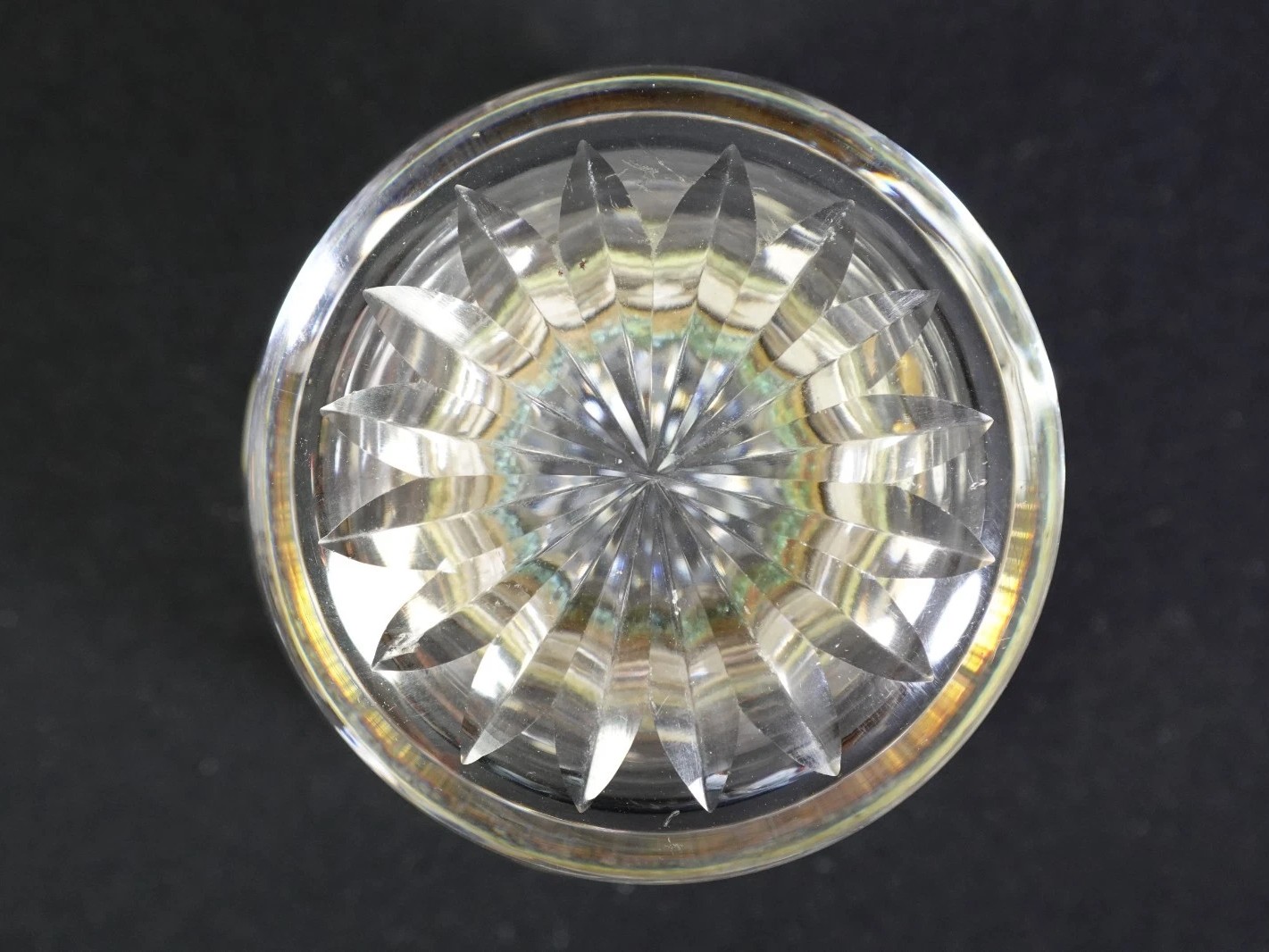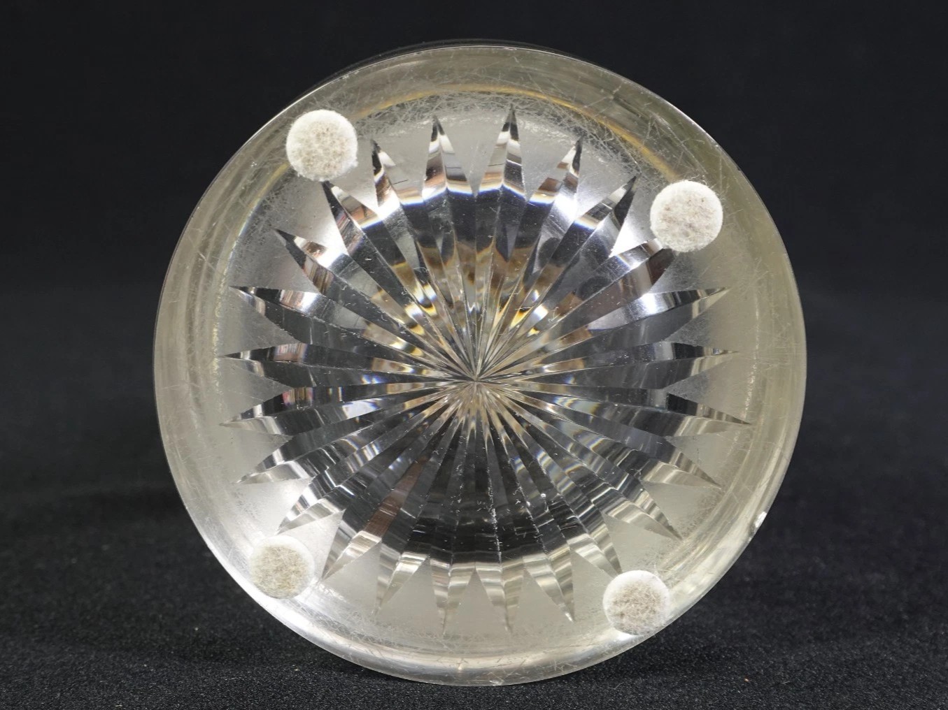 - Top and Base Faceting: Both the hinged lid and the underside of the base feature a deeply cut radial starburst (or sunburst) pattern. This design serves a dual purpose: it creates a brilliant play of light through the glass and provides a stable, non-slip surface for the heavy vessel.