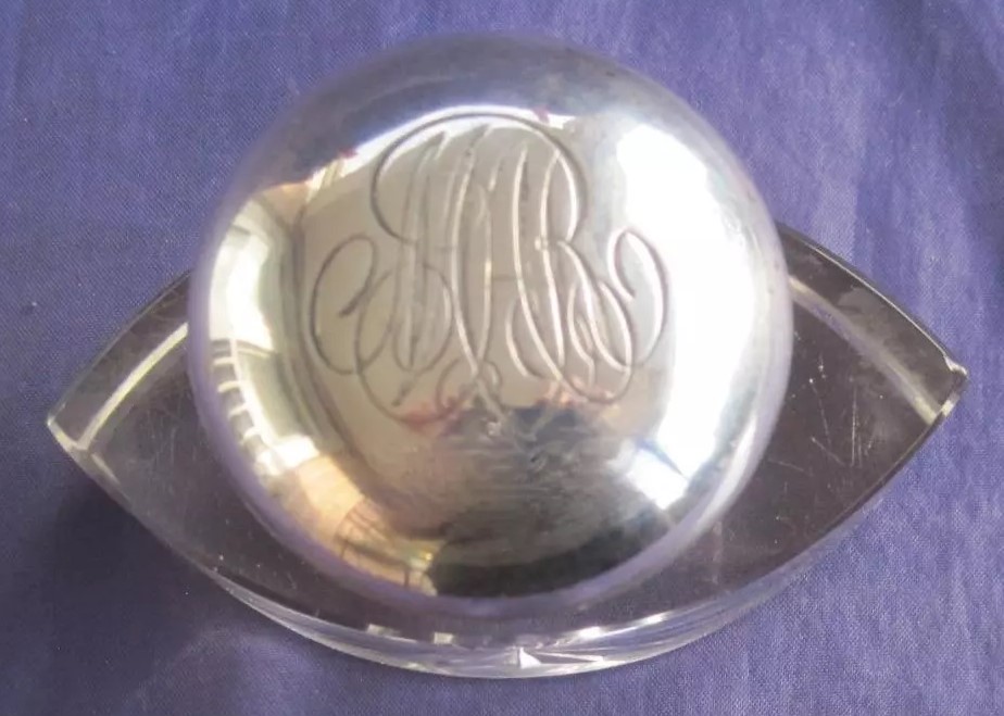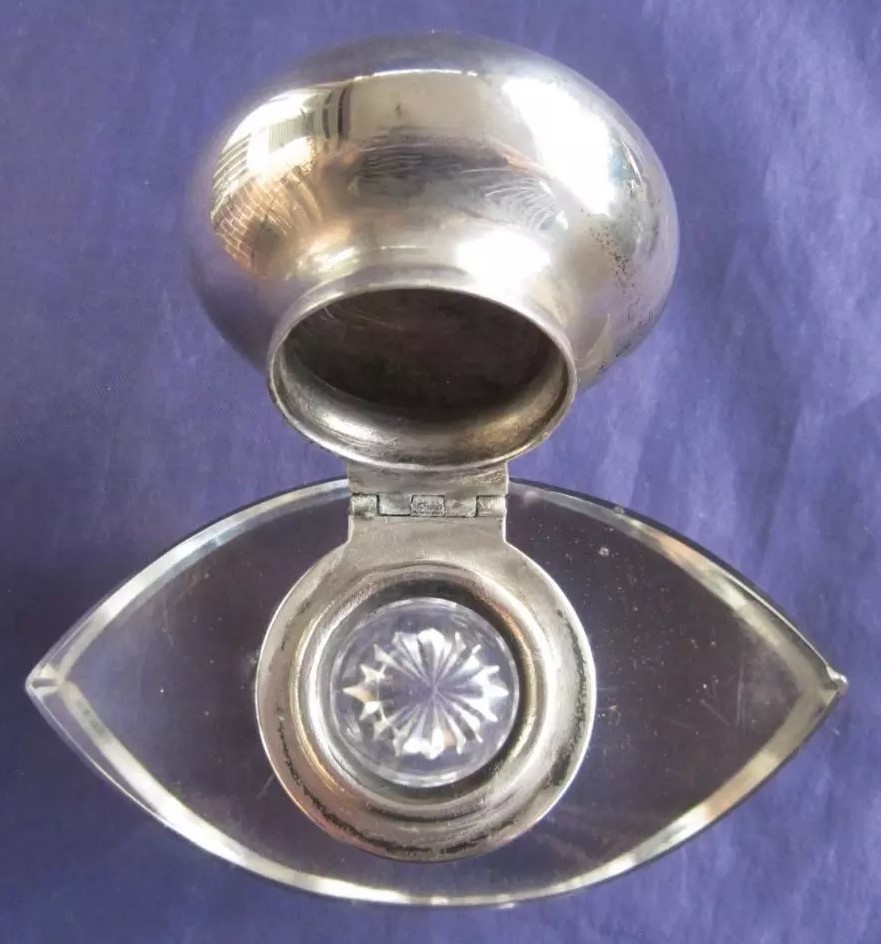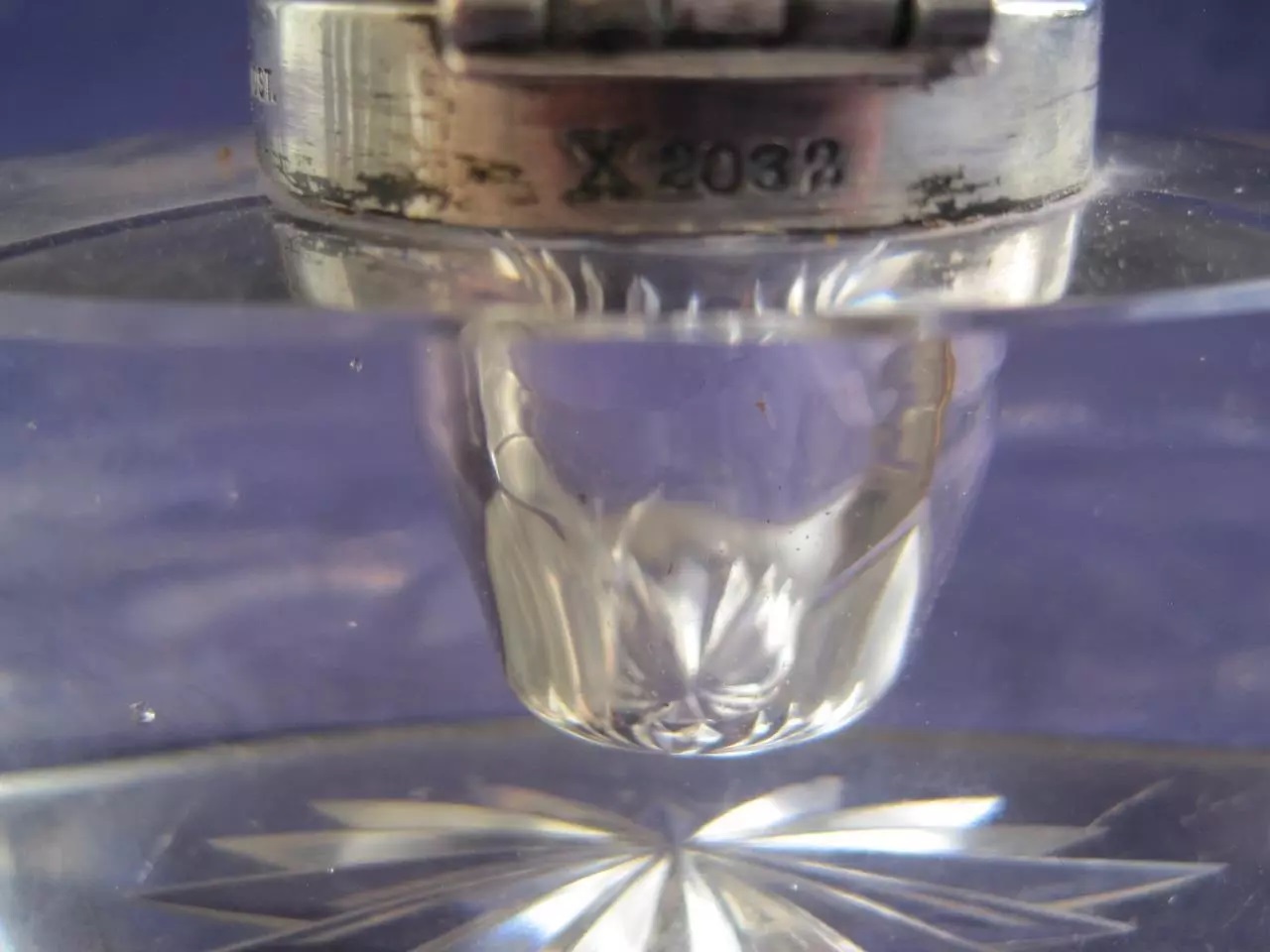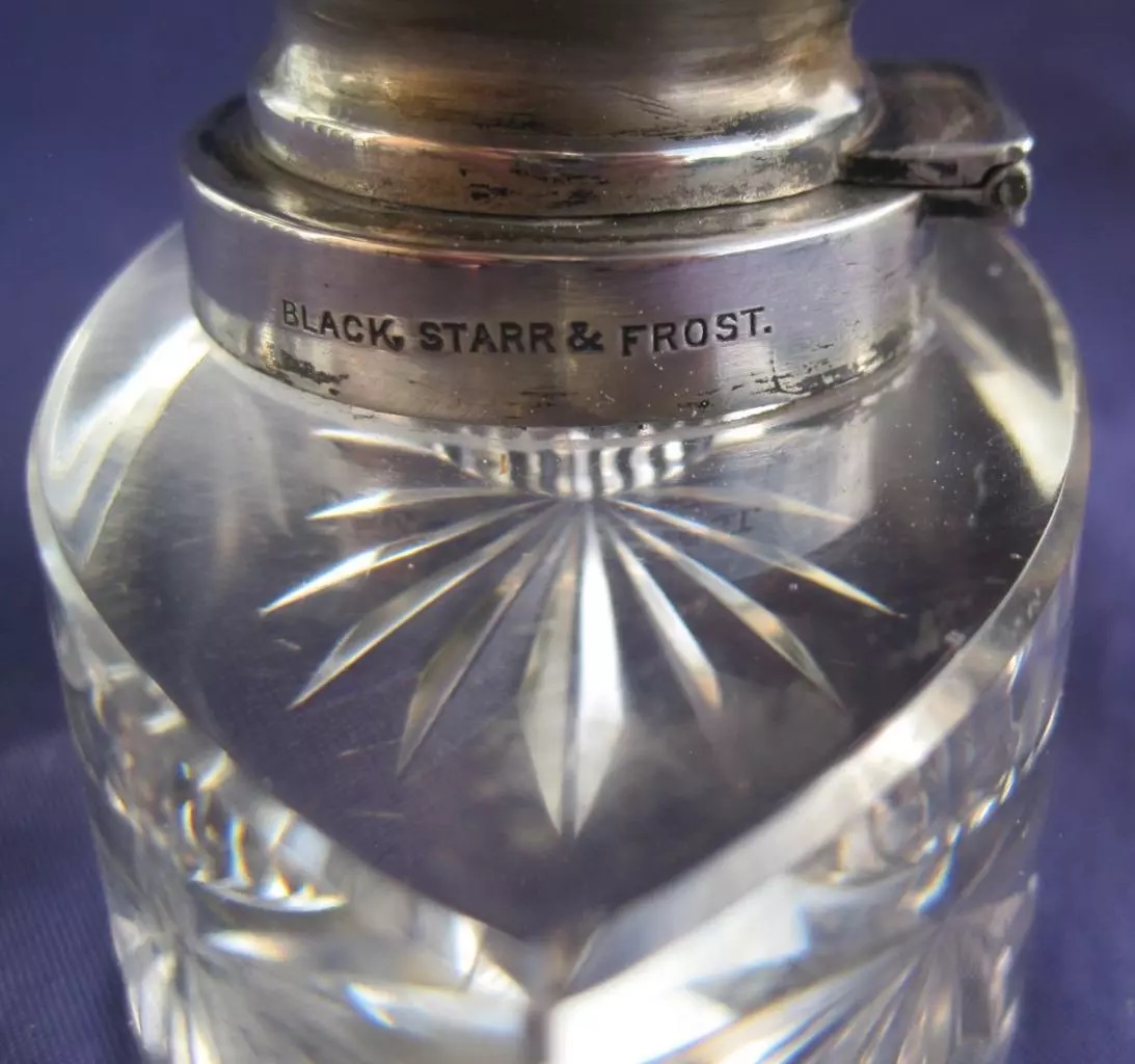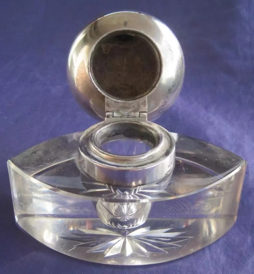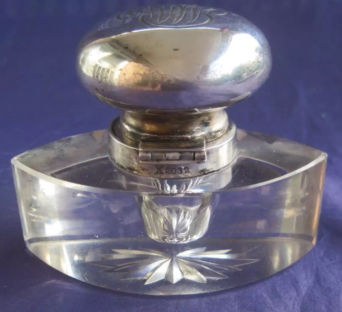 A cut crystal oval-shaped inkwell with a sterling silver hinged lid. The lid is marked “Black, Starr & Frost” and numbered X2032. The lid features an intricate, florid monogram. The exact initials are hard to decipher due to the elaborate design. The body of the inkwell is made from cut crystal. The sterling silver lid, with its rounded dome shape, complements the crystal body.