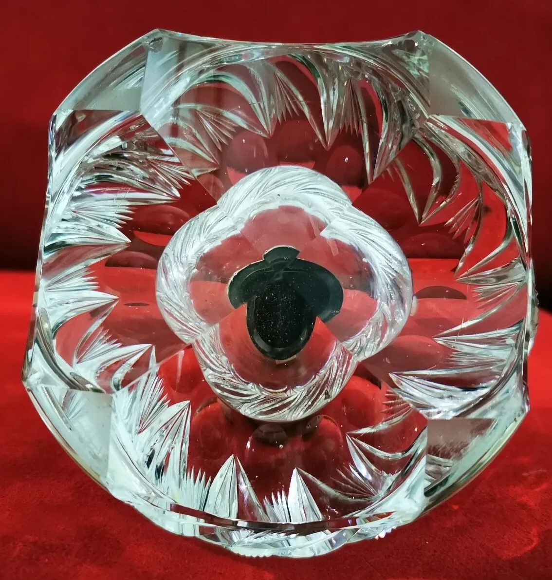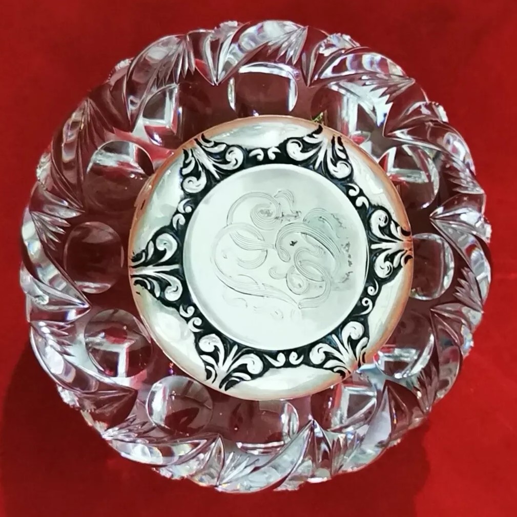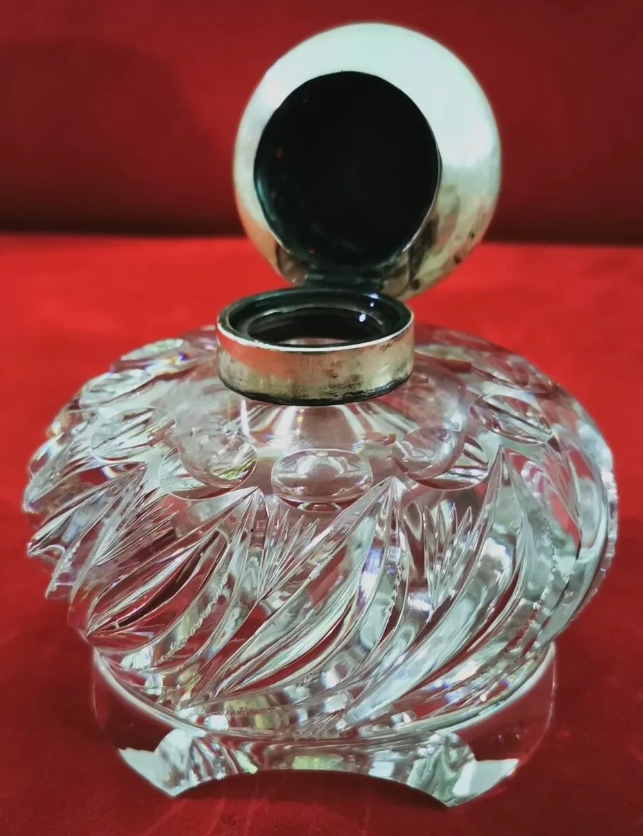 A cut crystal inkwell with a hinged sterling silver lid that is monogrammed.