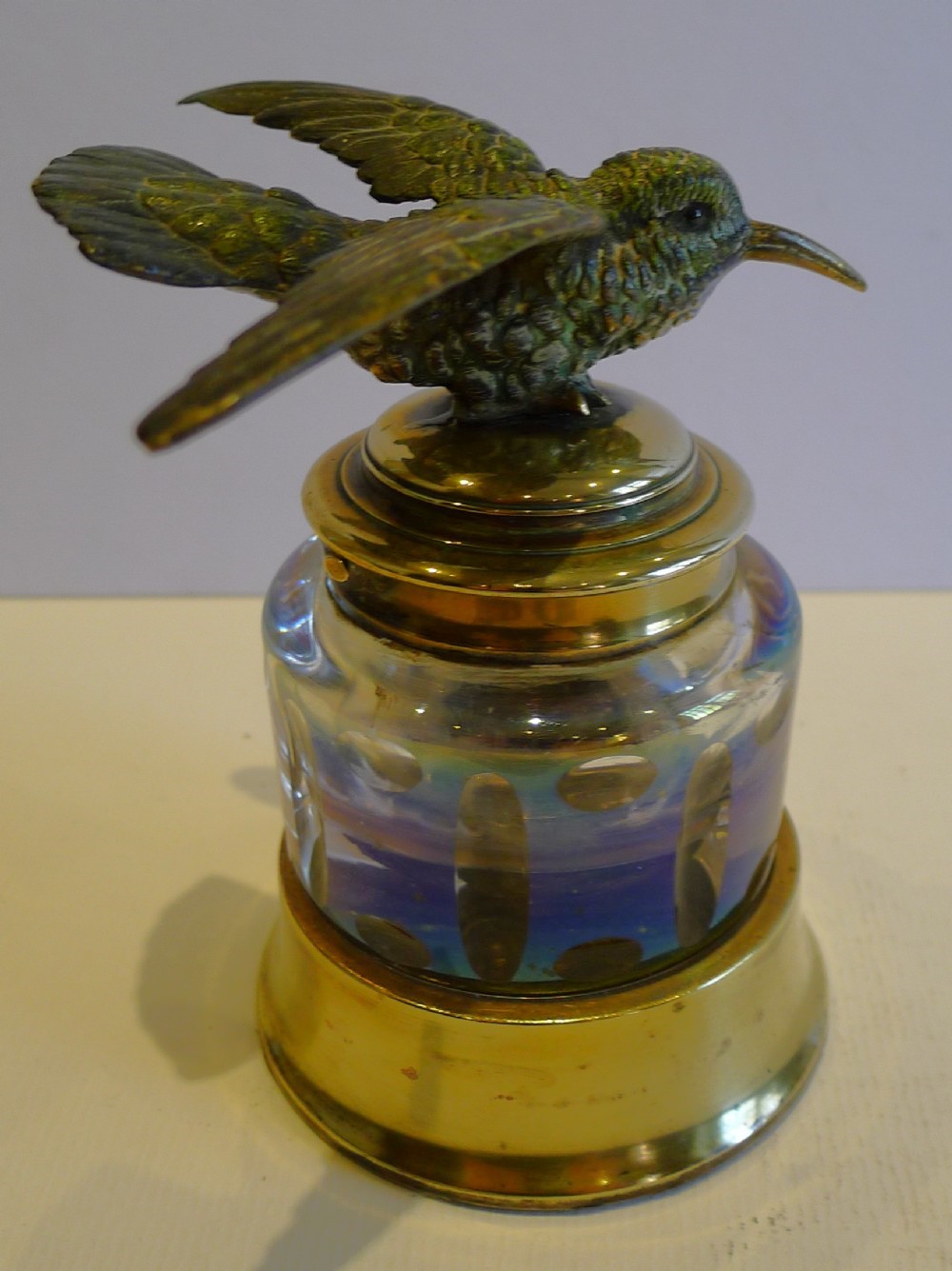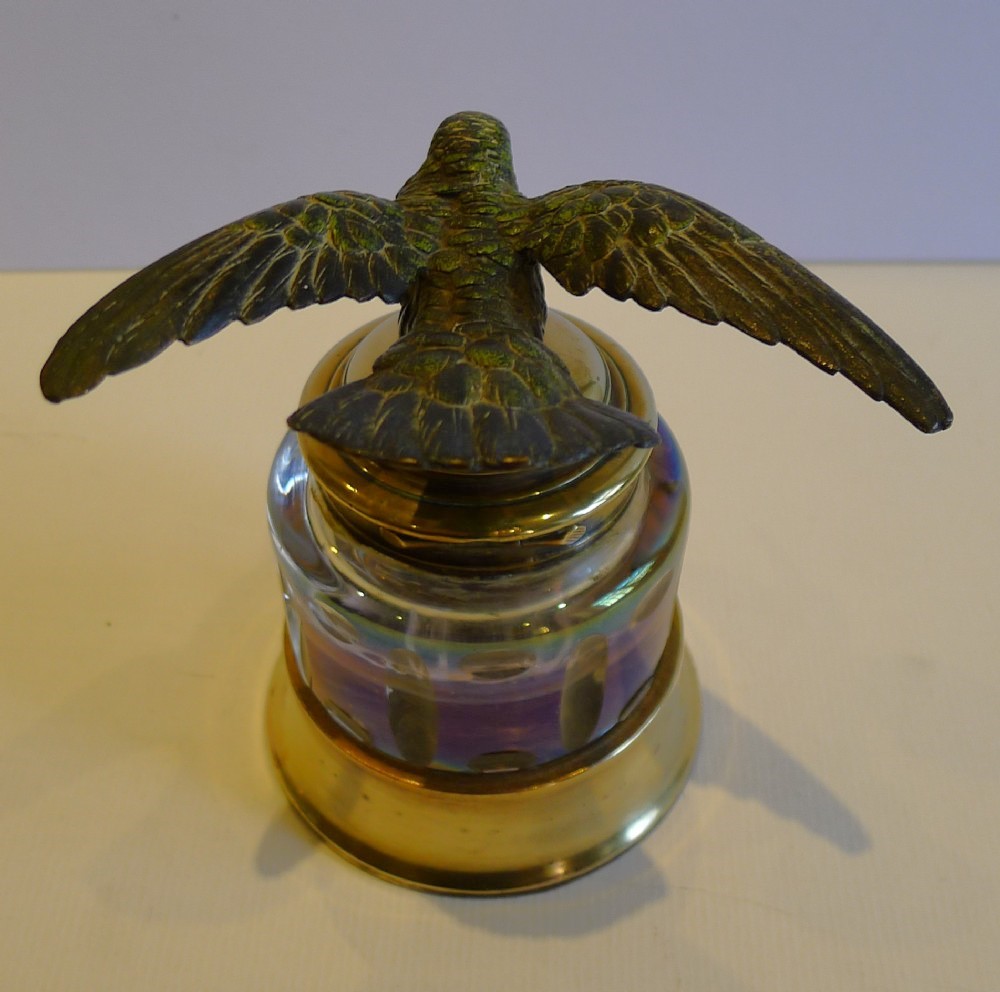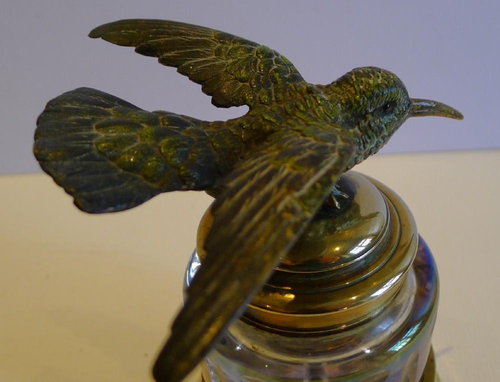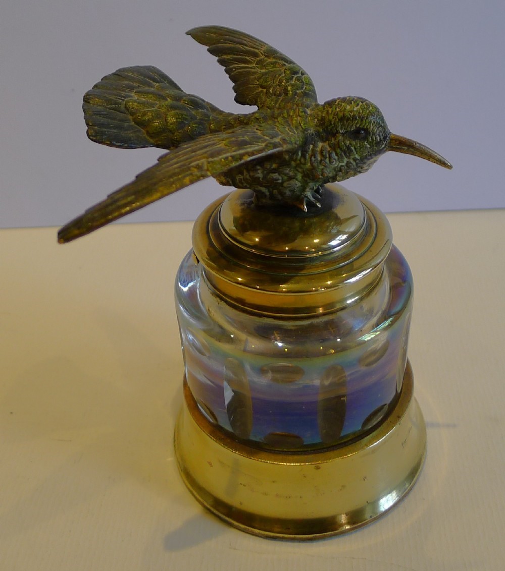 This cut-glass inkwell, set in a brass base, is made from iridescent glass, which shows an array of colors. The collar and lid are also made from polished brass. On top sits a cold painted Austrian bronze bird in flight. The bird has tiny inset eyes.