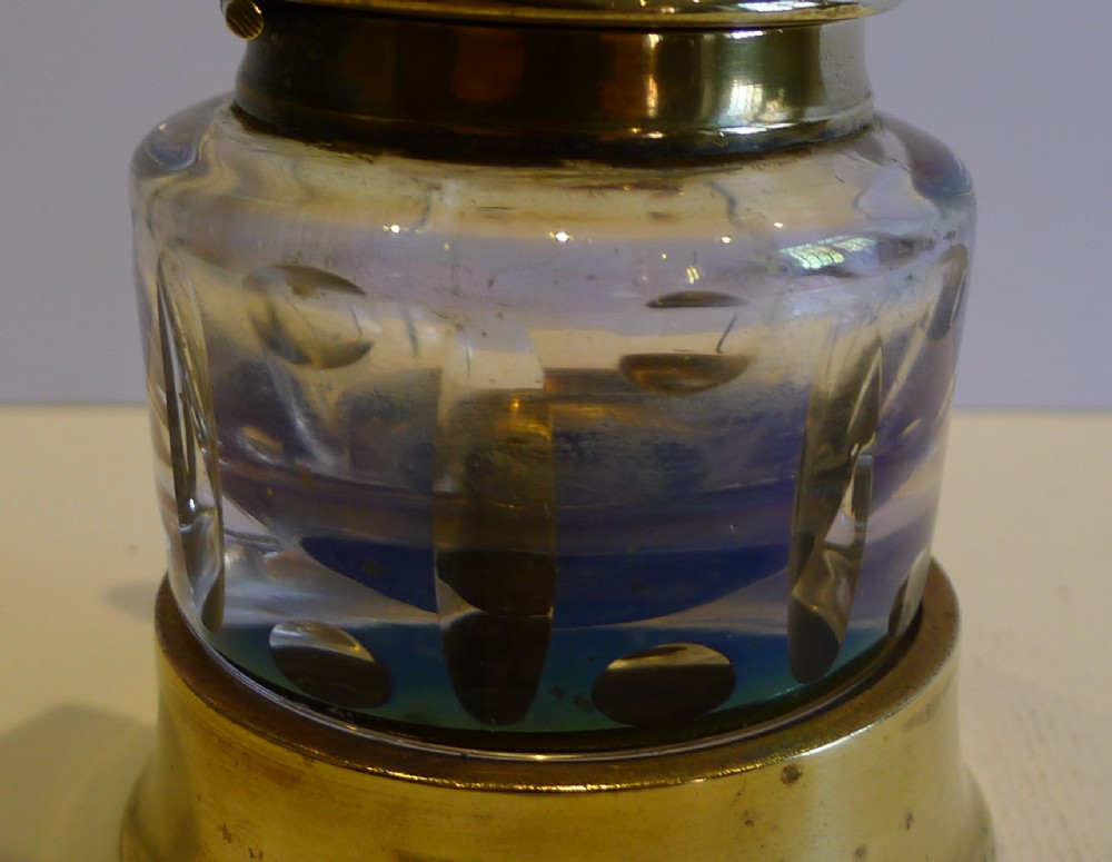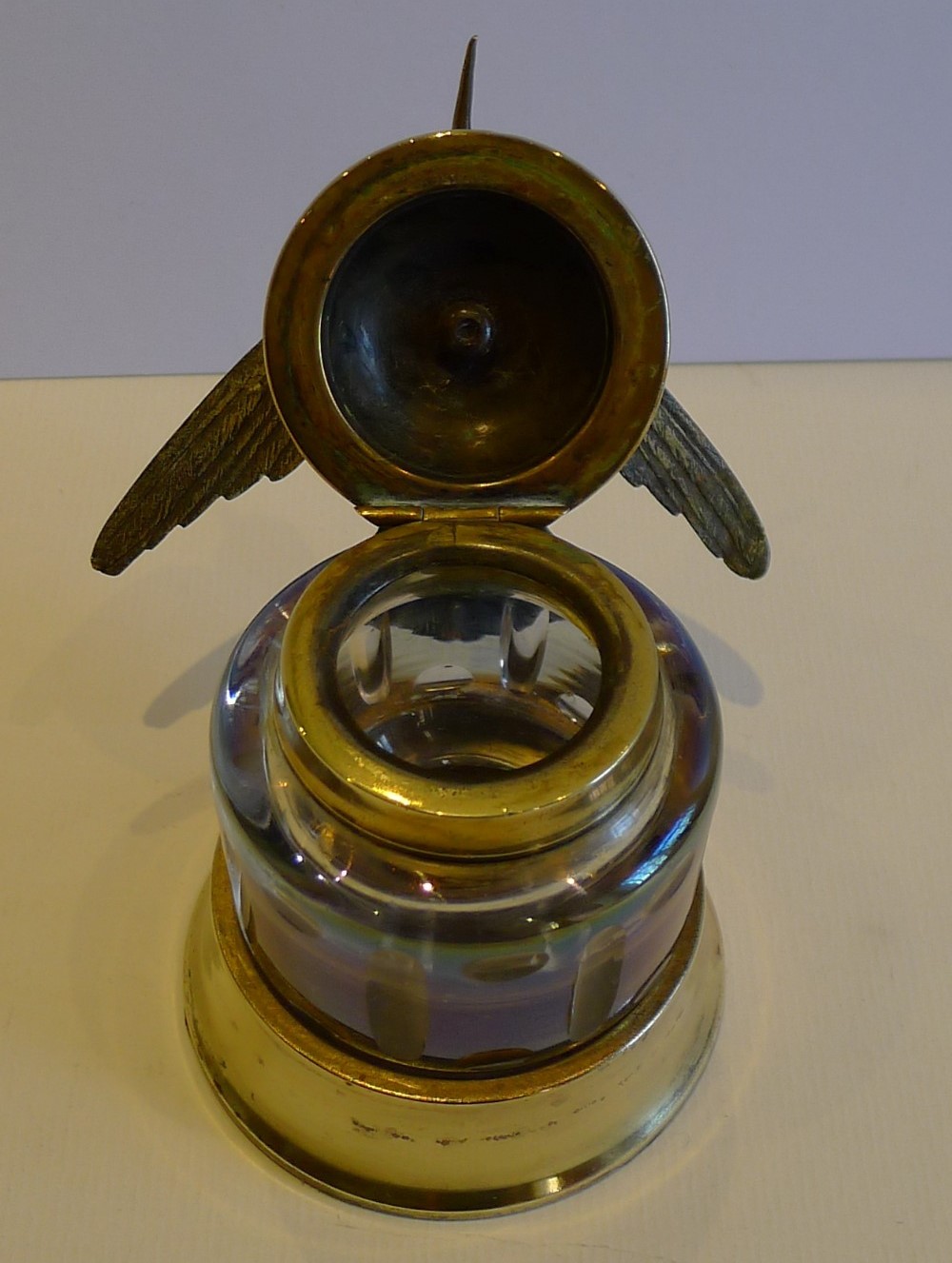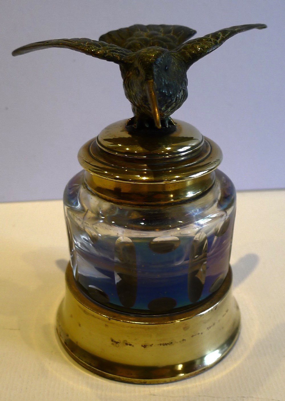 This cut-glass inkwell, set in a brass base, is made from iridescent glass, which shows an array of colors. The collar and lid are also made from polished brass. On top sits a cold painted Austrian bronze bird in flight. The bird has tiny inset eyes.