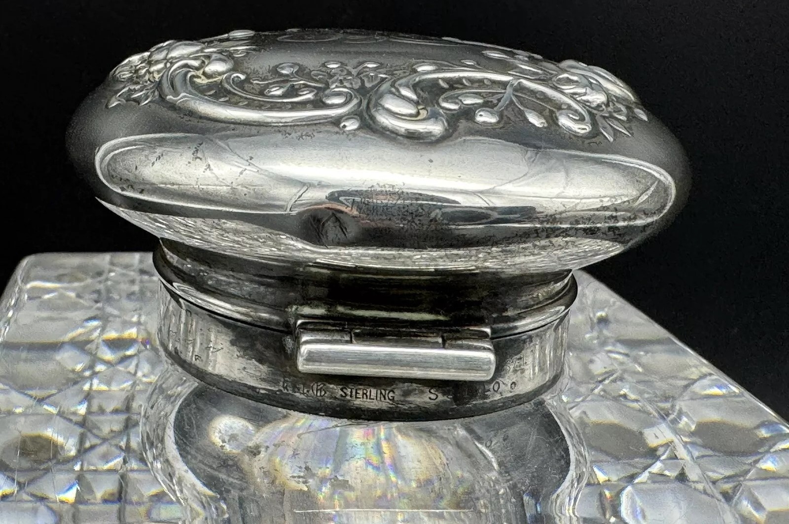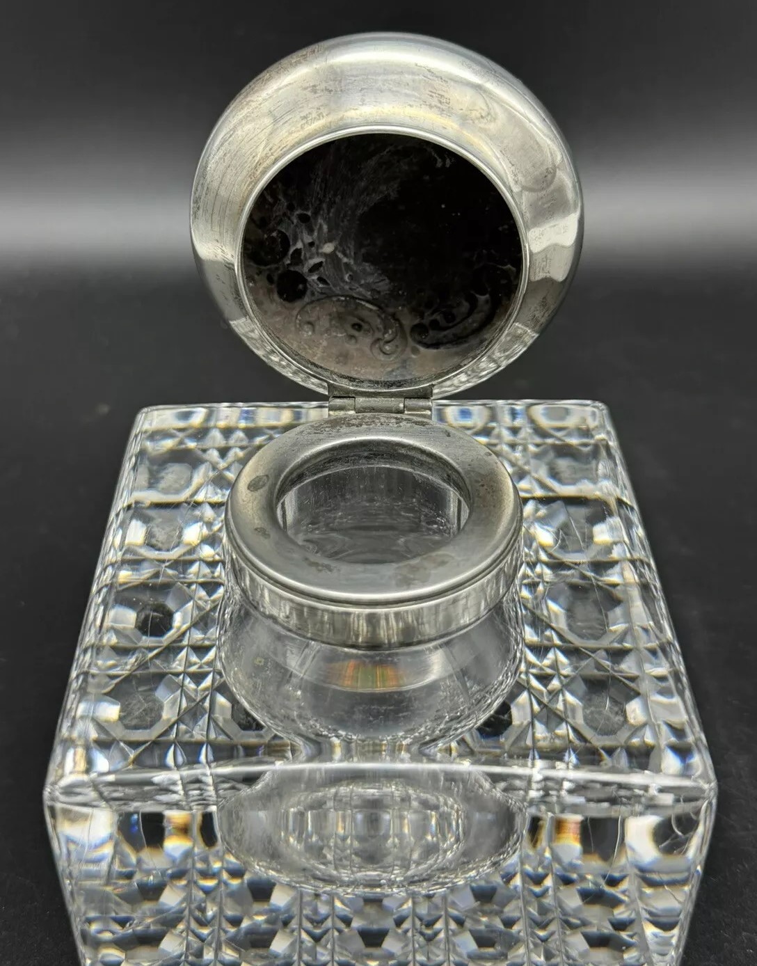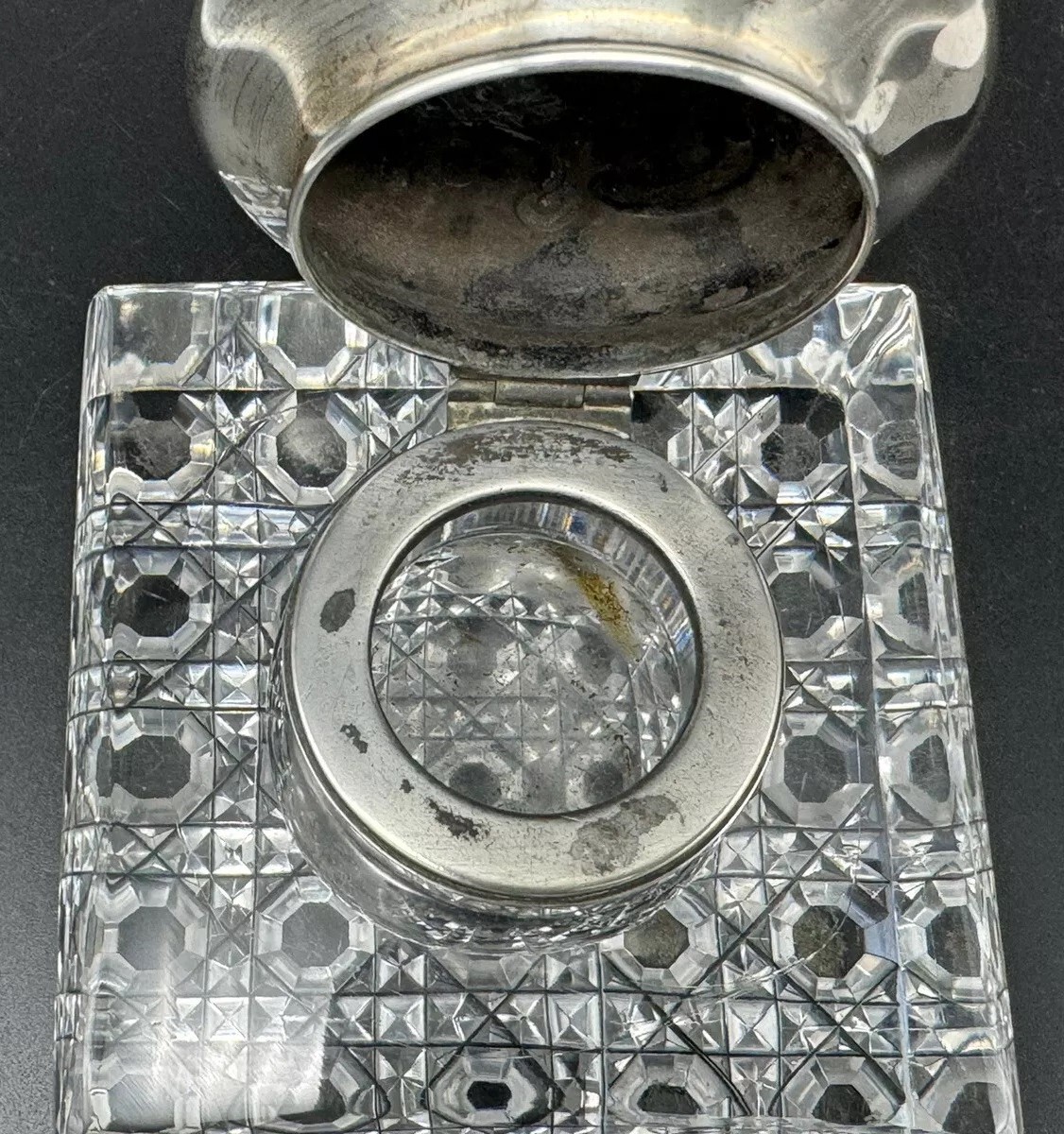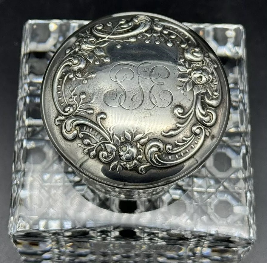 A cut glass inkwell with a square shape and faceted sides, featuring an arrangement of diamond and triangular facets in a repetitive design. The Gorham sterling silver lid is engraved with a monogram. The inkwell is marked “Sterling” and with 19th-century Gorham hallmarks.