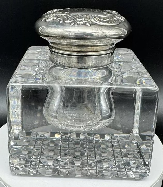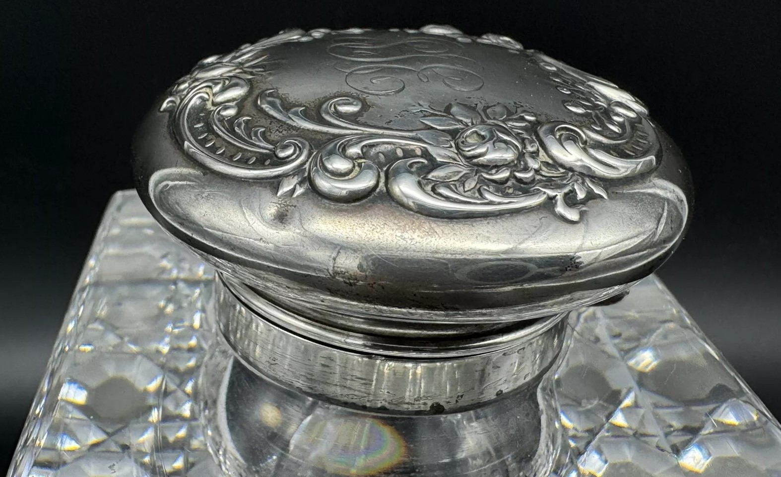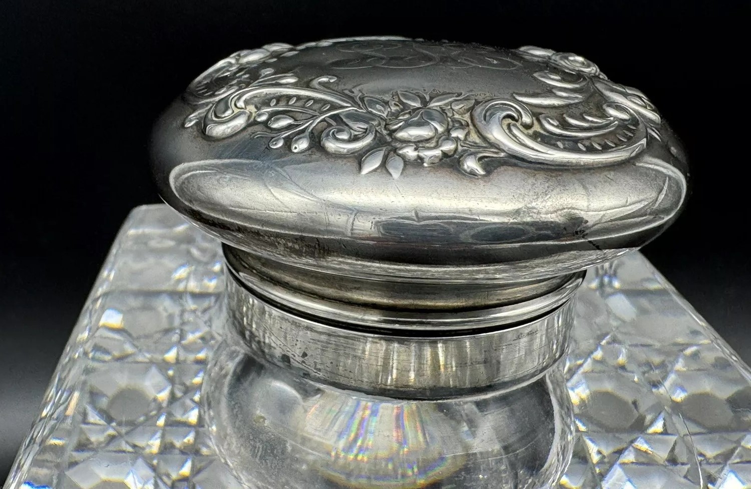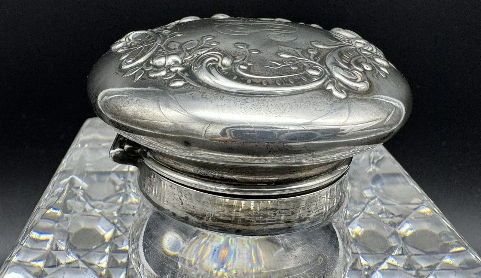 A cut glass inkwell with a square shape and faceted sides, featuring an arrangement of diamond and triangular facets in a repetitive design. The Gorham sterling silver lid is engraved with a monogram. The inkwell is marked “Sterling” and with 19th-century Gorham hallmarks.