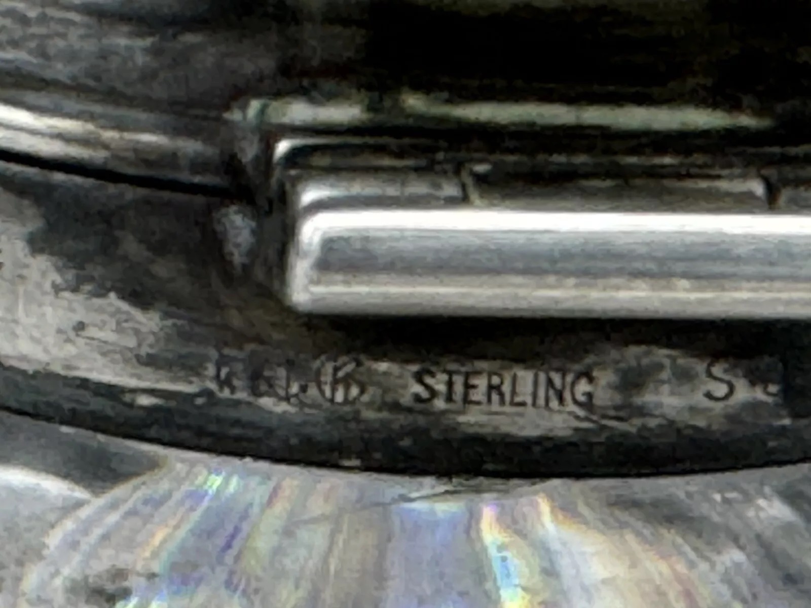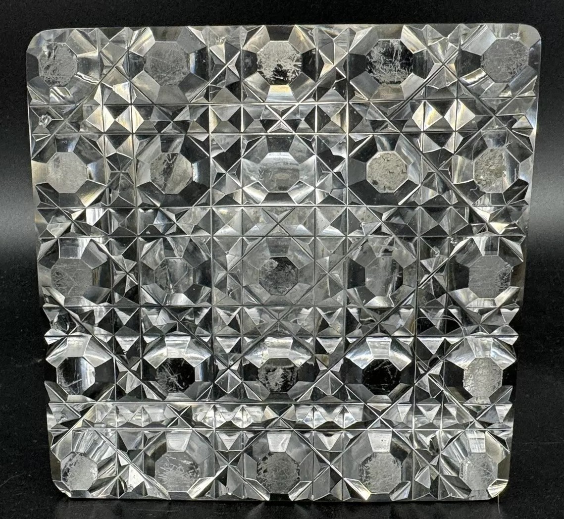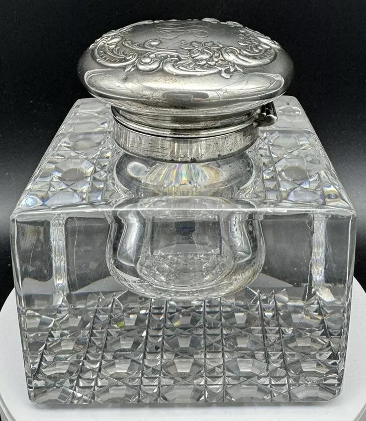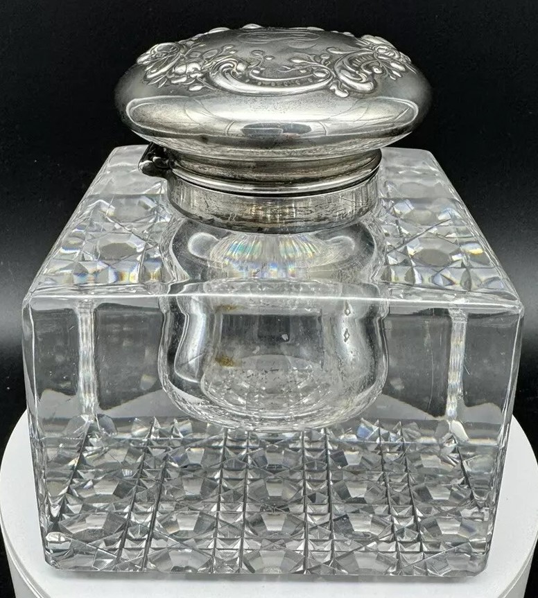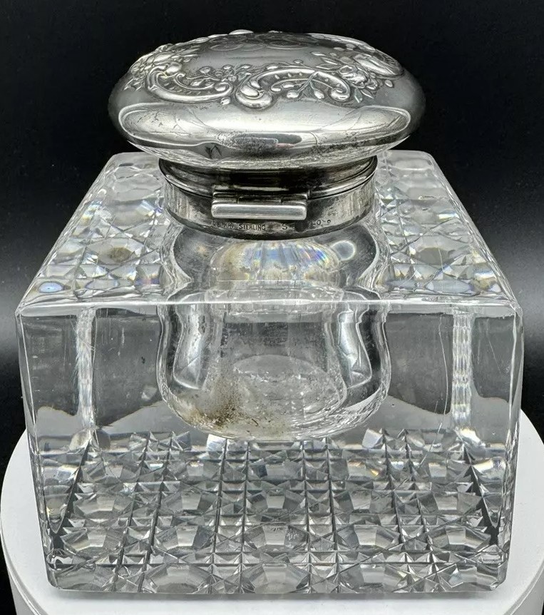 A cut glass inkwell with a square shape and faceted sides, featuring an arrangement of diamond and triangular facets in a repetitive design. The Gorham sterling silver lid is engraved with a monogram. The inkwell is marked “Sterling” and with 19th-century Gorham hallmarks.