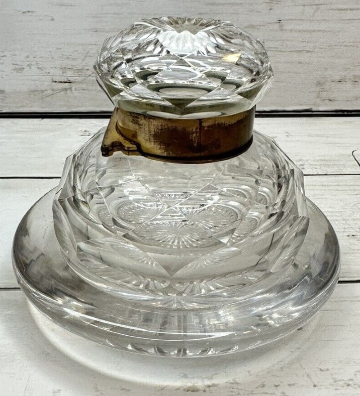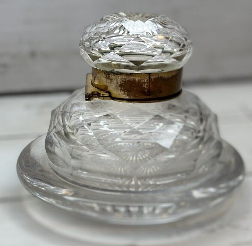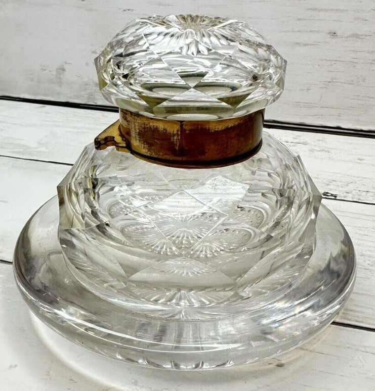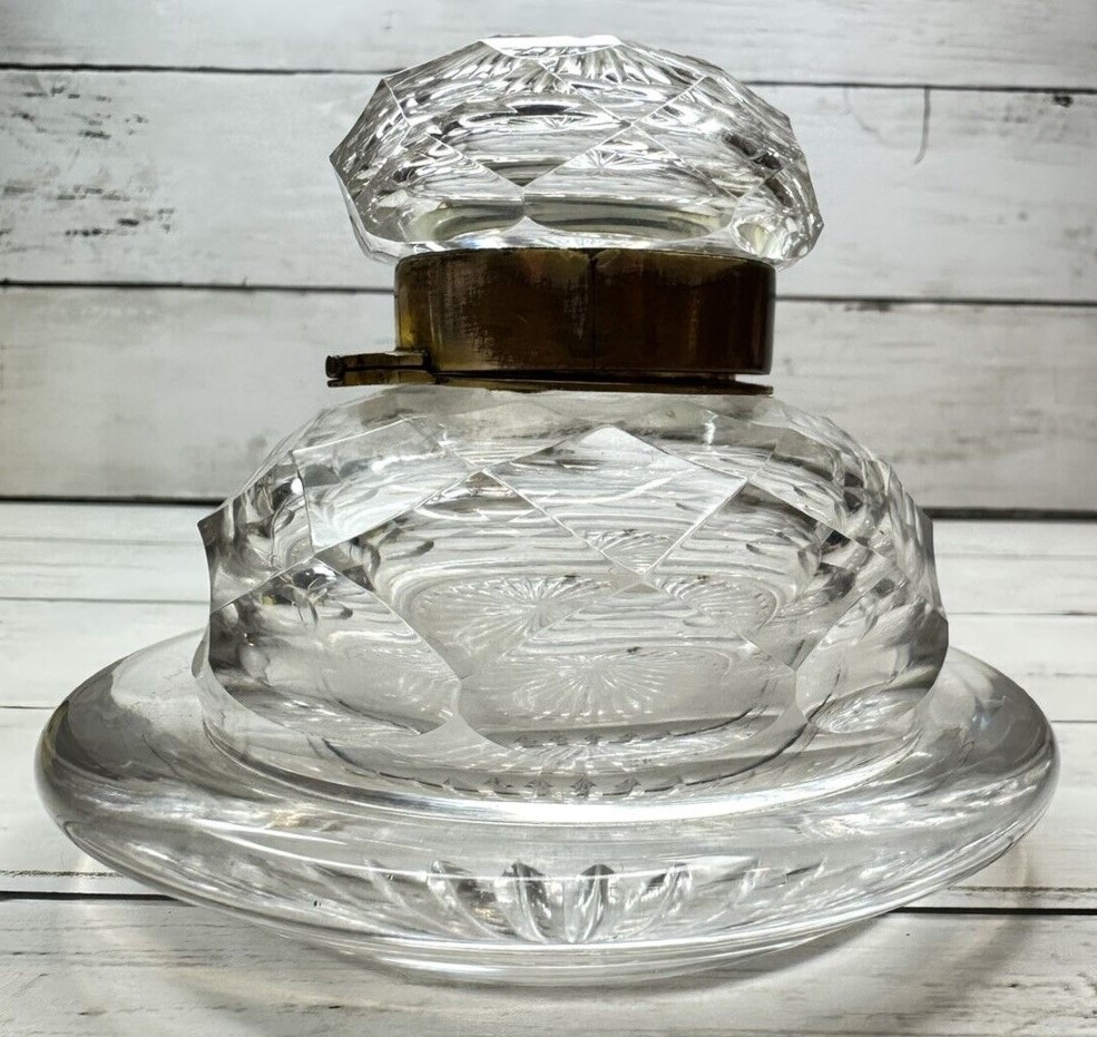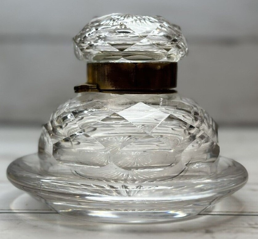 A cut-glass inkwell attached to a circular base, all with geometric patterns. Brass mounting connects the hinged lid.
