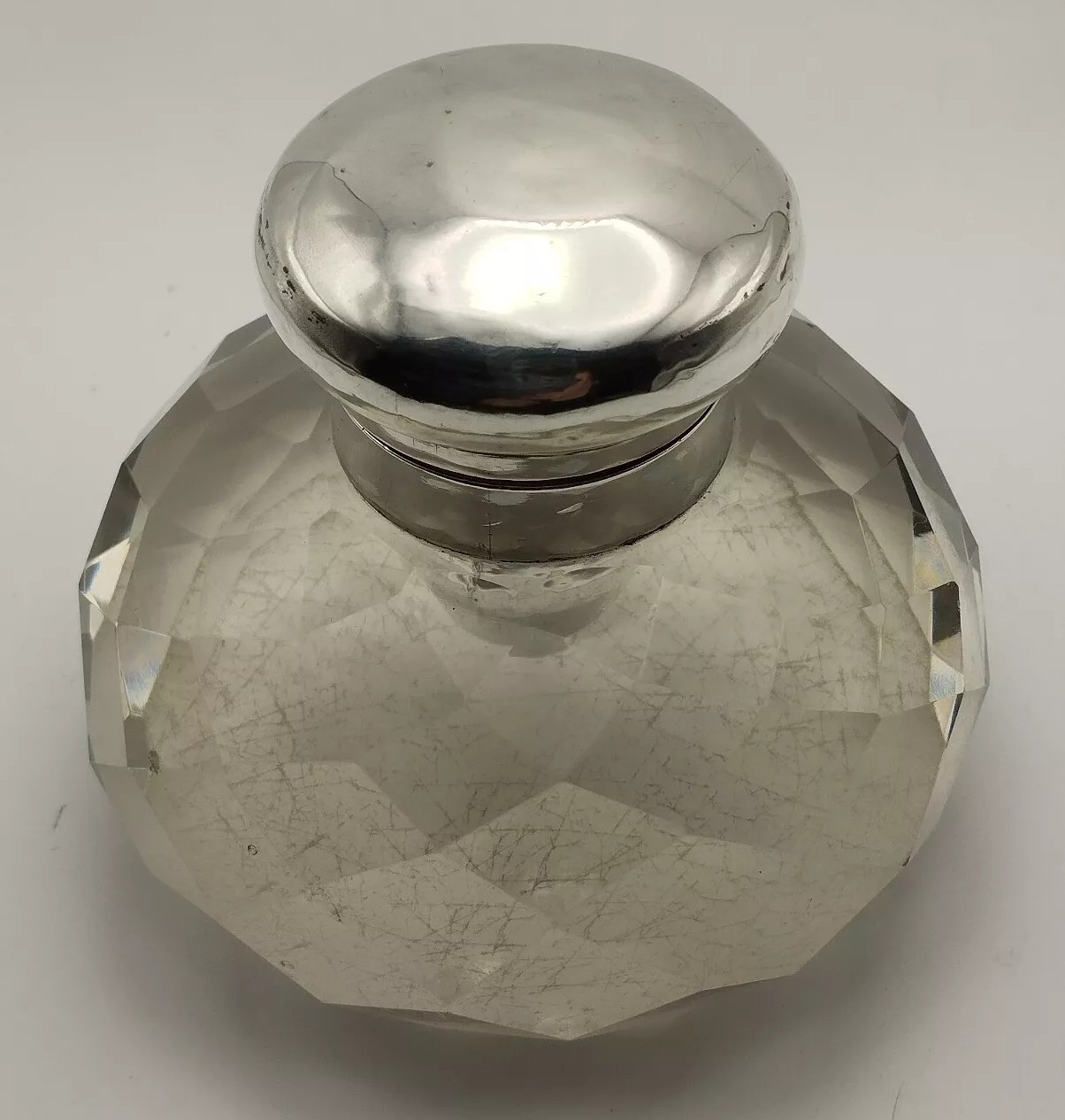 This inkwell is a combination of brilliant clear, cut glass and sterling silver.