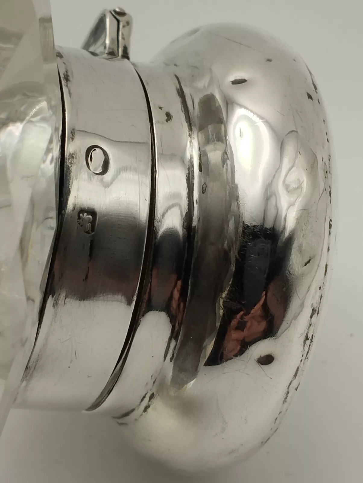- Sterling Silver: The top of the inkwell is fitted with a hinged sterling silver lid and rim. The silver is polished and has a smooth surface, providing a striking contrast to the textured glass. The lid is connected to the rim by a simple, sturdy hinge.