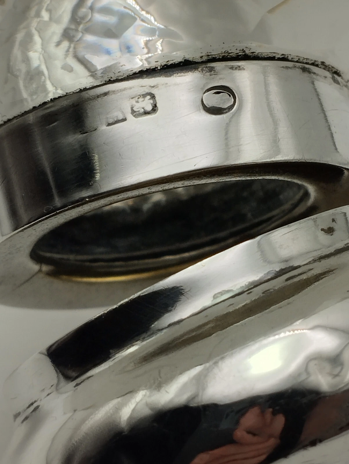 - Hallmarks: A crucial feature of this piece is the set of English hallmarks stamped on the silver. These marks provide definitive information about the inkwell’s origin and age: