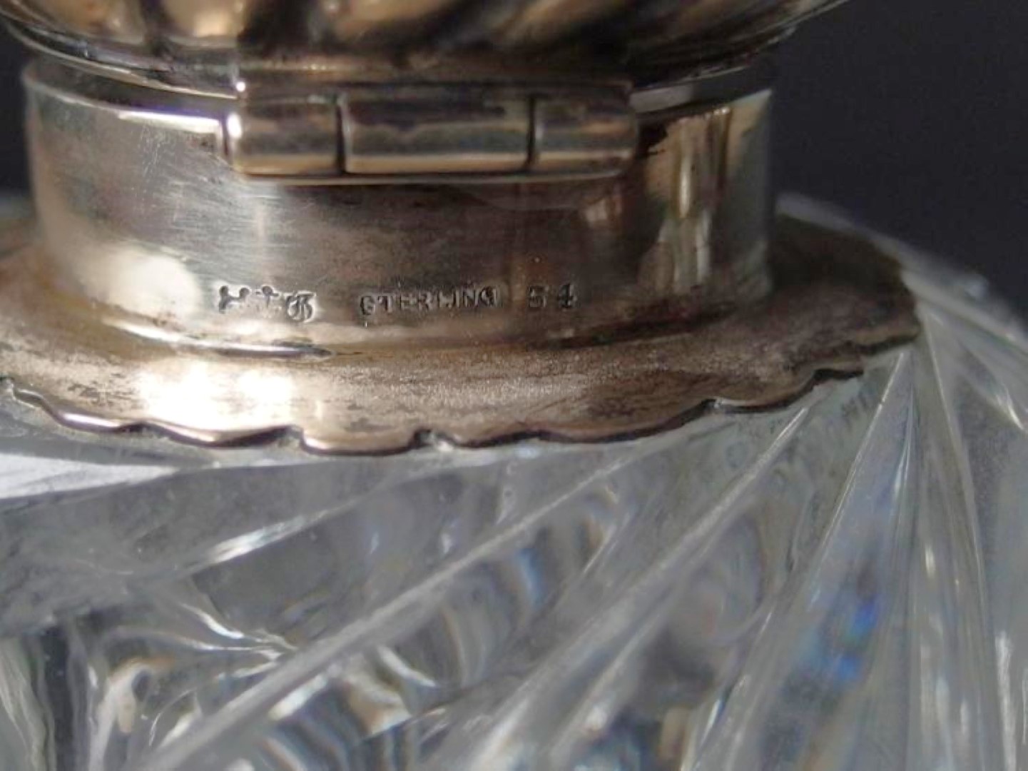 Gorham sterling silver lidded inkwell with a cut glass base and glass insert. The silver lid and the glass base feature complementary swirled patterns. The sterling silver top is marked Gorham.