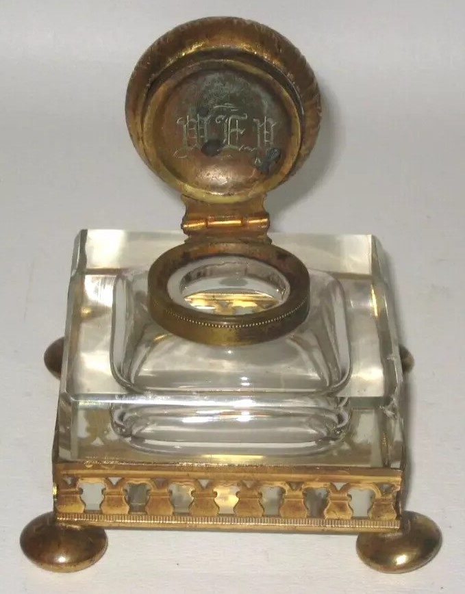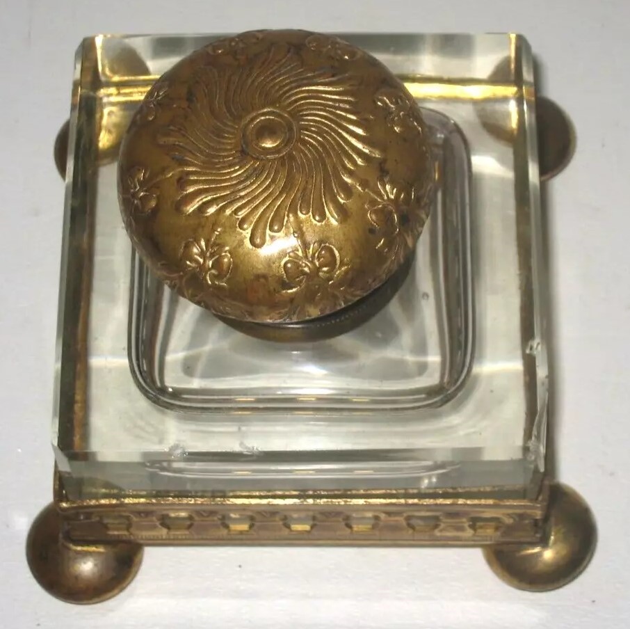 A square cut glass inkwell with beveled edges sits within a brass base with colonnade edging and bun feet. The hinged, dome-shaped brass lid has a raised repoussé pattern that radiates from the center, resembling a sunburst or fireworks. The inside of the lid is monogrammed.