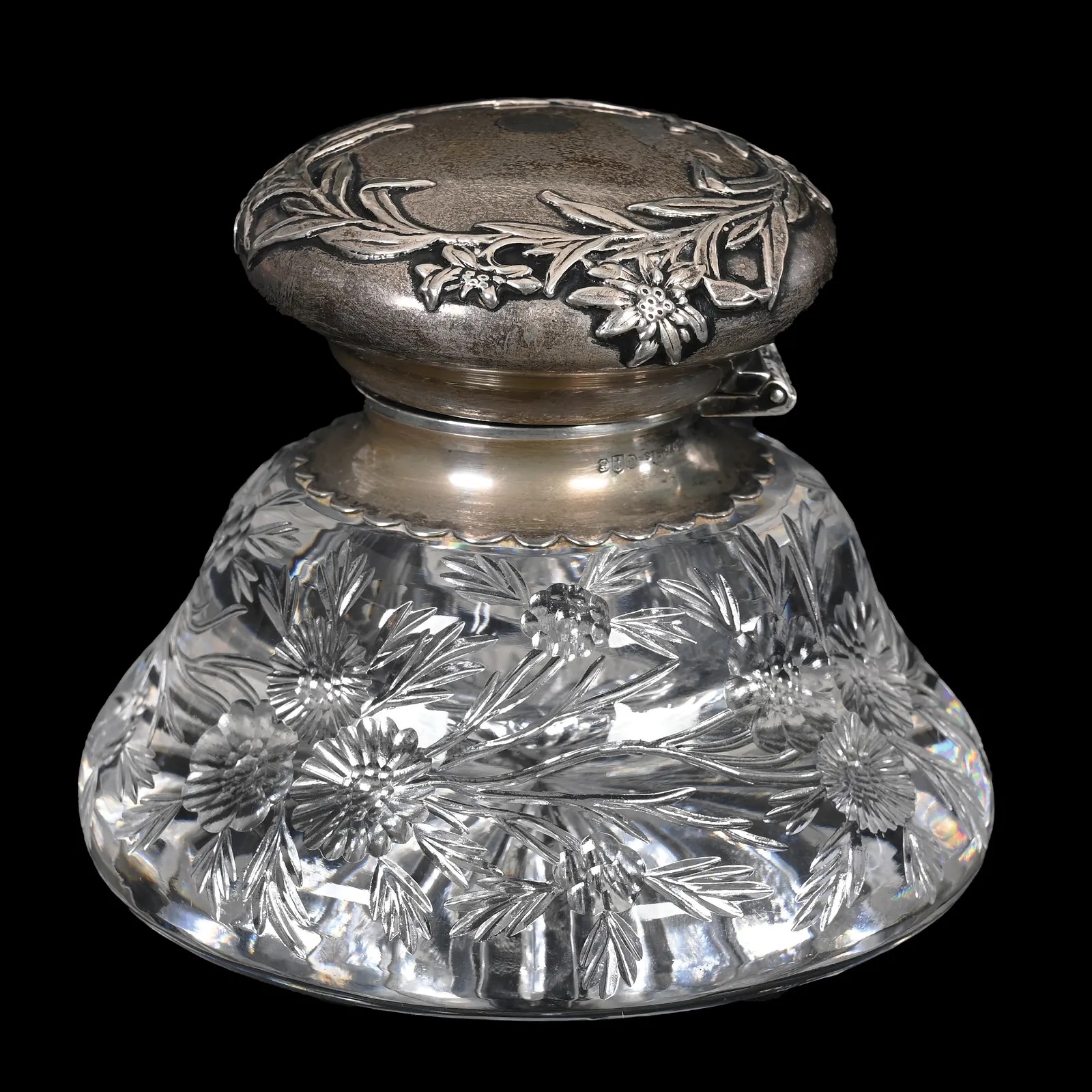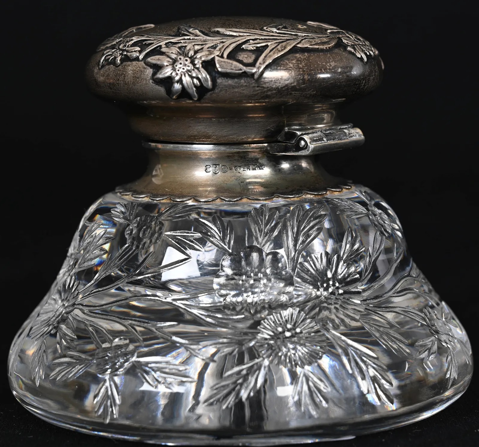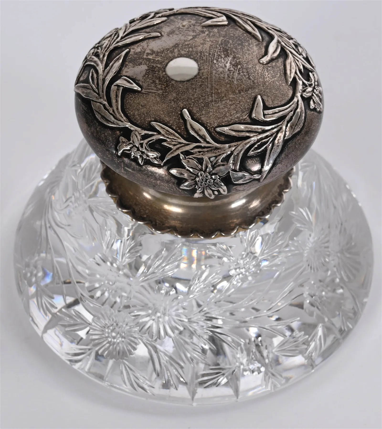 American Billiant cut glass inkwell with engraved branch and blossom. Starburst pattern on the bottom. Gorham sterling silver hinged lid marked “Sterling D714”.
