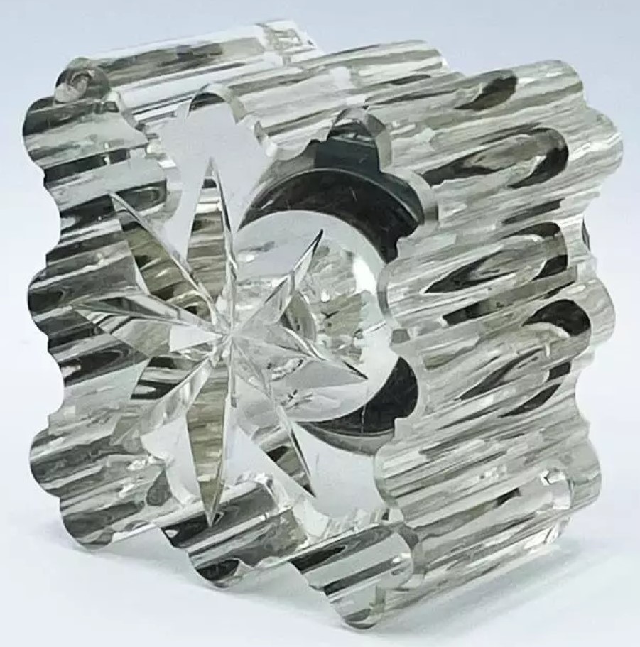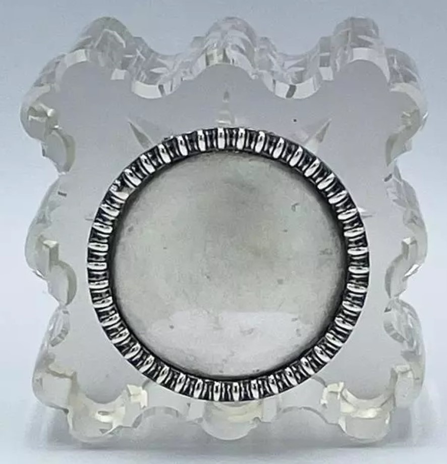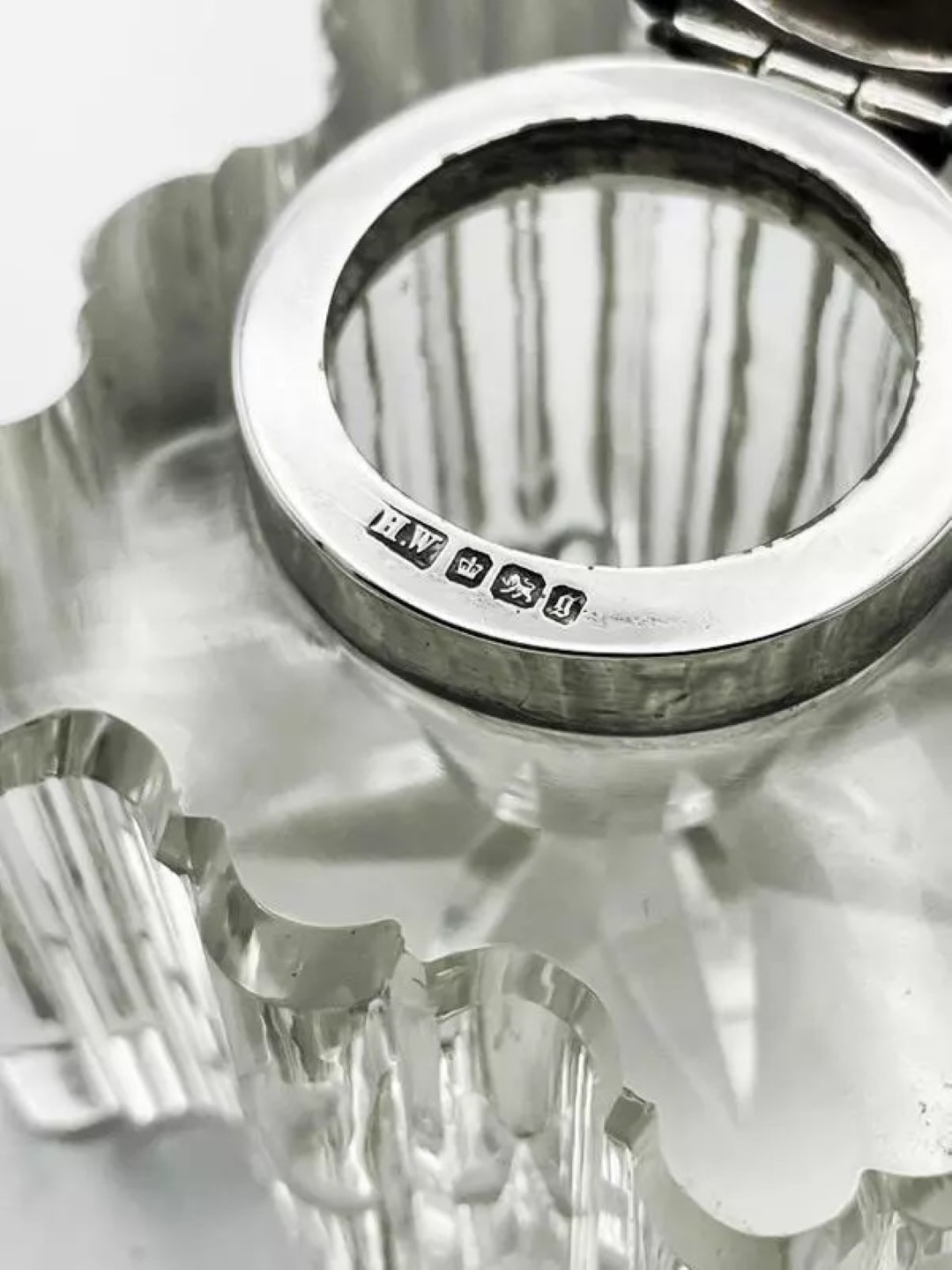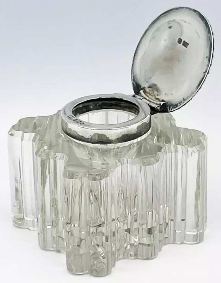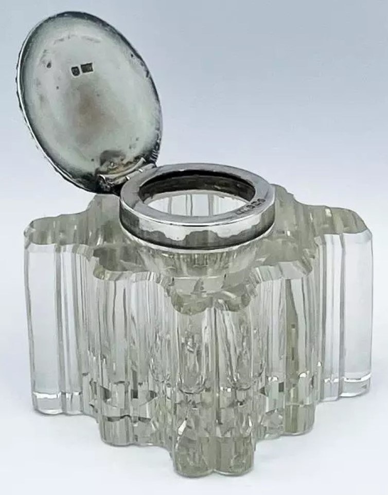 This cut-glass inkwell features an intricate design with cylindrical edges multiple facets that reflect light beautifully. The sterling silver lid is adorned with a patterned border. Marks: maker HW (Henry Wigfull), Sheffield assay office, lion silver mark, date letter “g” for the year 1899.