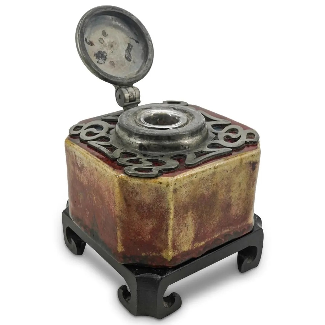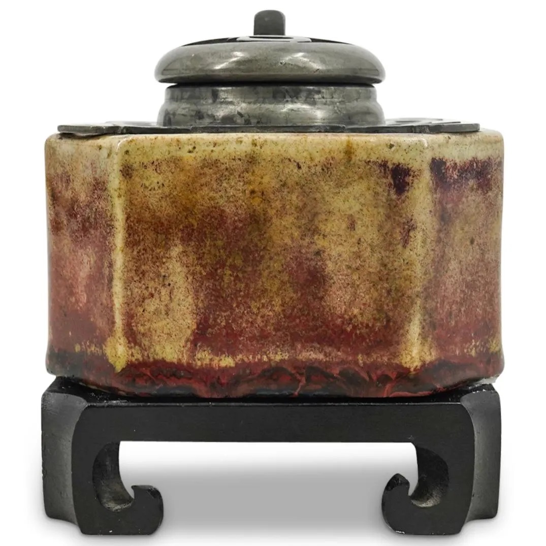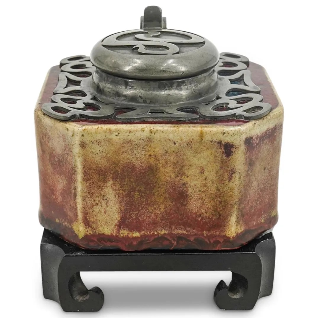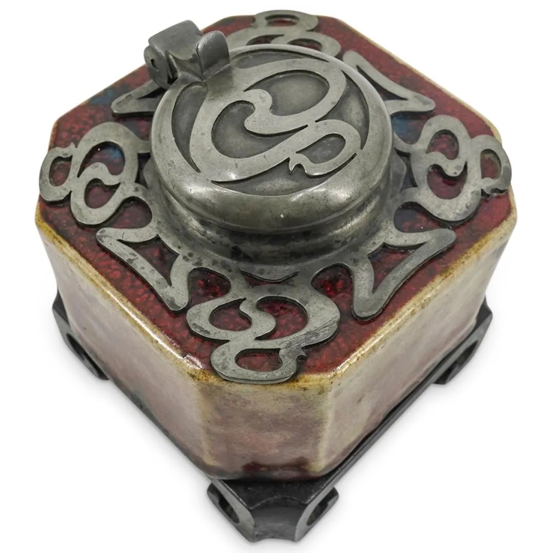 Art Nouveau octagonal stoneware inkwell by Pierre-Adrien Dalpayrat featuring his characteristic polychrome glaze and adorned with a pierced pewter collar by Edward Colonna around the neck and lip. Piece is mounted on a carved wooden base.