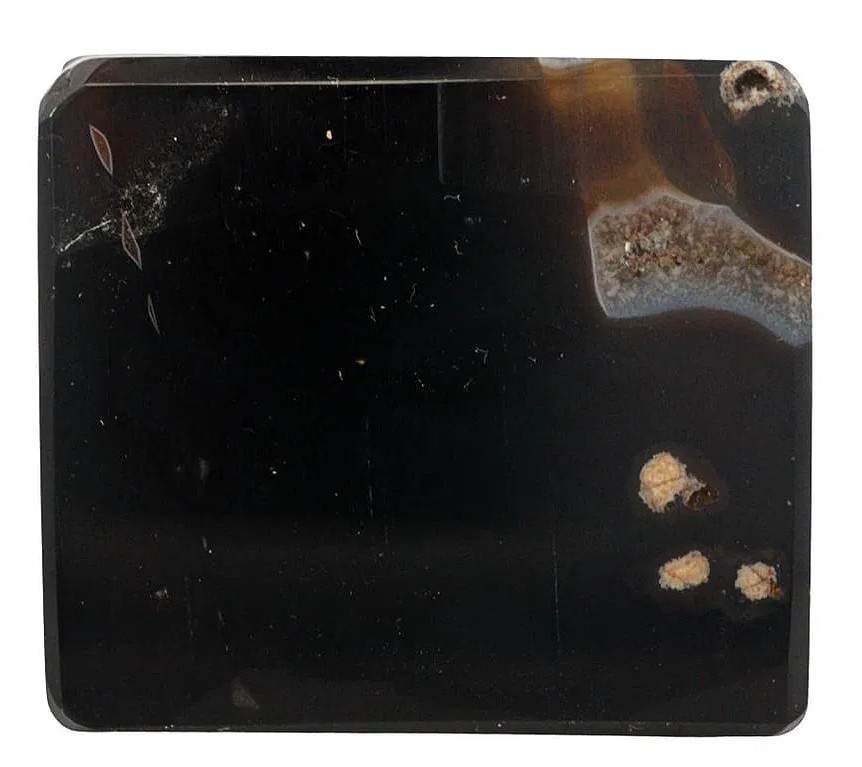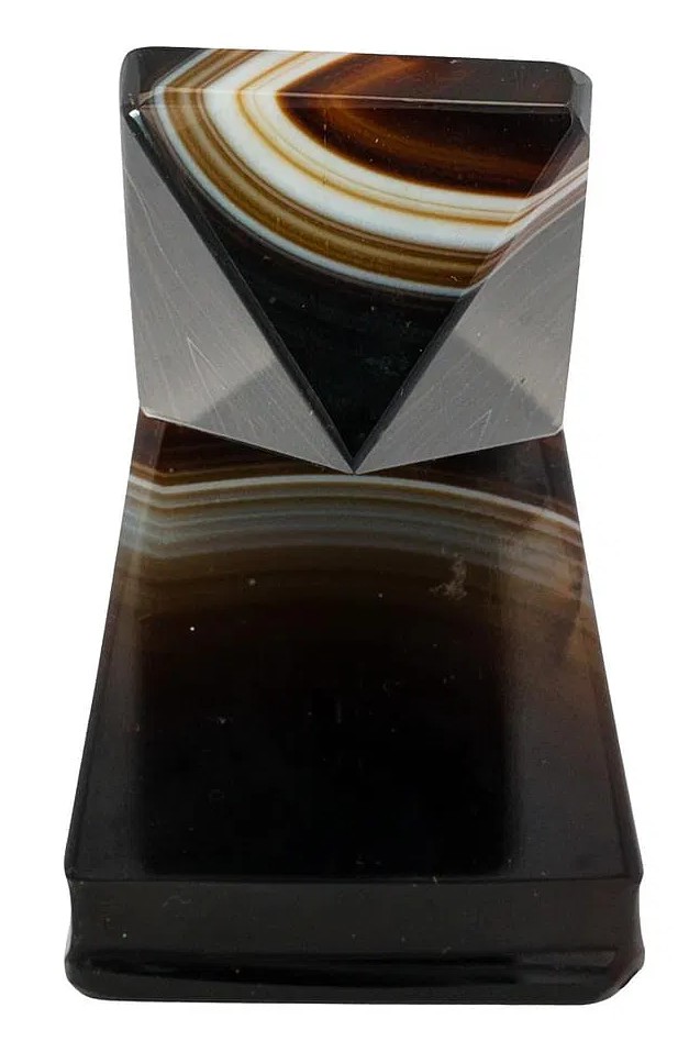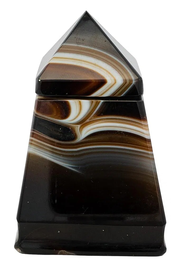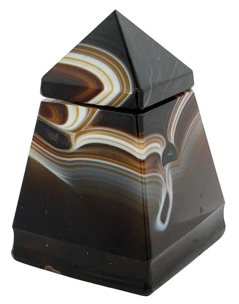 This minimalist agate inkwell showcases the natural beauty of its material. The inkwell is carved from a solid, polished piece of dark agate, a hardstone known for its subtle, natural banding. The body of the inkwell is a simple form, and the lid is carved into a symmetrical pyramid shape. The surface is polished, which brings out the subtle variations in color, ranging from deep charcoal to shades of brown and gray. The overall design is clean and geometric, with a focus on the material.