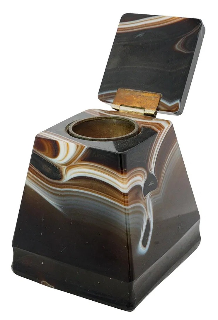 This style of inkwell, made from a carved and polished hardstone with a minimalist design, was popular during the Victorian era. The geometric, pyramid shape suggests a connection to neoclassical or Egyptian Revival artistic trends that were prominent in the 19th century.