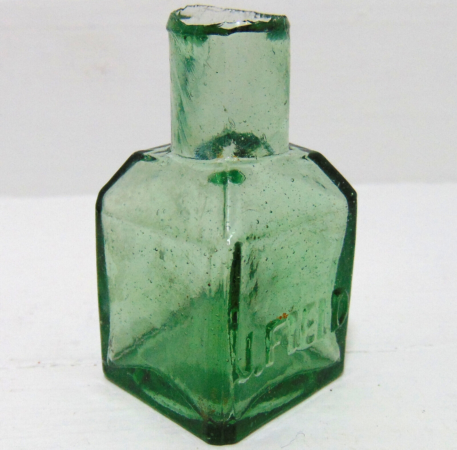 This shear-lip ink bottle is small (possibly a free sample) and a “house” type ink bottle in a darker aqua color, embossed “J. FIELD”.