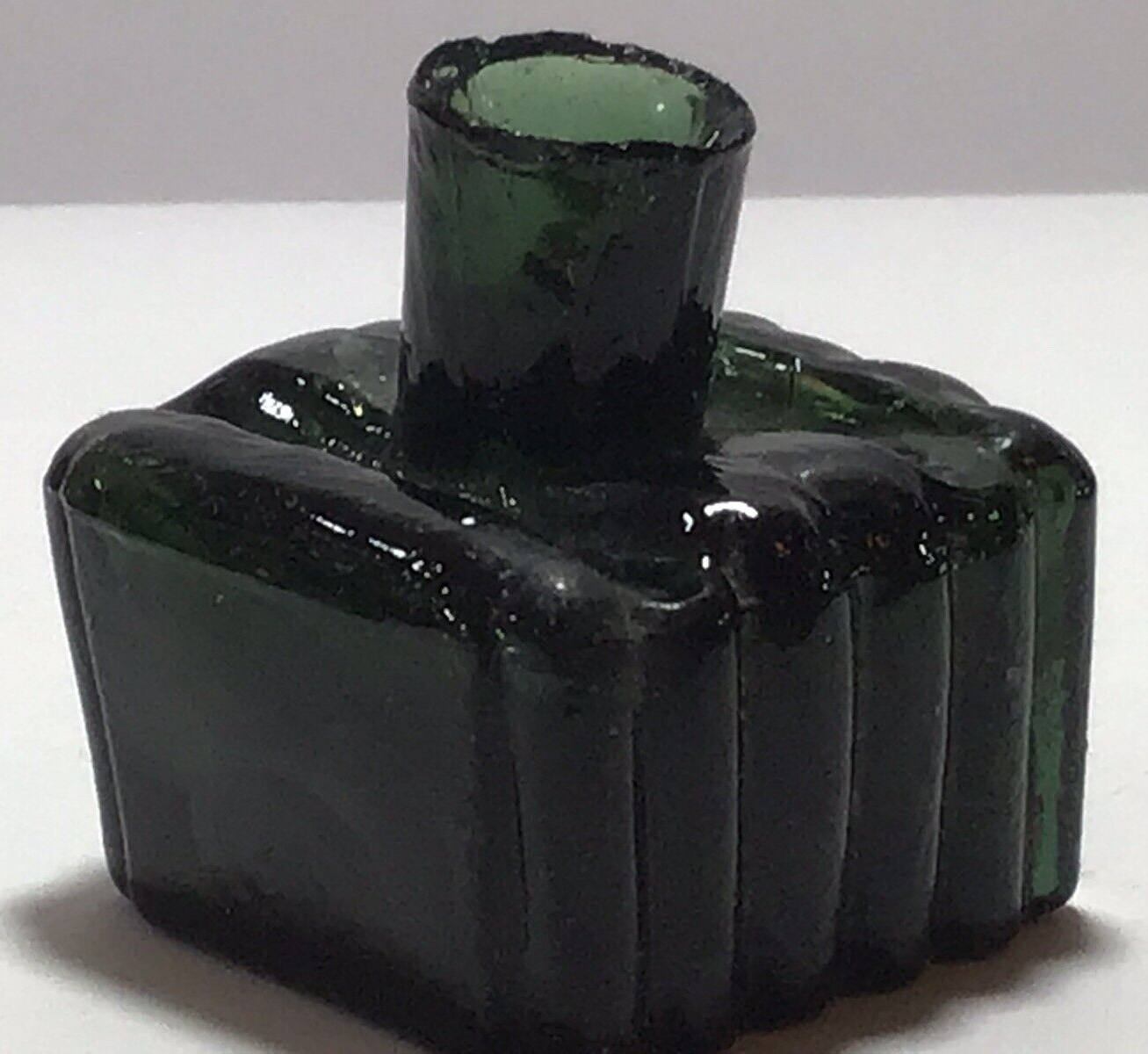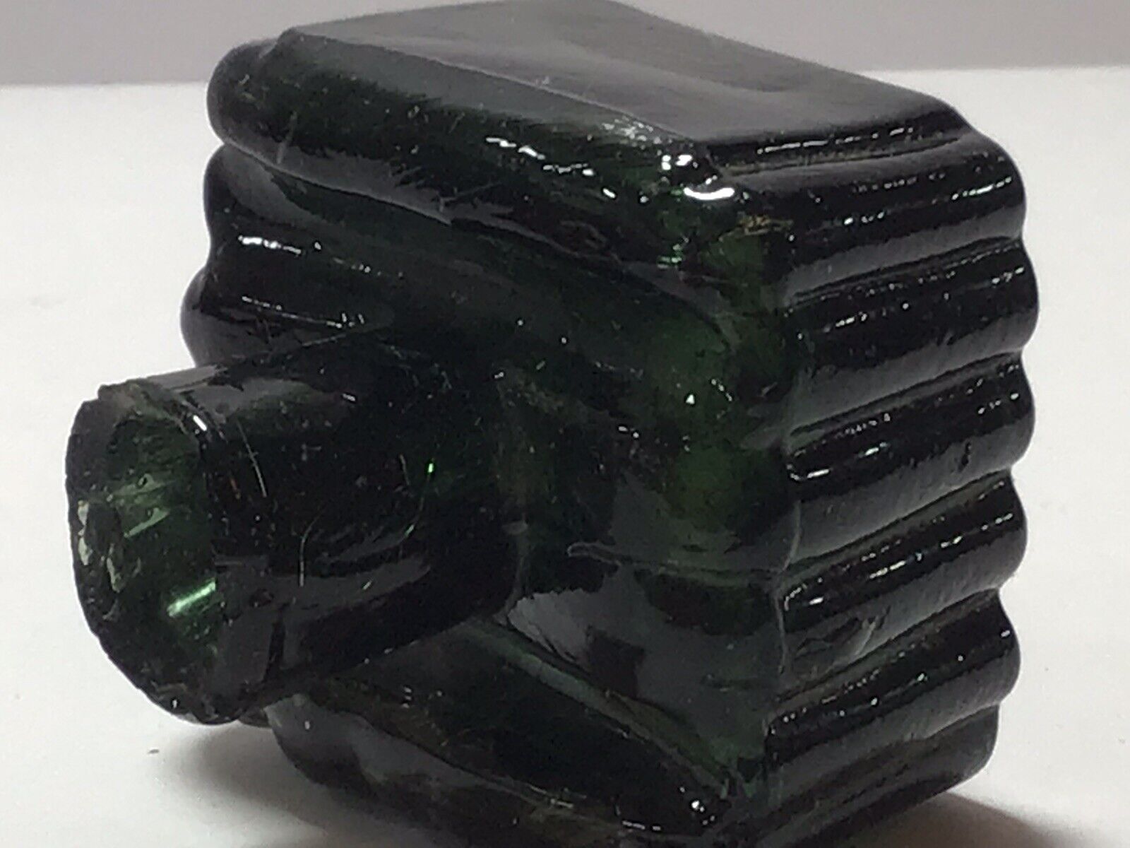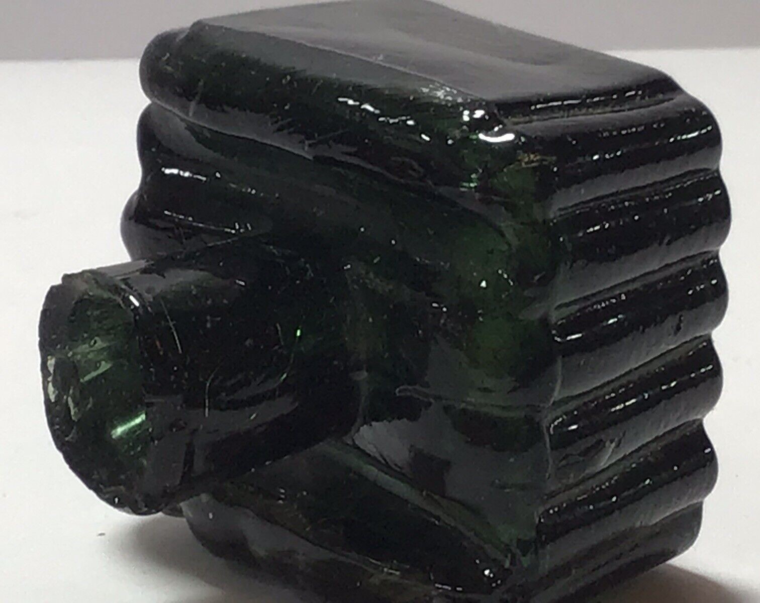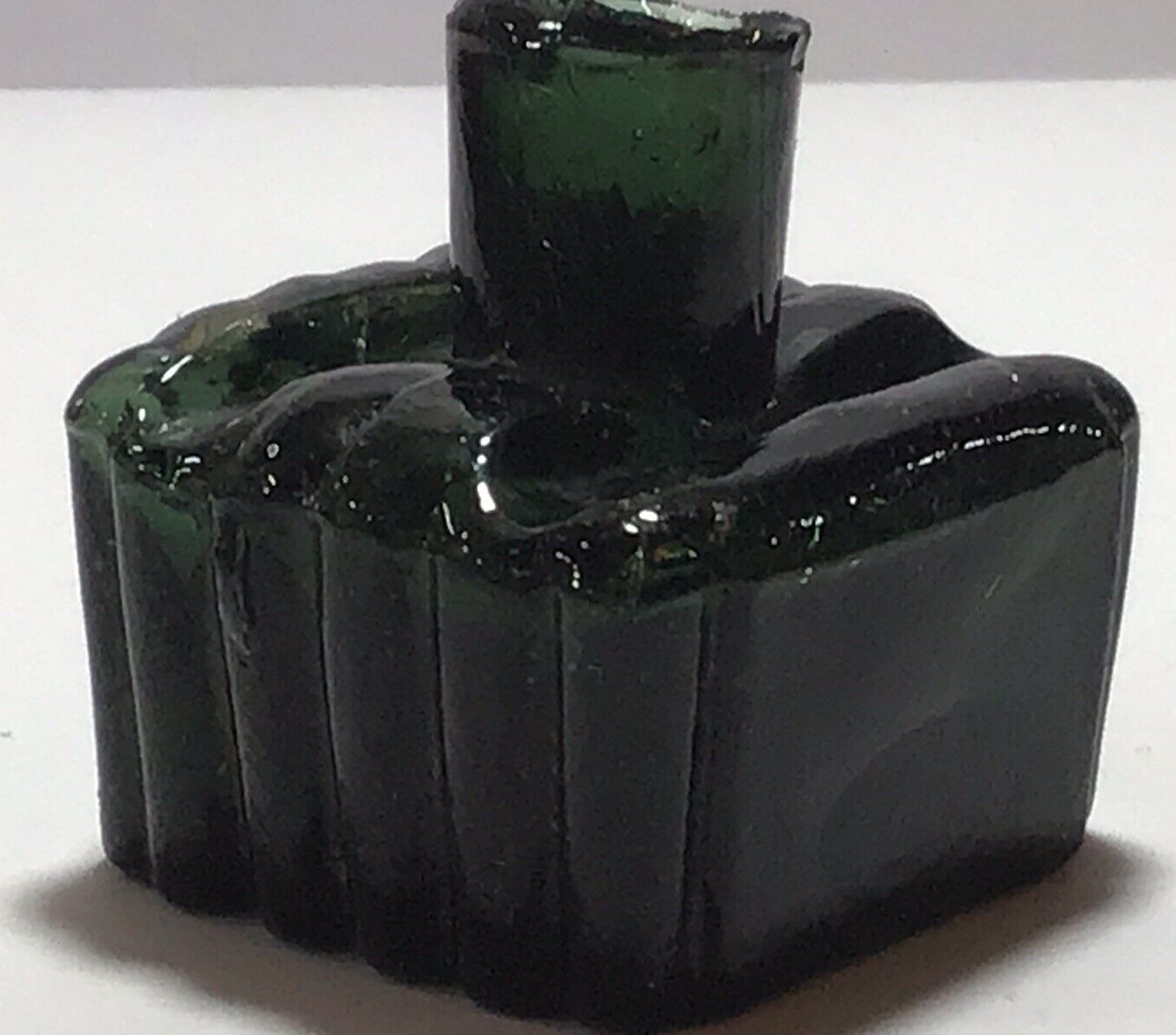 An embossed ink bottle with a sheared lip that is square shaped with three ribbed panels and one plain panel for a label. There are two pen rests on the top. The dark green color is unusual – it almost black.