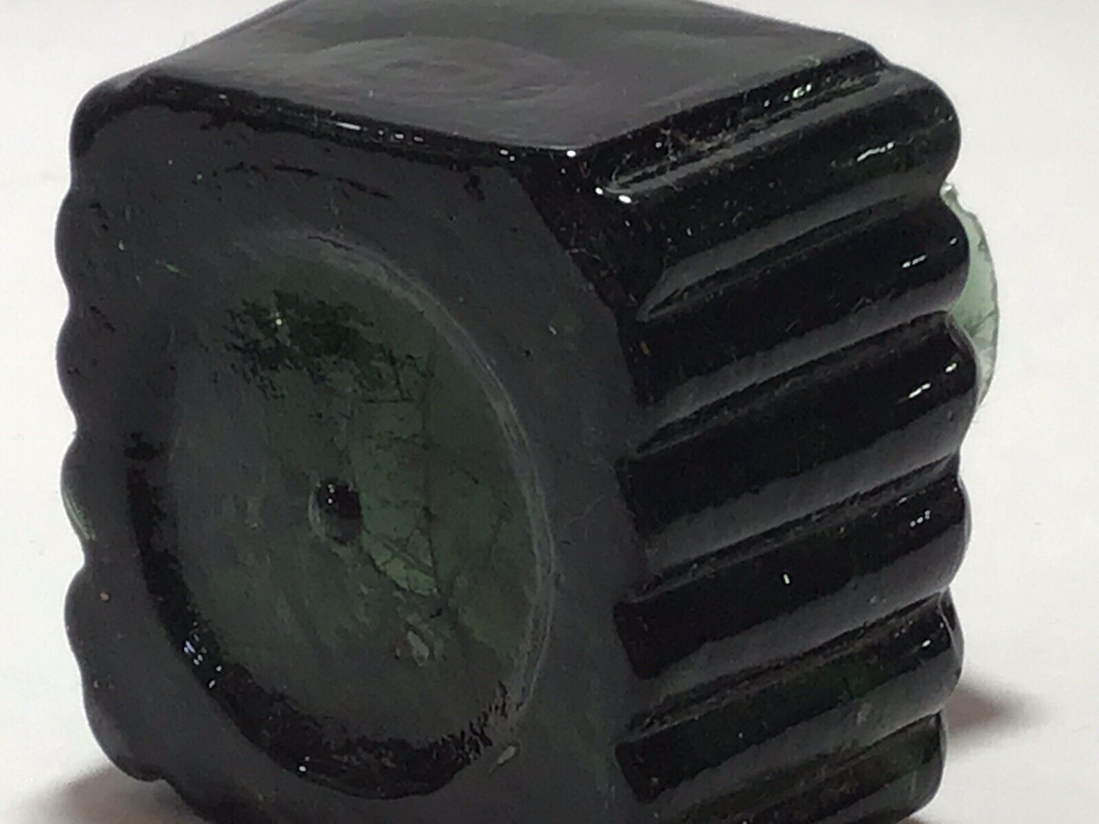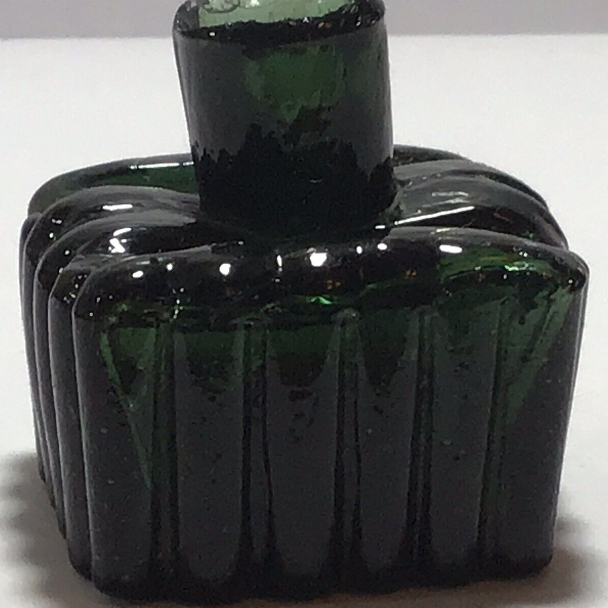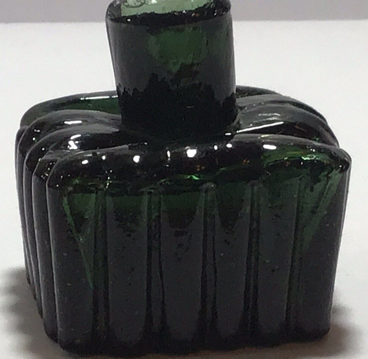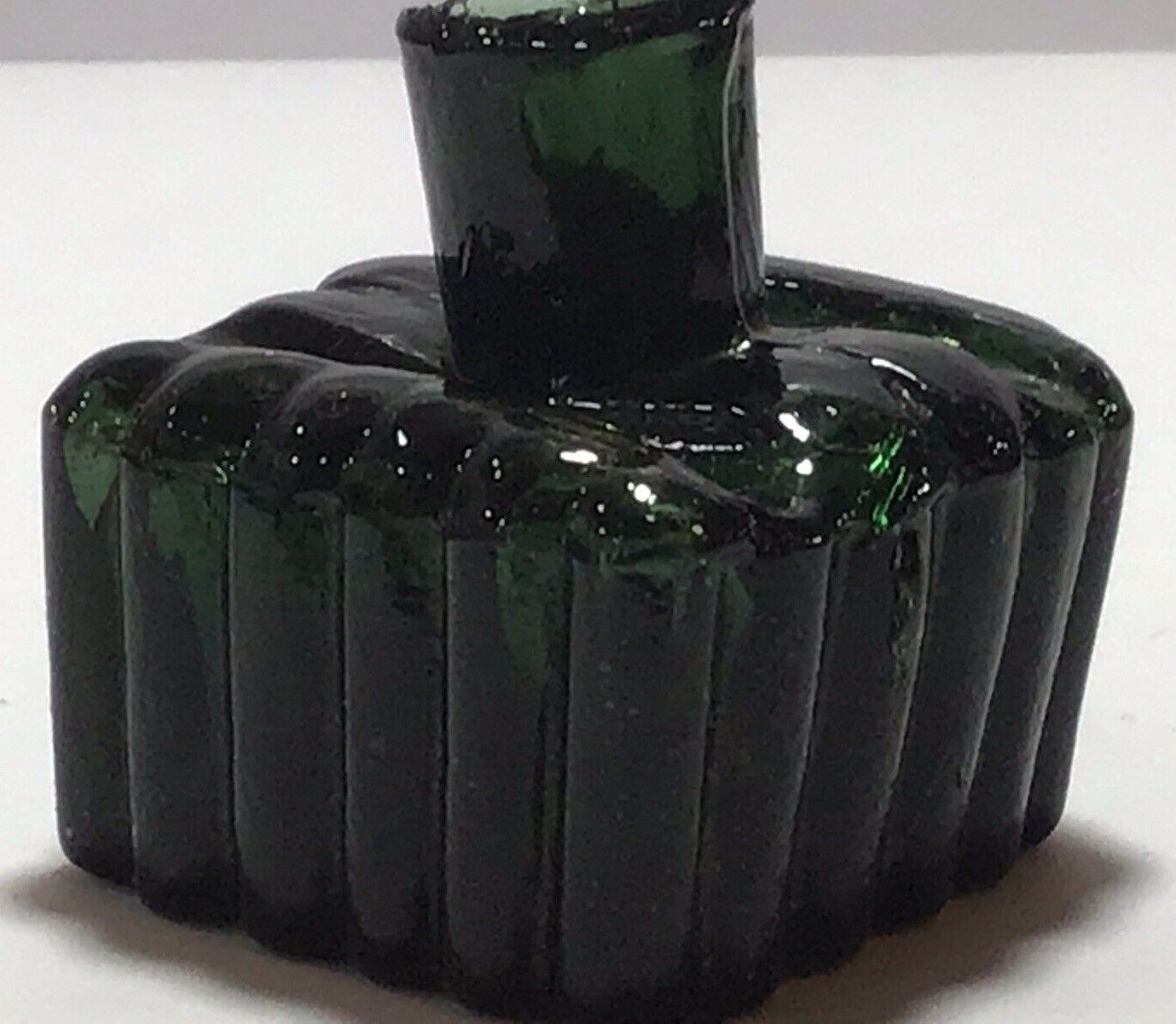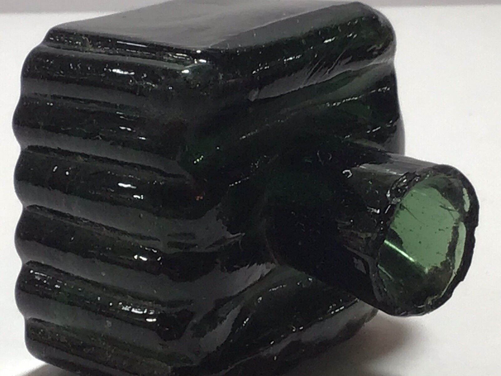 An embossed ink bottle with a sheared lip that is square shaped with three ribbed panels and one plain panel for a label. There are two pen rests on the top. The dark green color is unusual – it almost black.