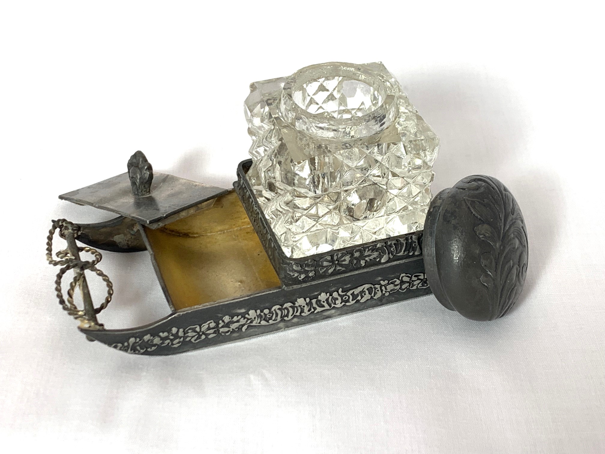Figural sled styled base for the pressed glass cube style inkwell measuring just over 1.25 inches all sides. Quadruple silver-plate with a small, covered compartment for either spare nibs or stamps. The Mount Washington Glass Company’s owners established the Pairpoint Manufacturing Co in 1880 to produce ornate silver-plated mounts for Mt. Washington glass. Both companies eventually became one, the Pairpoint Corporation in 1900.