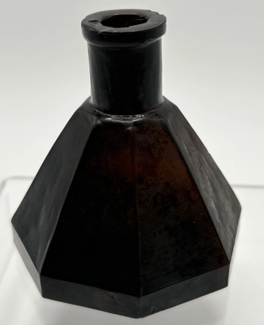 This deep chocolate amber umbrella ink bottle is a refined mid-to-late 19th-century utilitarian object, valued for its rare, dark coloration.