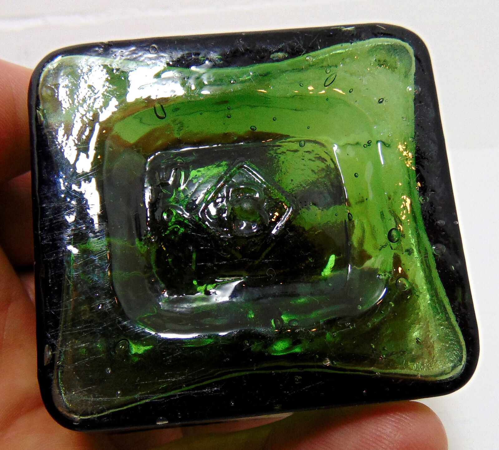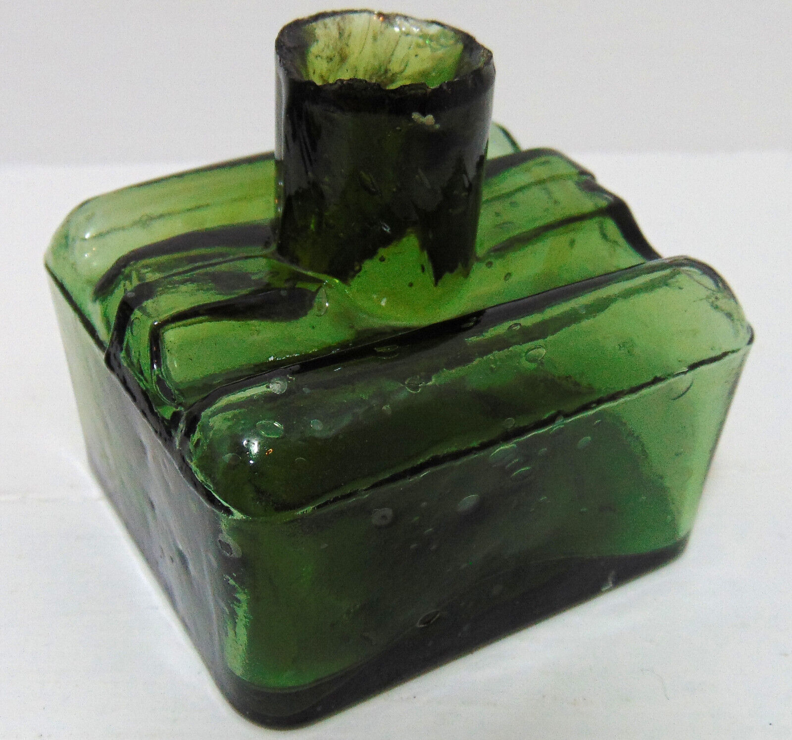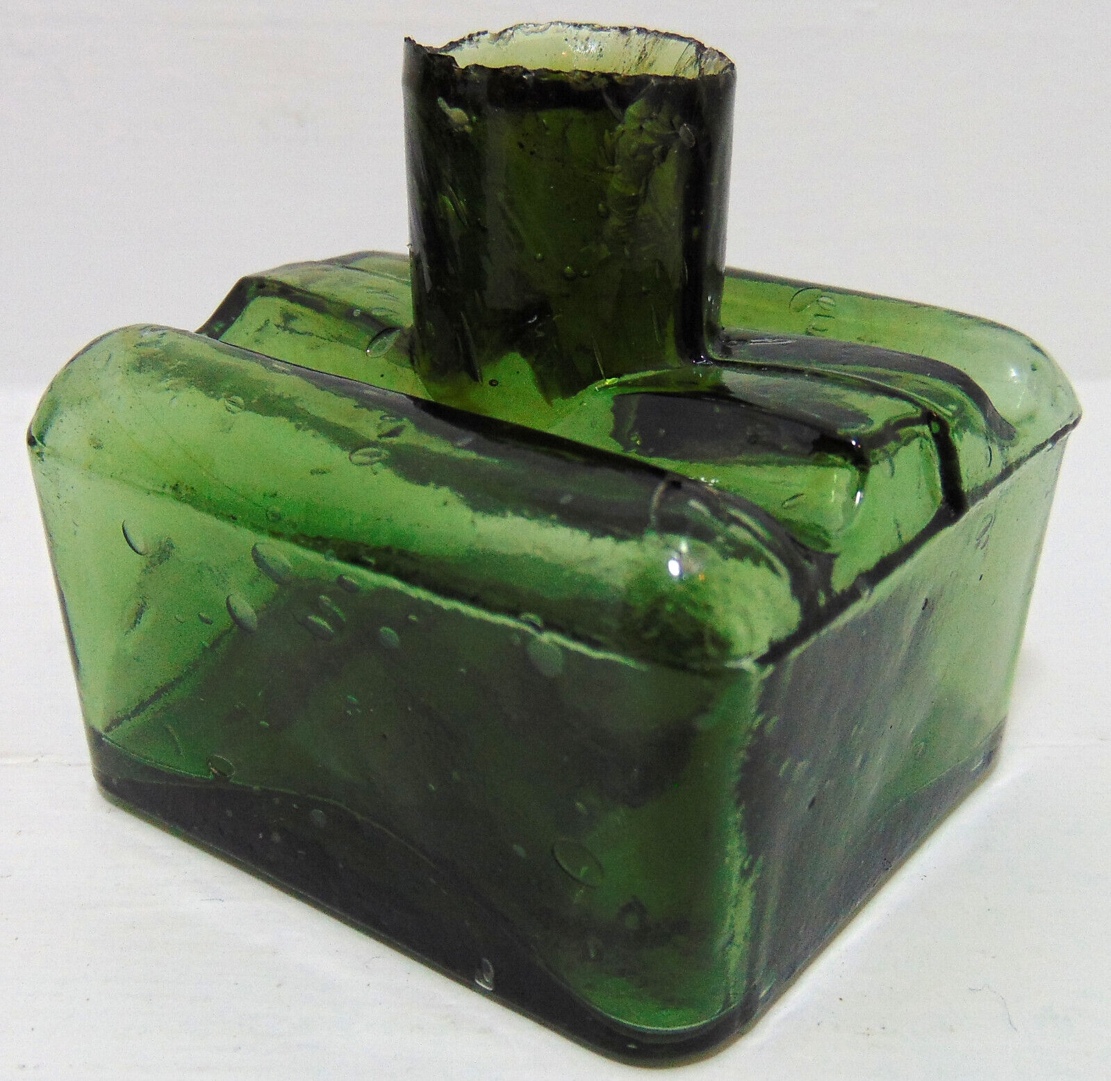 A large size dark green “Boat” type ink bottle with rounded corners and almost square-bodied shape.