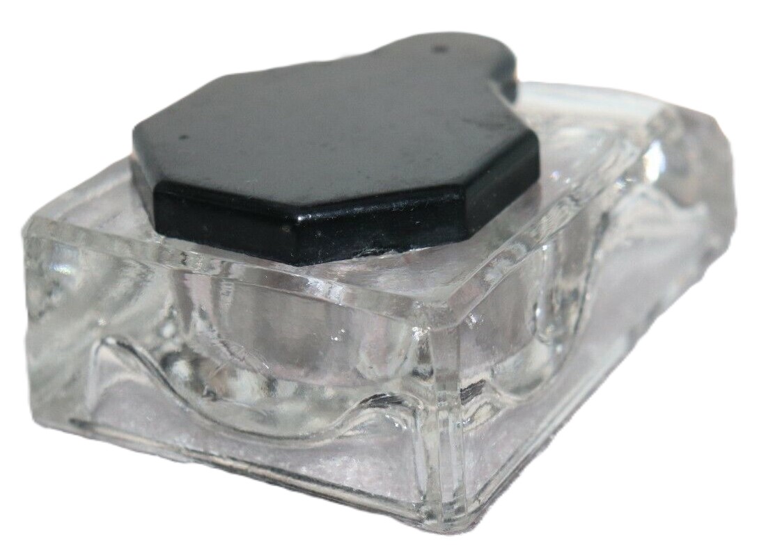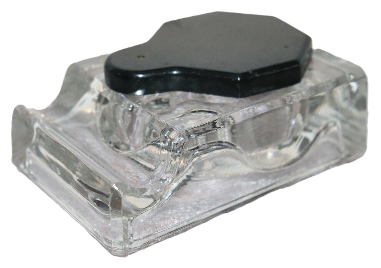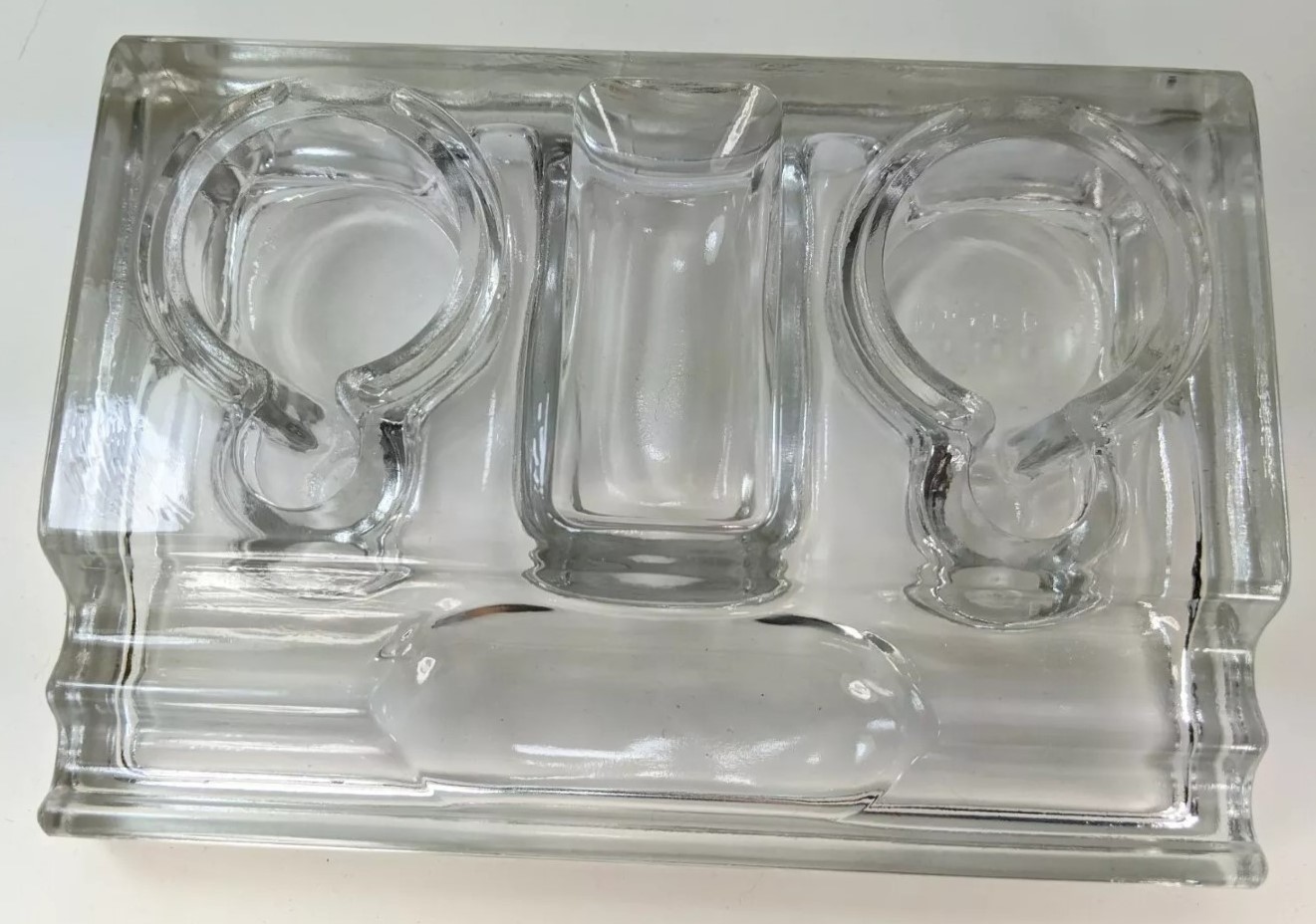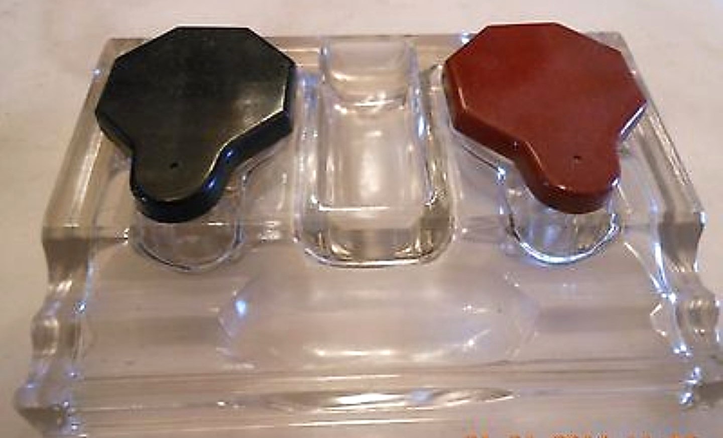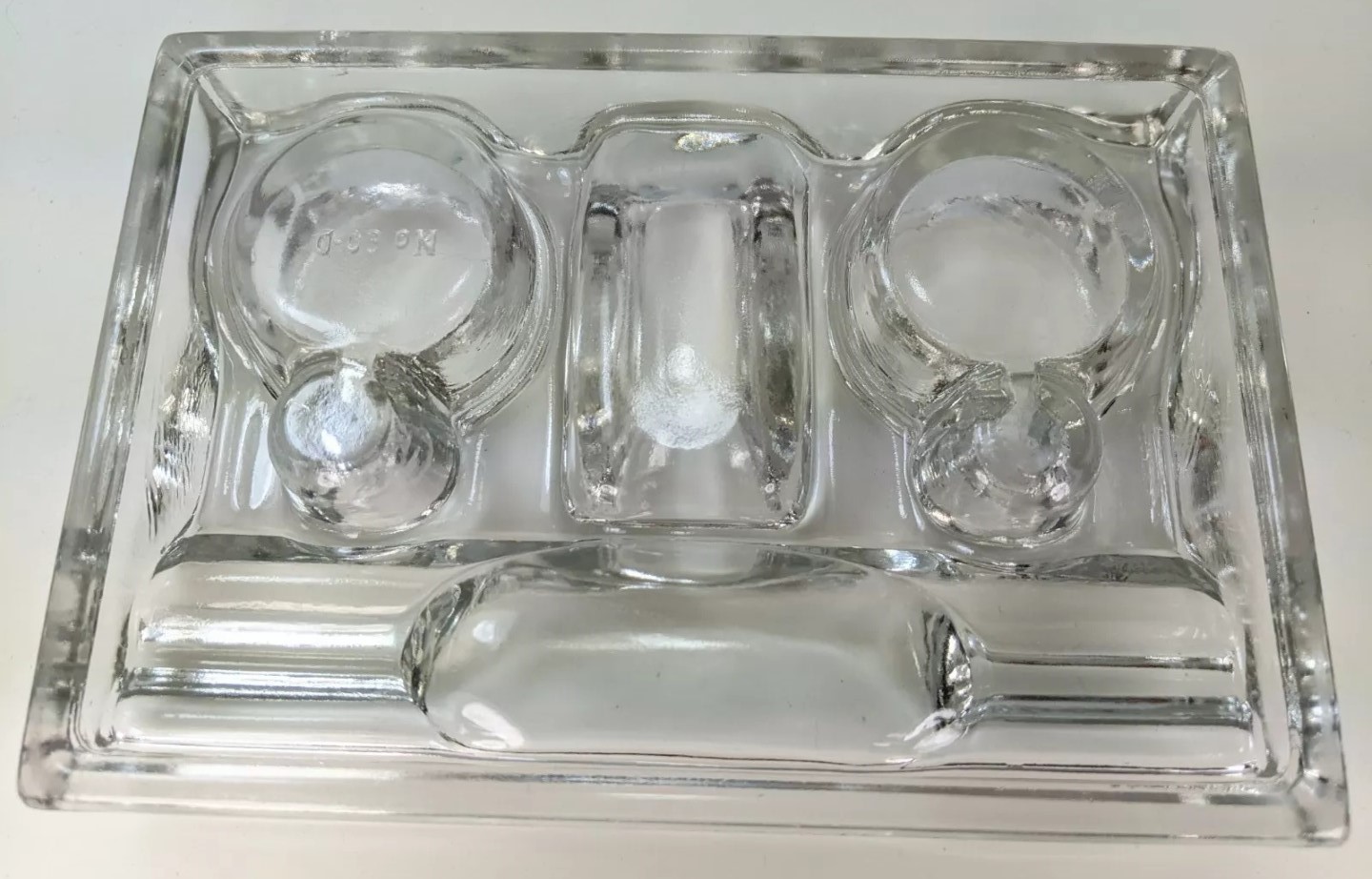 Example #1 is a double inkstand with the two ink reservoirs covered, one black and one red lid. The glass base is marked “D-30” and has a pen wipe built in between the inkwells. 8 ⅛” x 5” x 1 ½” high