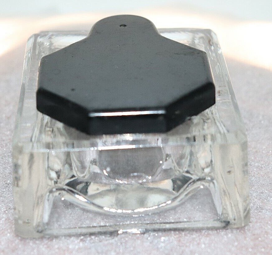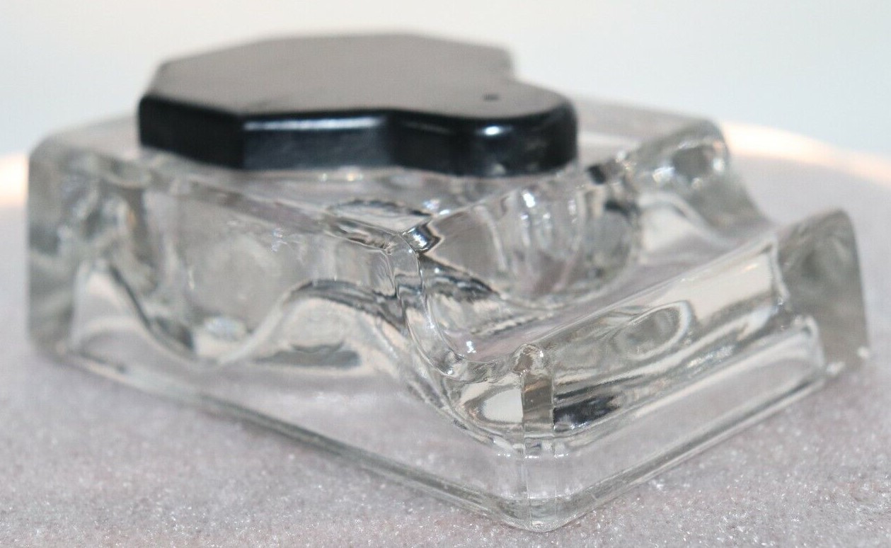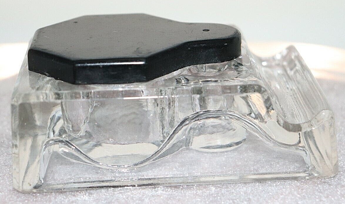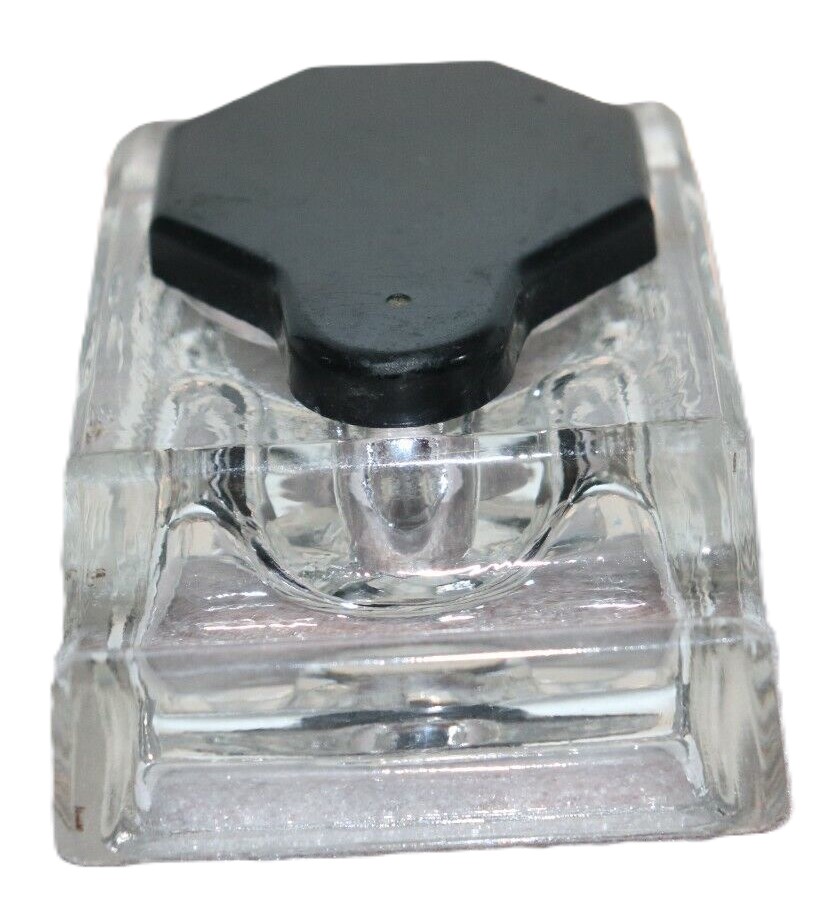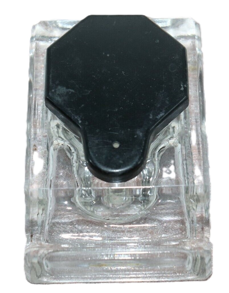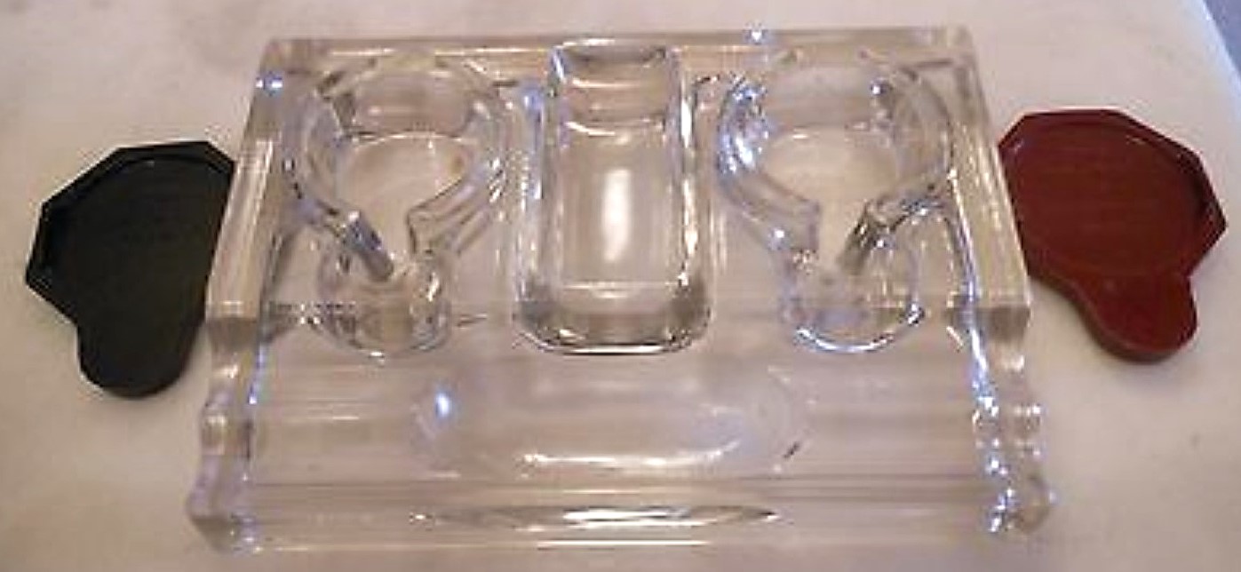 Example #1 is a double inkstand with the two ink reservoirs covered, one black and one red lid. The glass base is marked “D-30” and has a pen wipe built in between the inkwells. 8 ⅛” x 5” x 1 ½” high