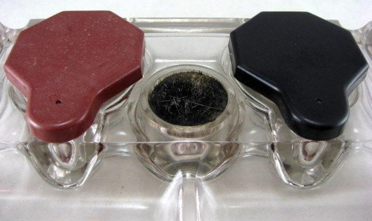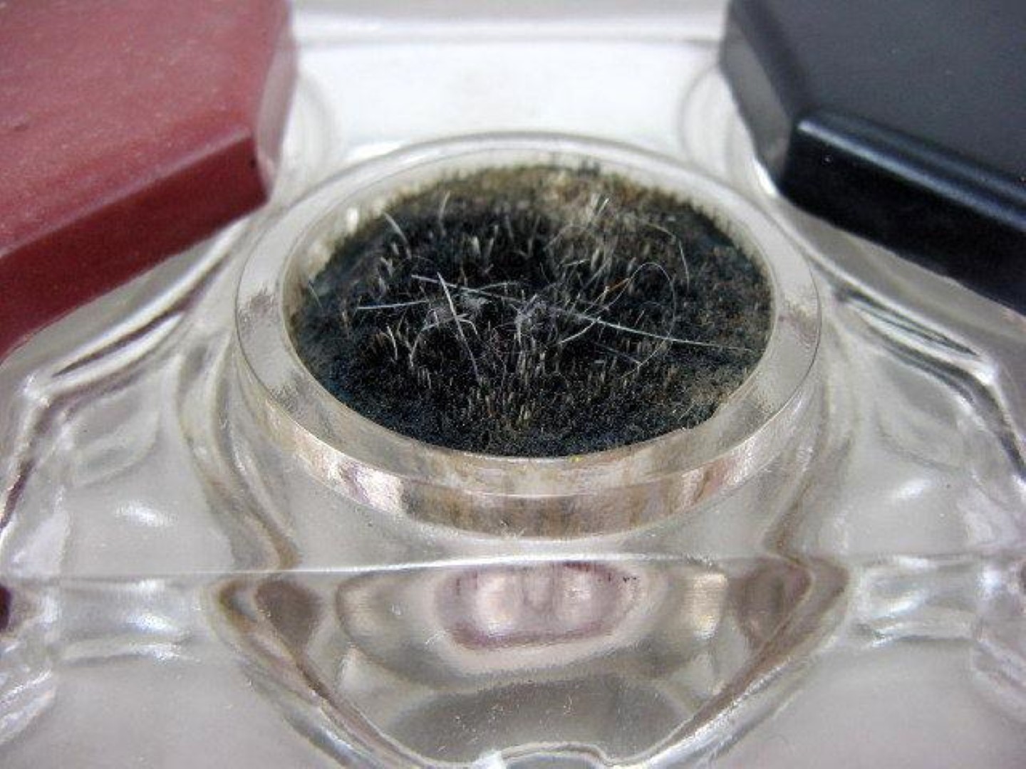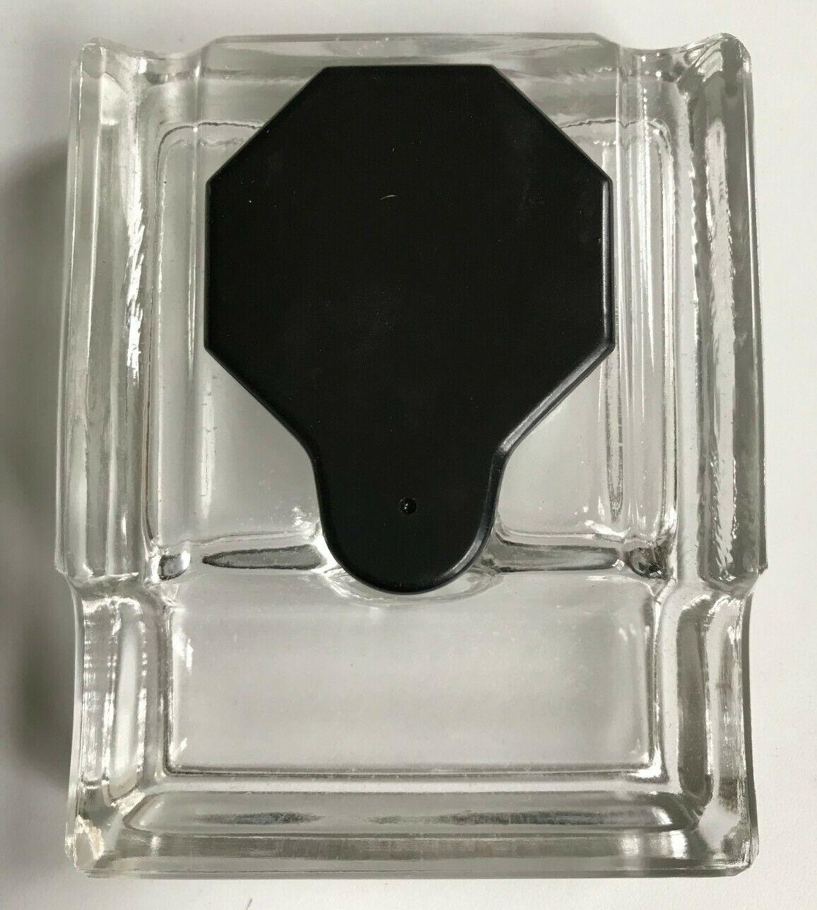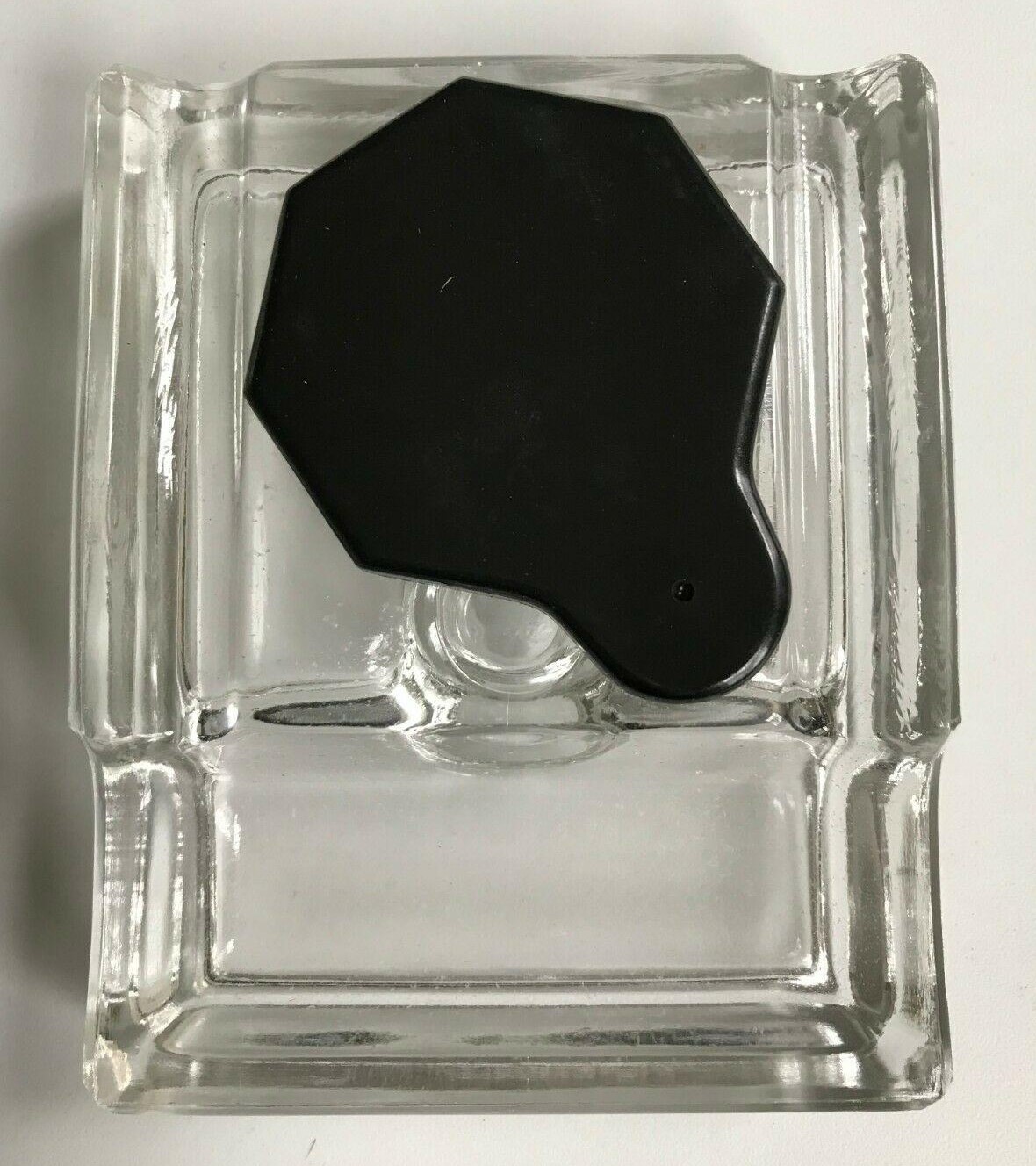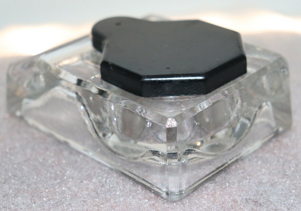 Example #1 is a double inkstand with the two ink reservoirs covered, one black and one red lid. The glass base is marked “D-30” and has a pen wipe built in between the inkwells. 8 ⅛” x 5” x 1 ½” high