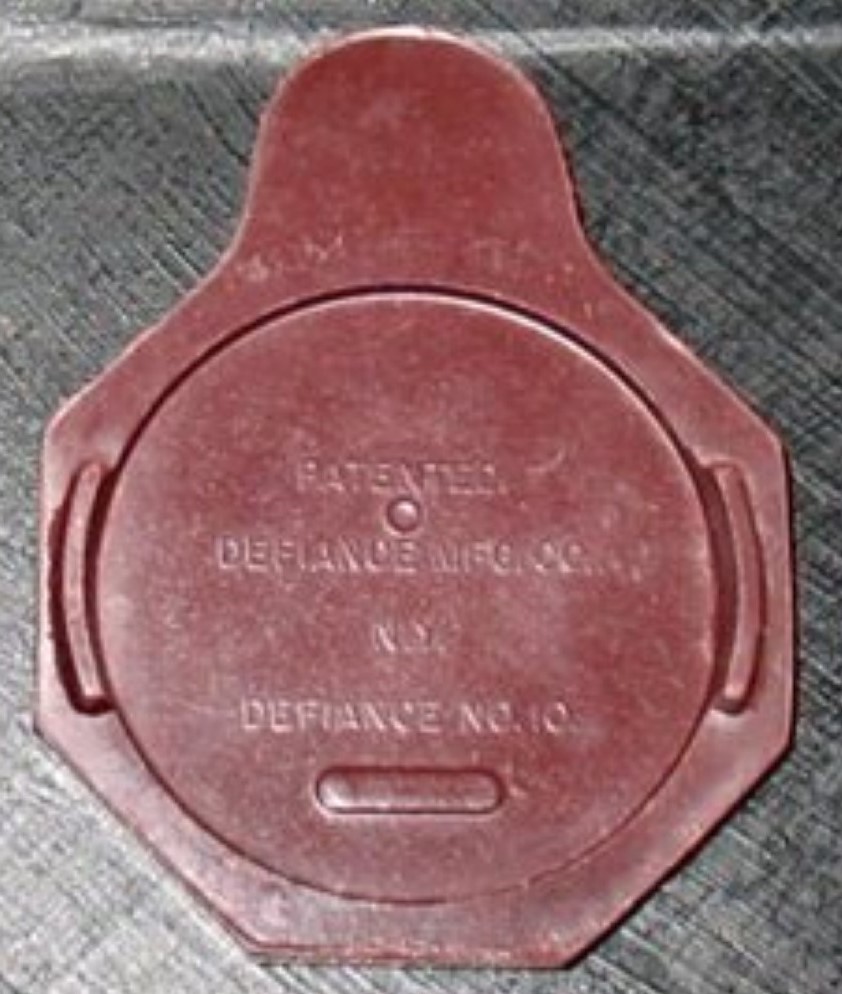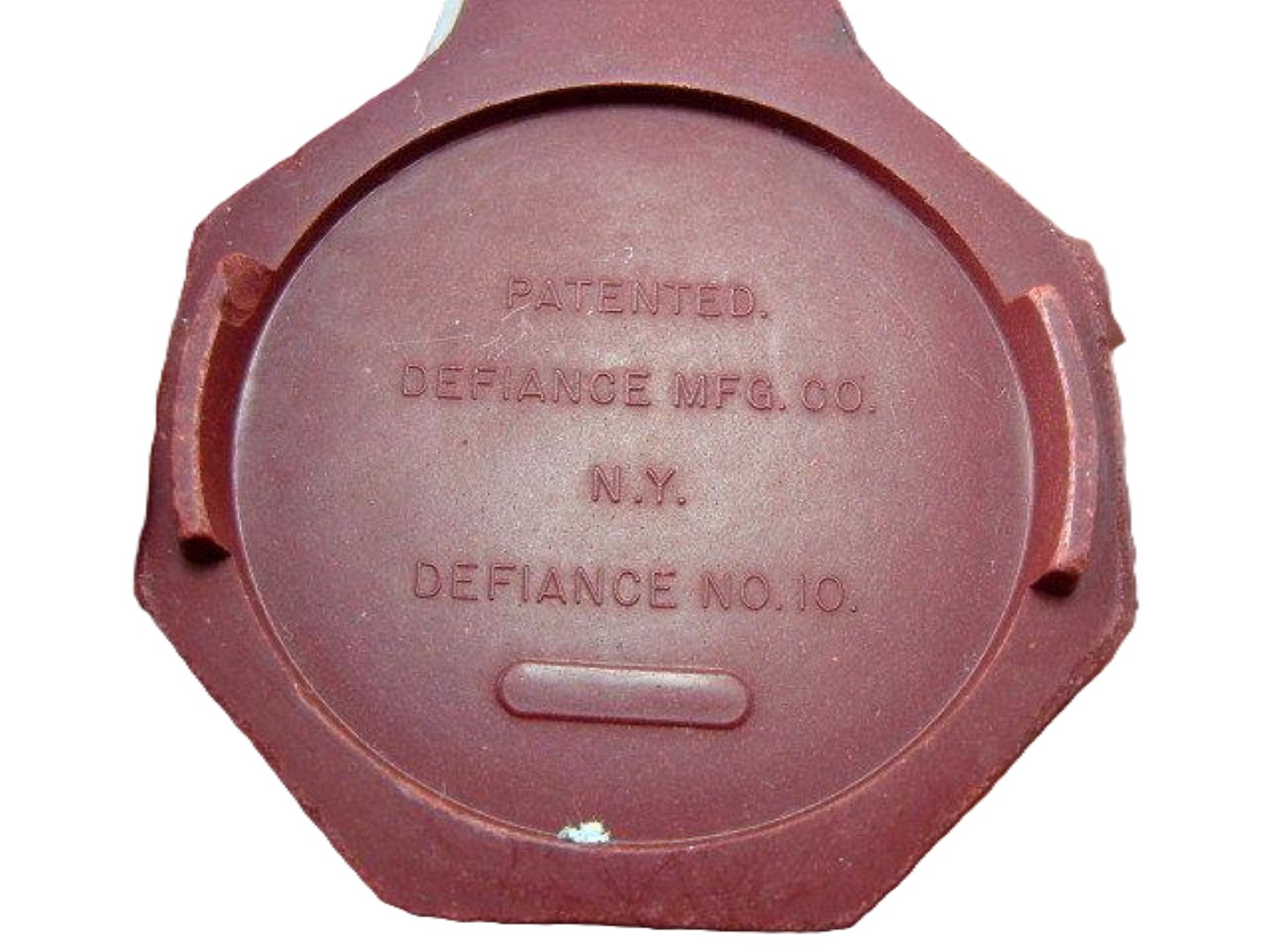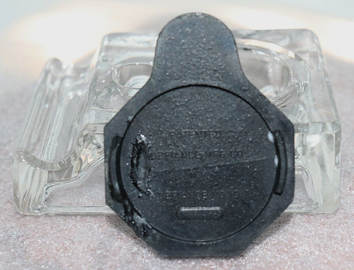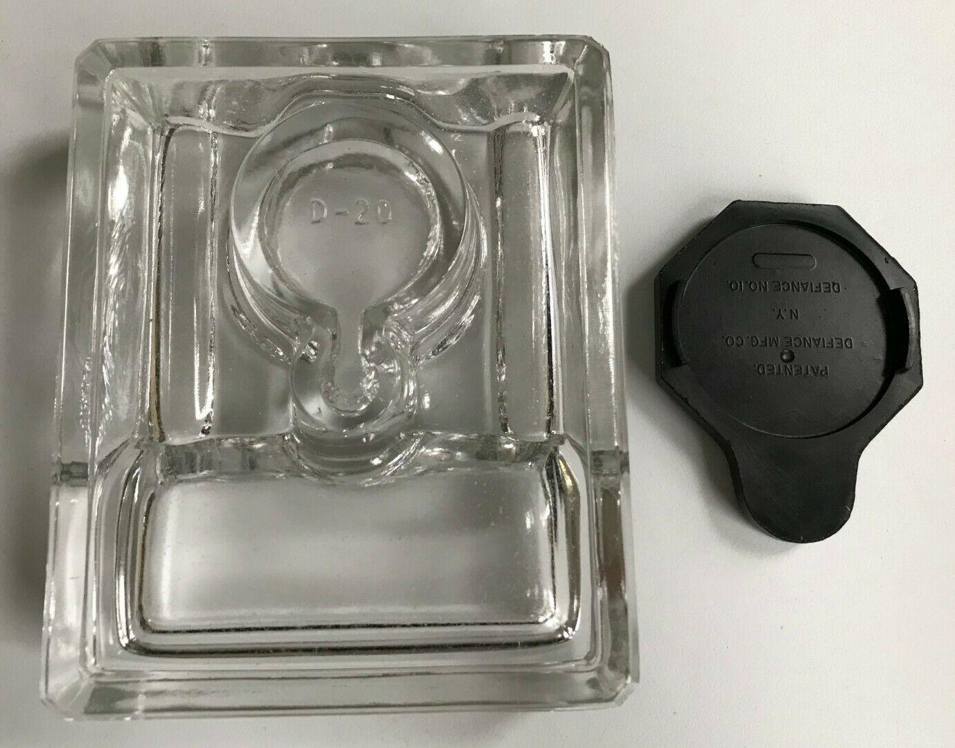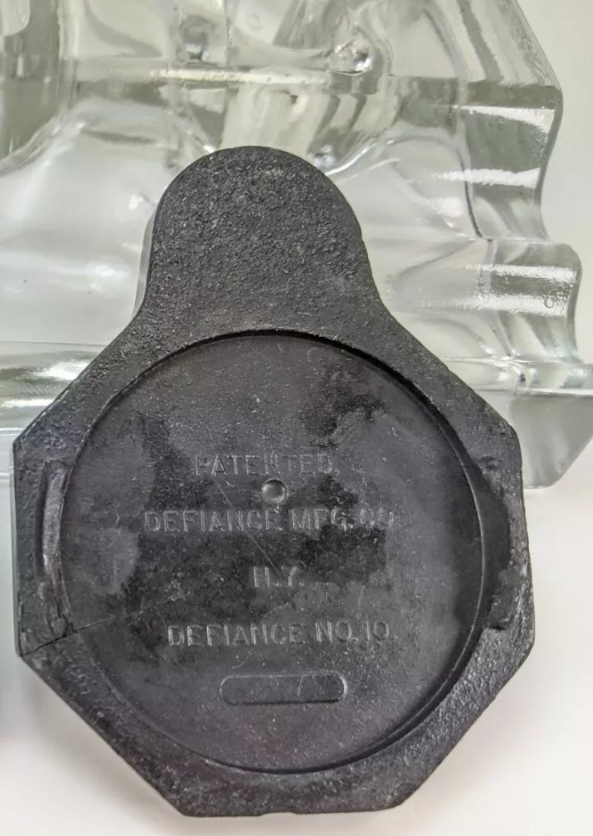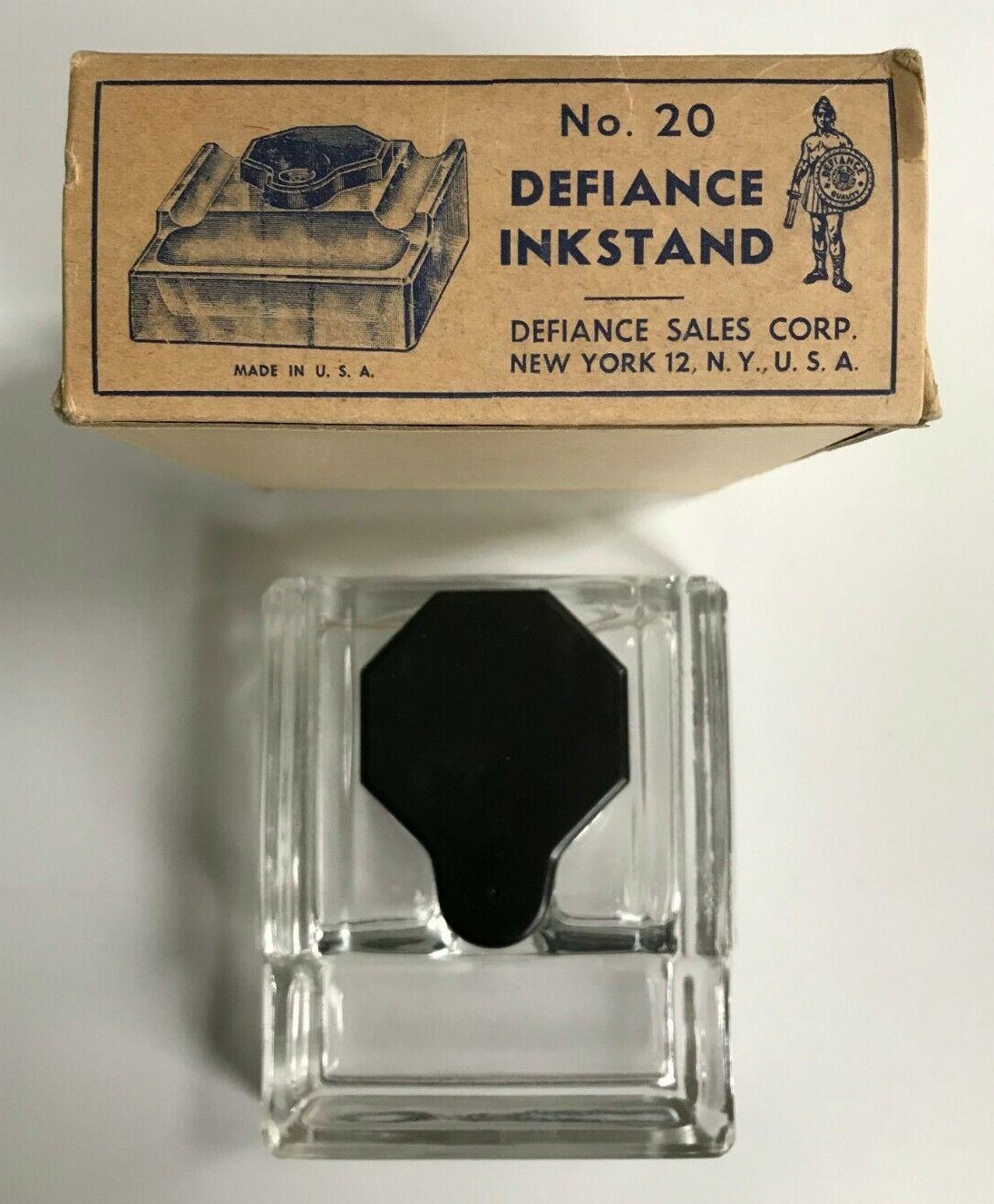 The Defiance Manufacturing Company made a variety of inkstands with pressed glass bases in a variety of shapes, sizes, and designs. Four examples are shown here. With all of them, covers made of resin or hard rubber fit over the ink reservoir and, when pushed with a pen, rotated open or closed. The covers are marked “Patented – Defiance Mfg. Co. N.Y. – Defiance No. 10”.