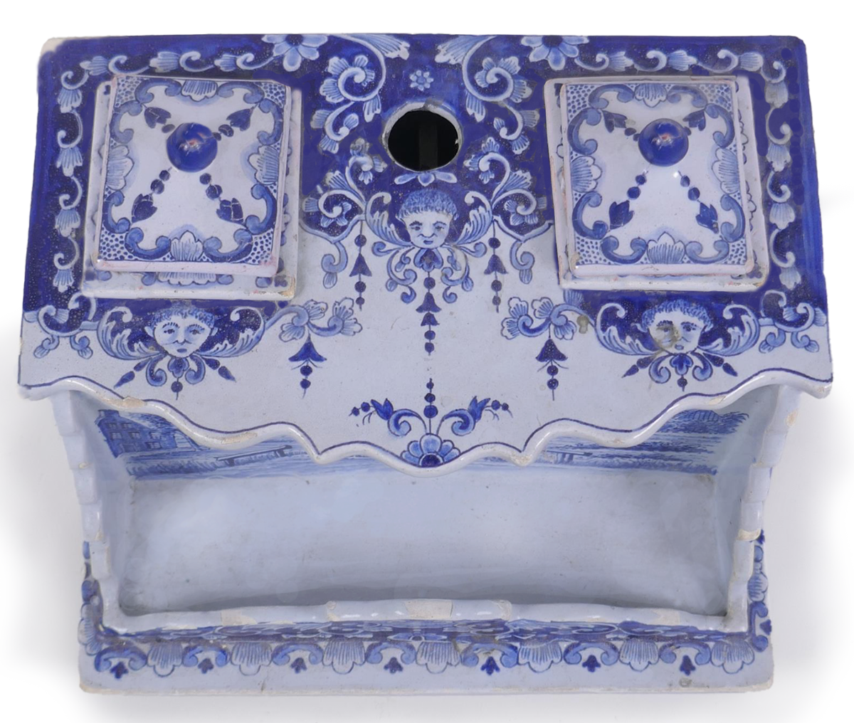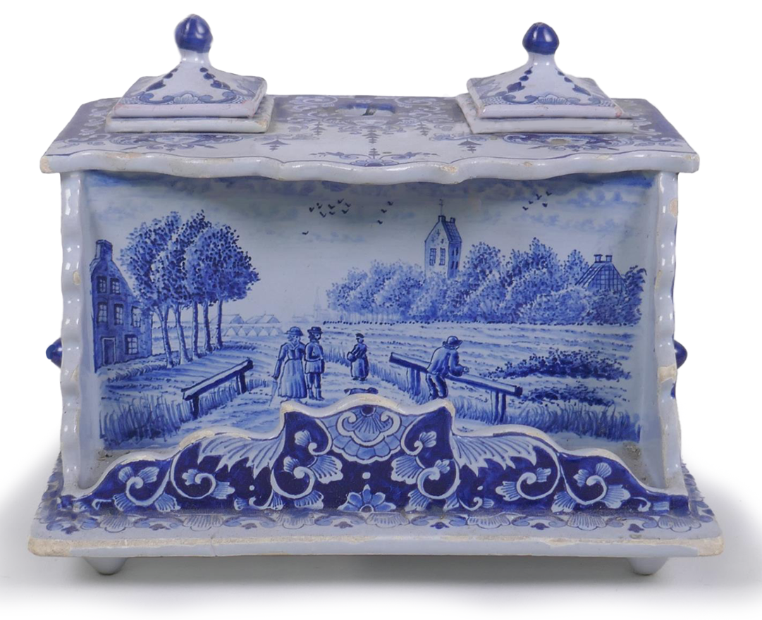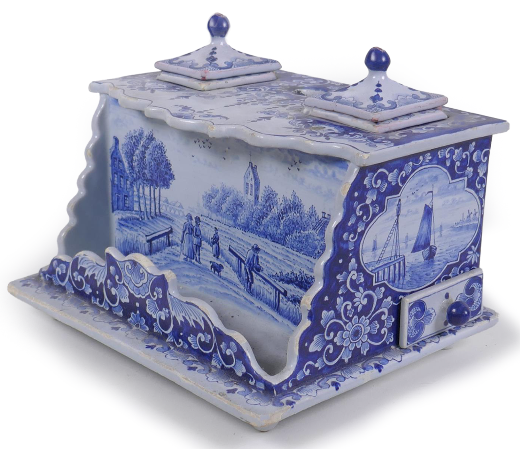Early and signed Makkum blue & white hand painted Dutch Delftware inkstand. The inkstand is decorated on all sides with different Dutch scenes, and is hand signed on the base with the name of the factory Makkum.