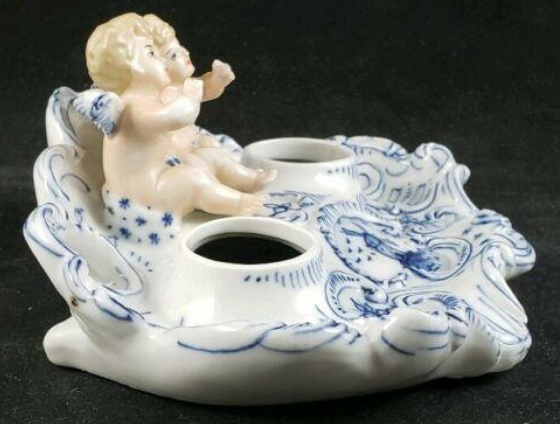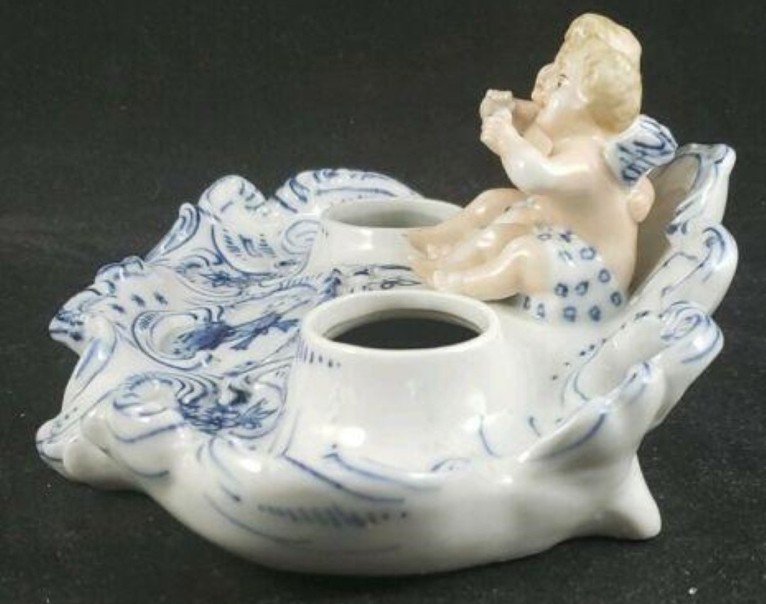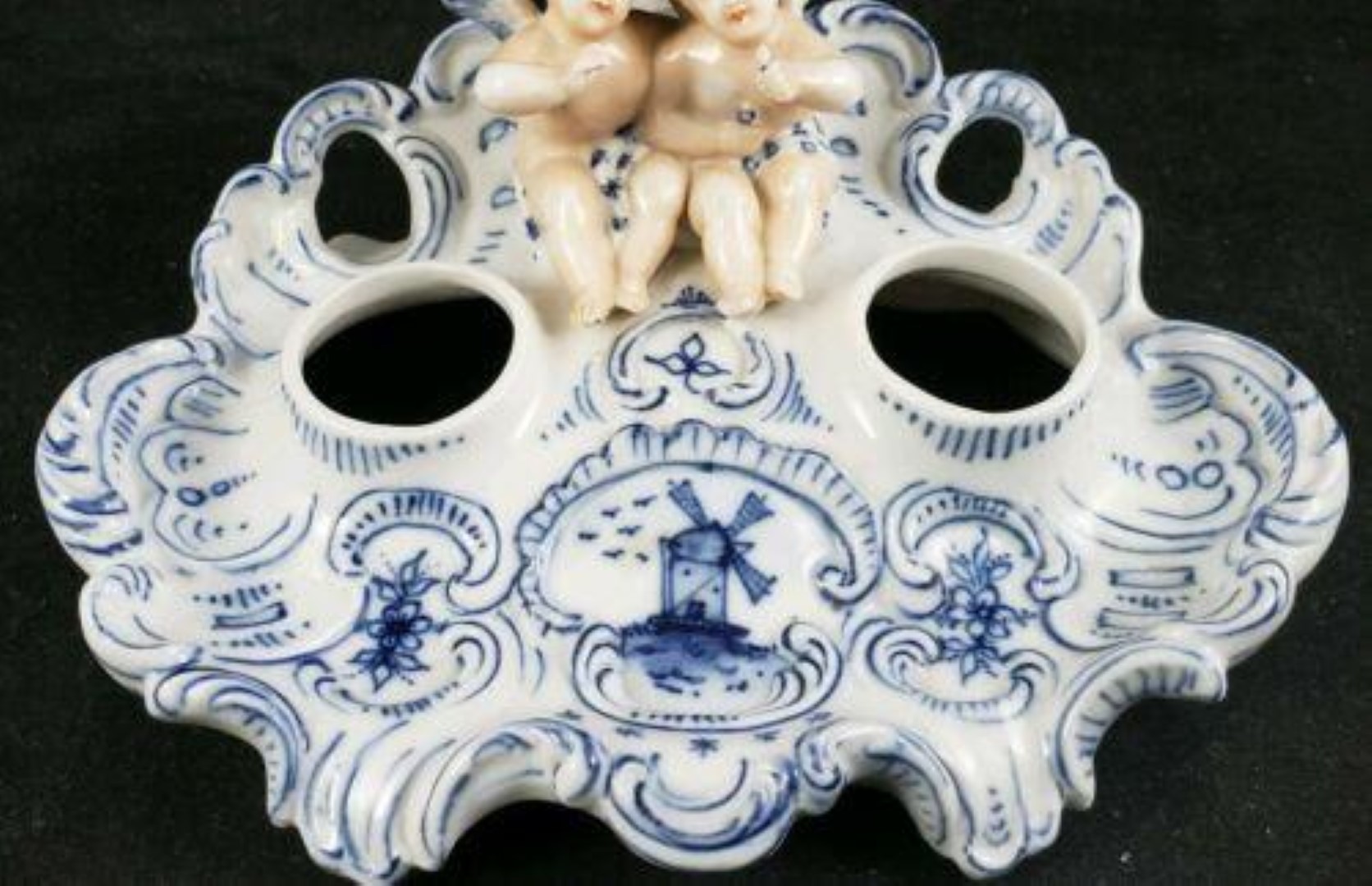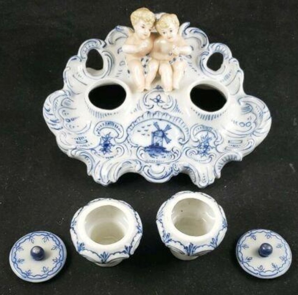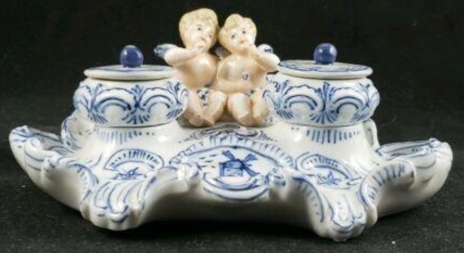 Delft-like inkstand with a pair of cherubs with detailed facial features sitting between two inkwells. The inkwells have unattached lids with finials. The ornate base is decorated with blue on white scrolls and flowers with a center cartouche of a windmill.