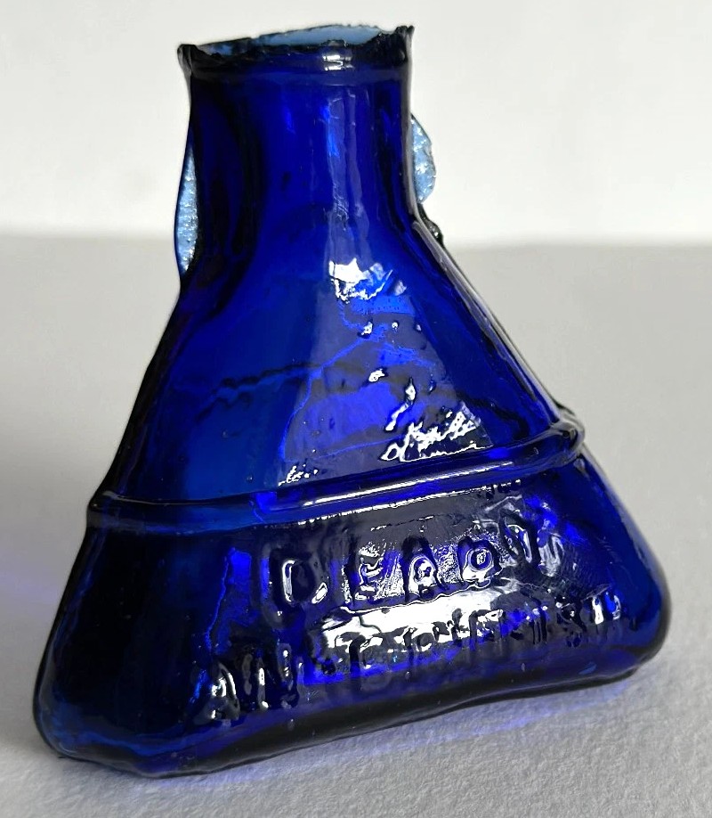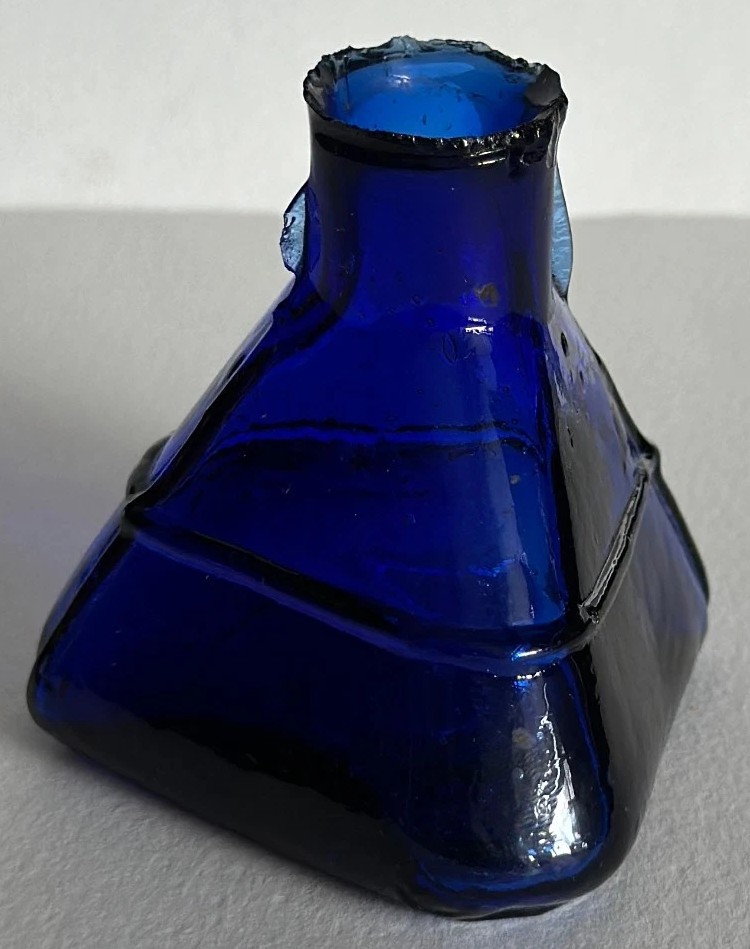 This cobalt blue glass ink bottle is sometimes referred to by collectors as a “tepee” or “pyramid” style due to its distinct triangular silhouette.