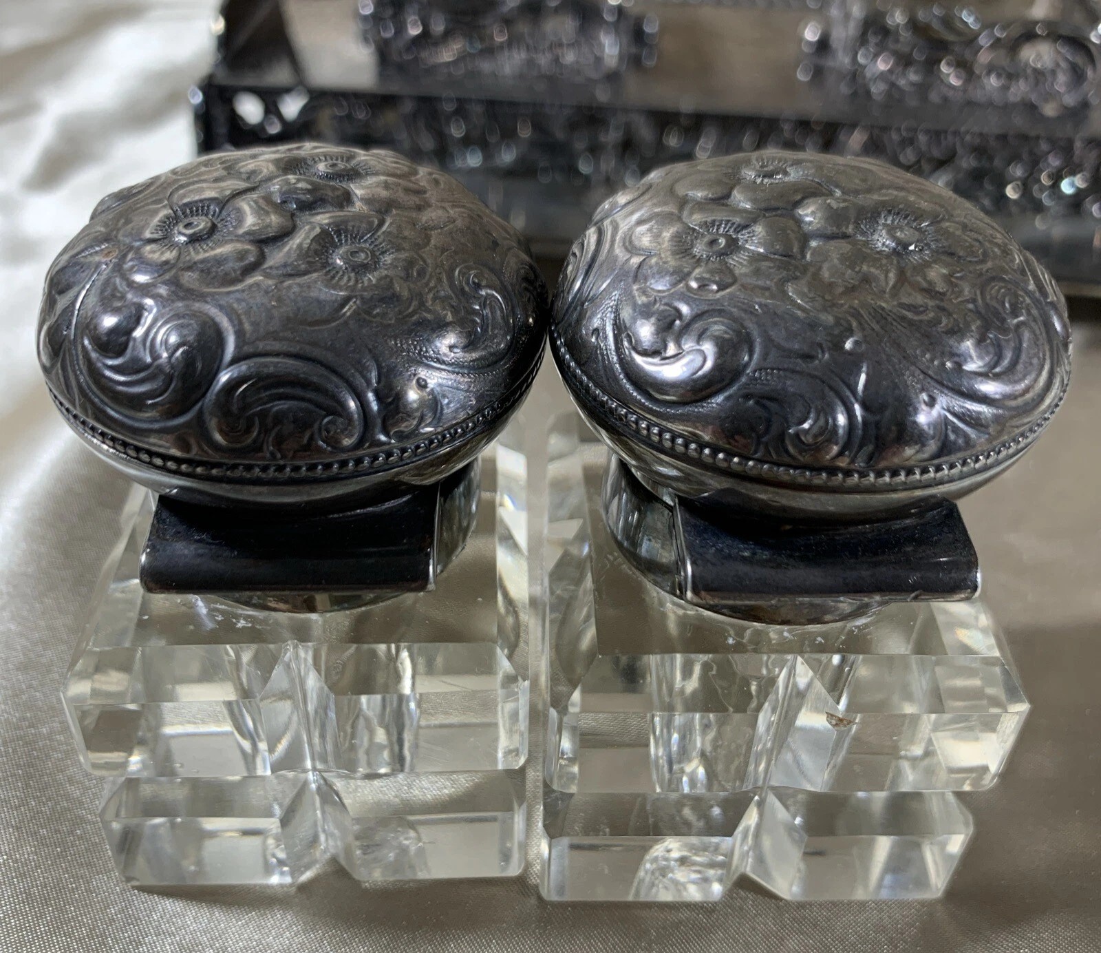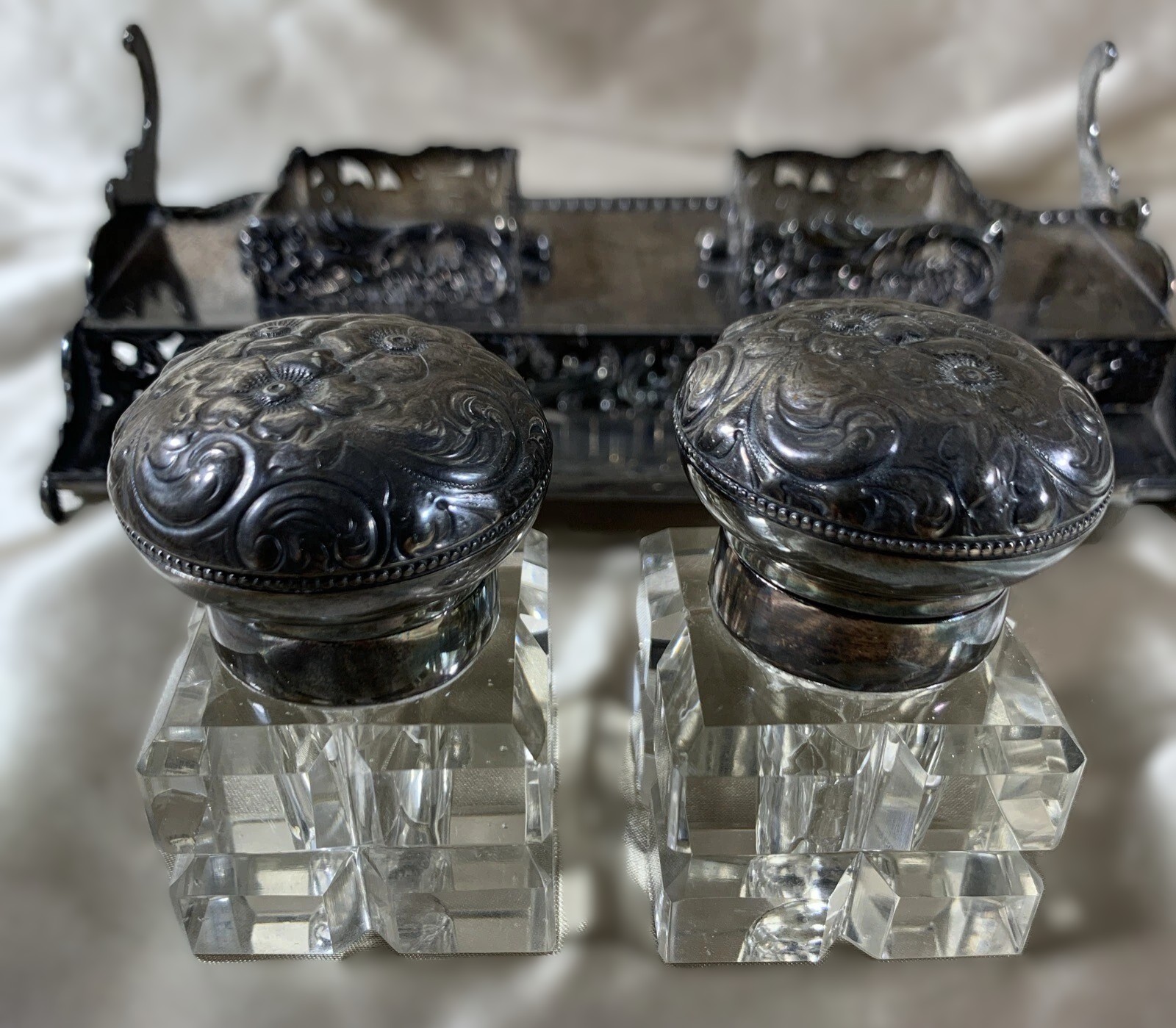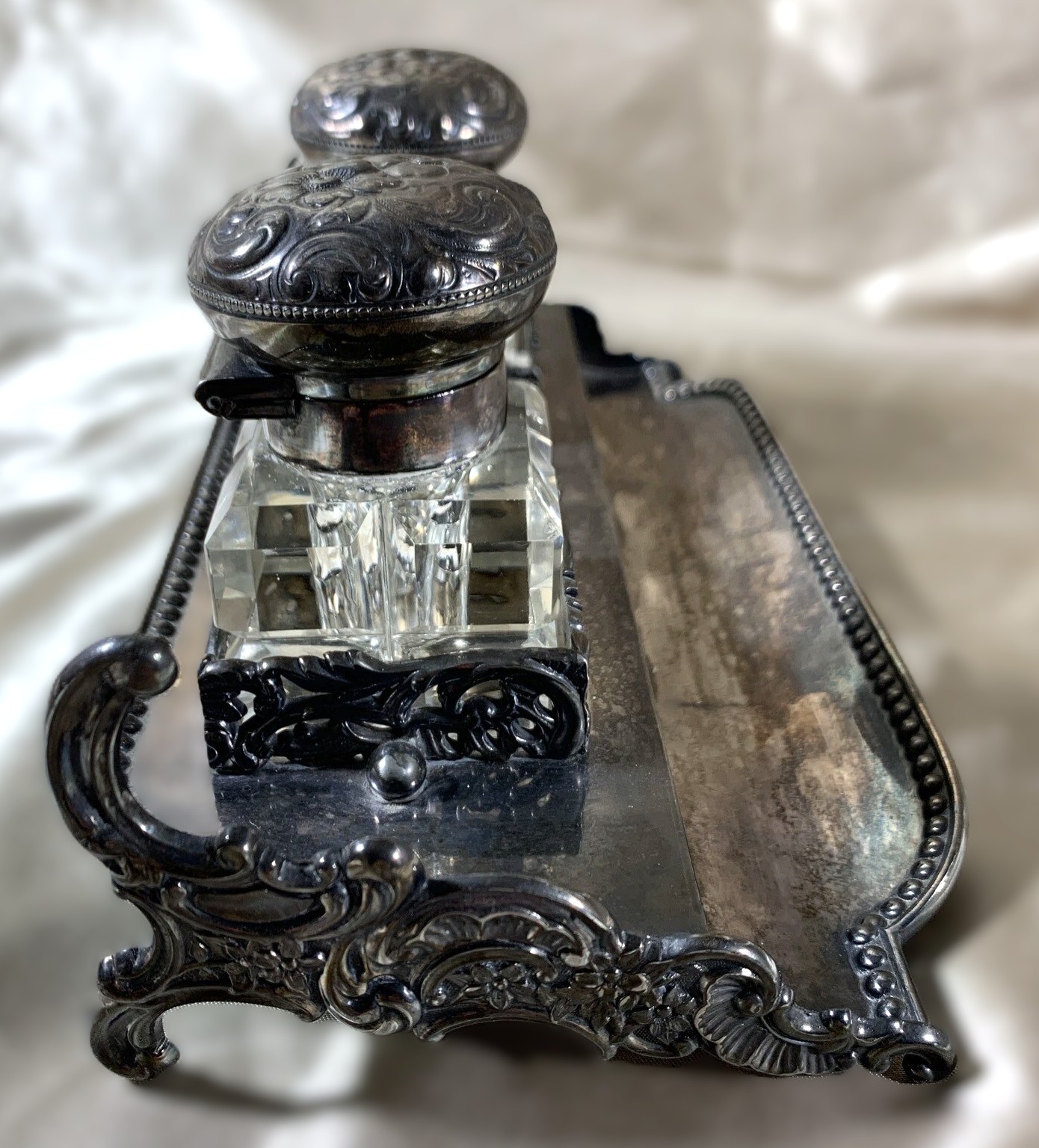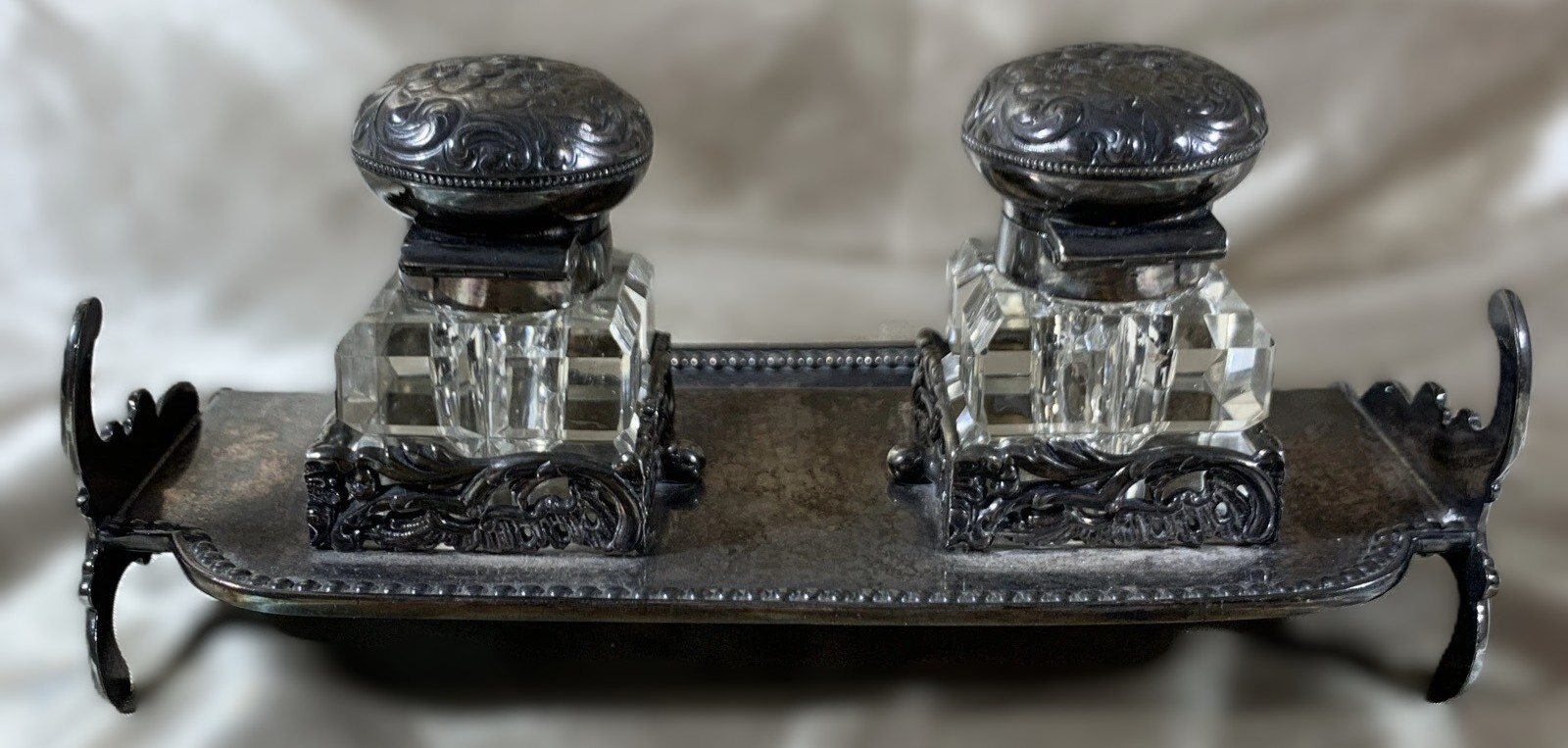 • Material and Construction: The lids are domed covers crafted from the Quadruple Plate silver, matching the base. They are attached to the base via a hinge mechanism located at the back edge of the inkwell opening.
