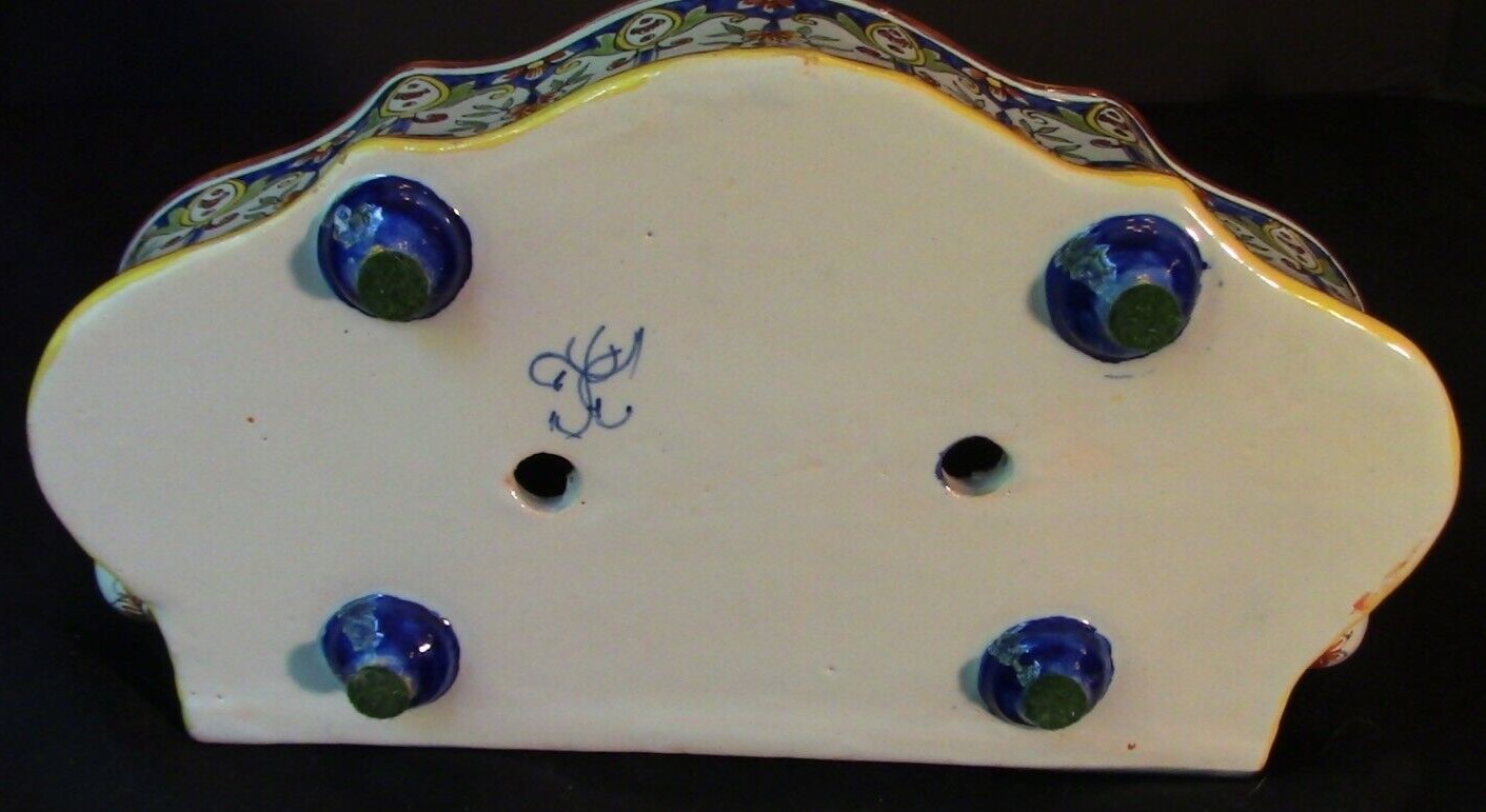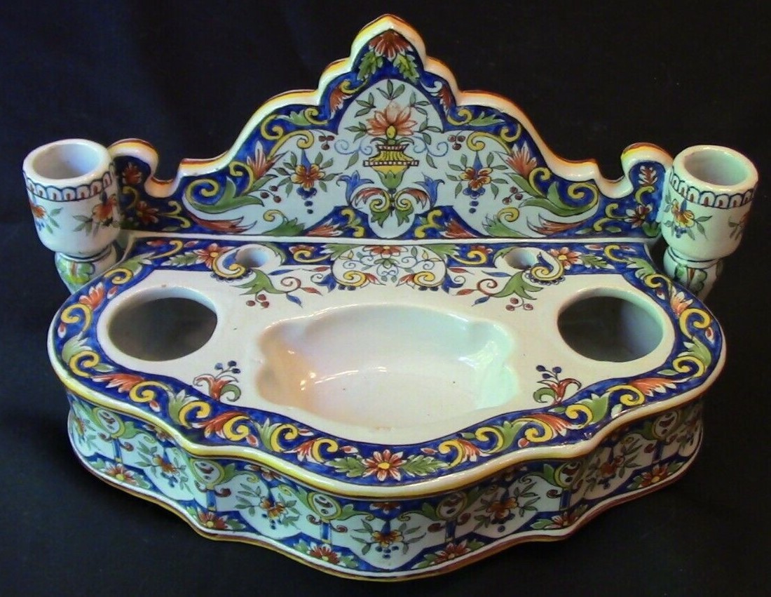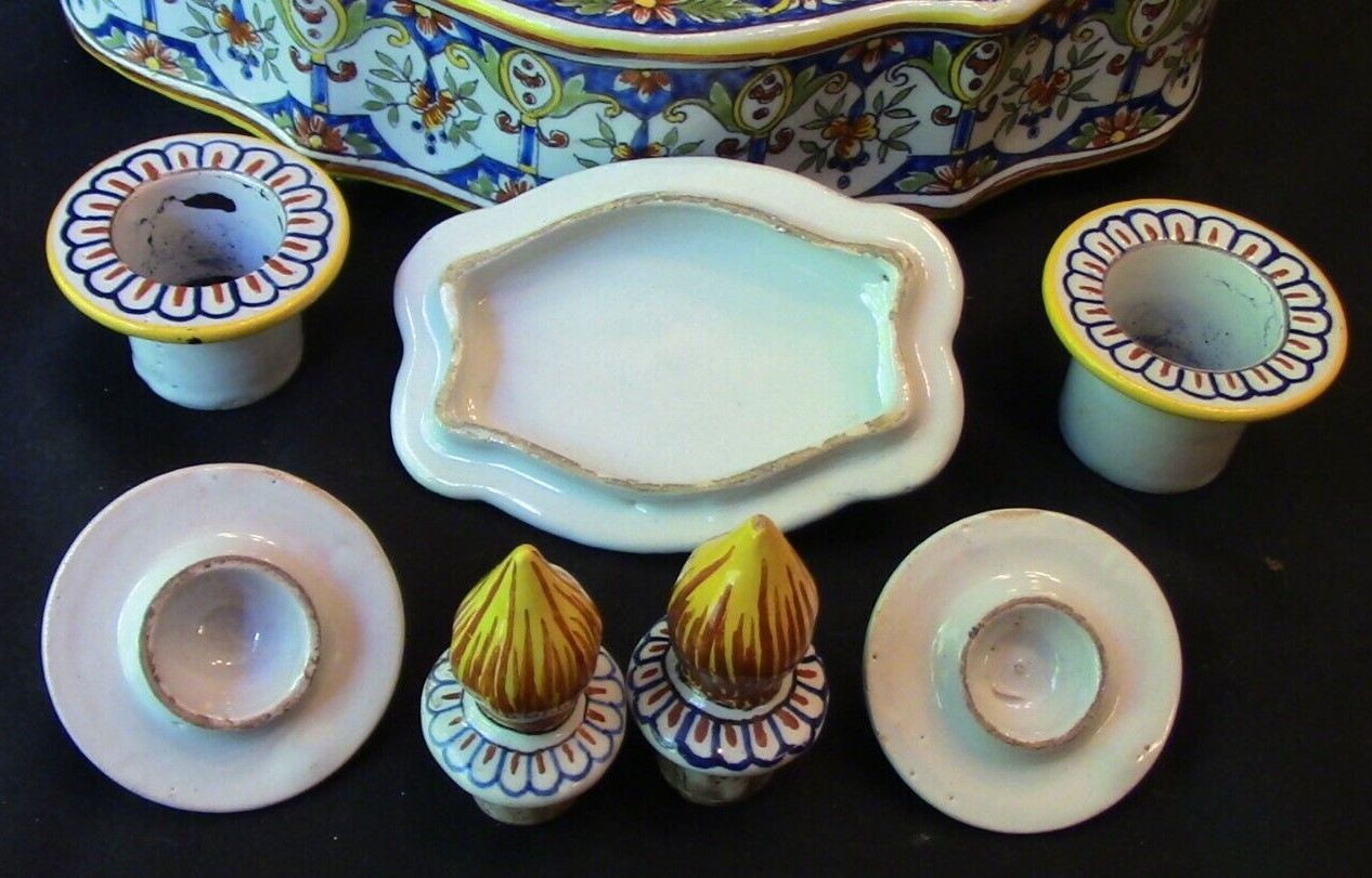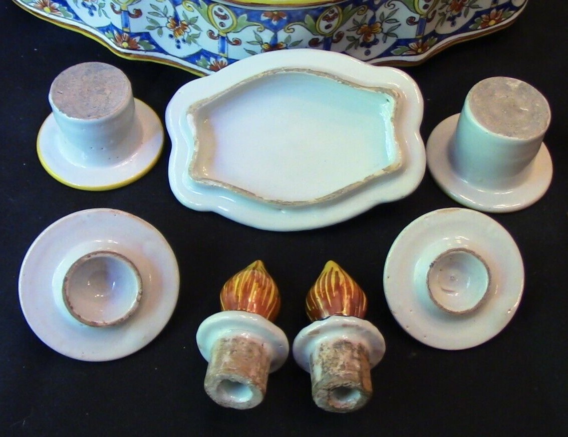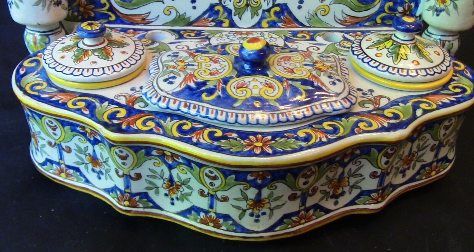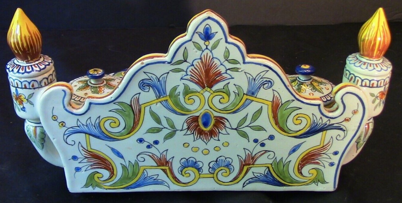 The town of Desvres, France has a long history of ceramic production. This is an example of a French faience inkstand by Desvres Fourmaintraux. It features a symmetrical design with two candle holders on either side, each topped with flame-like decorations. The central part of the inkstand features two inkwells and a lidded central storage compartment. The entire piece is hand-painted with vibrant colors, including blue, yellow, green, and orange, and decorated with intricate floral motifs and scrollwork.