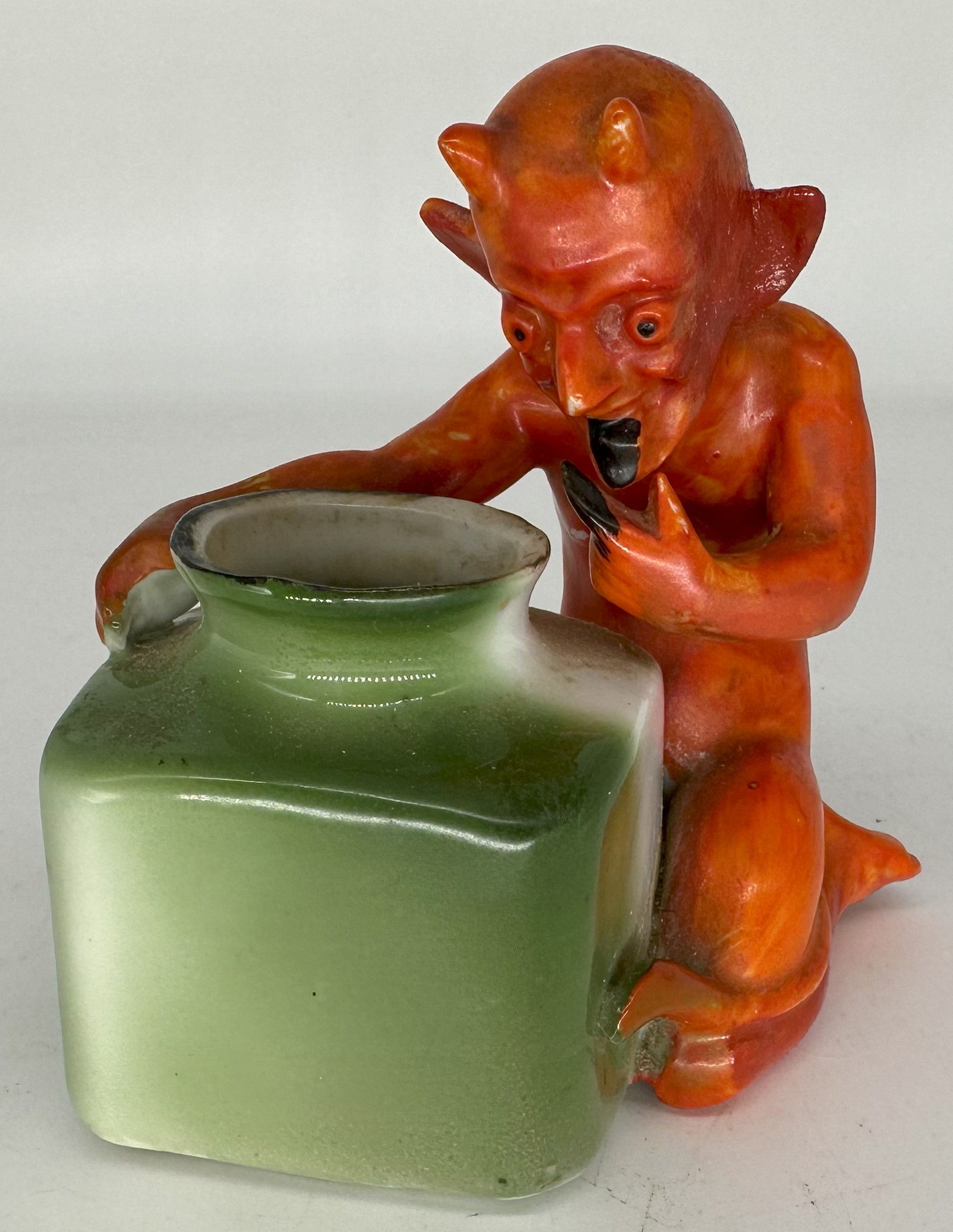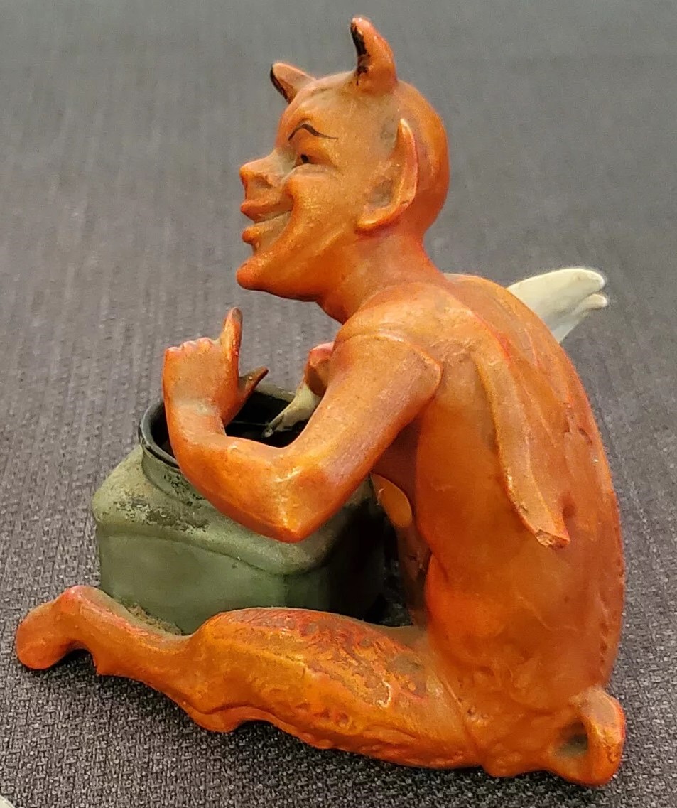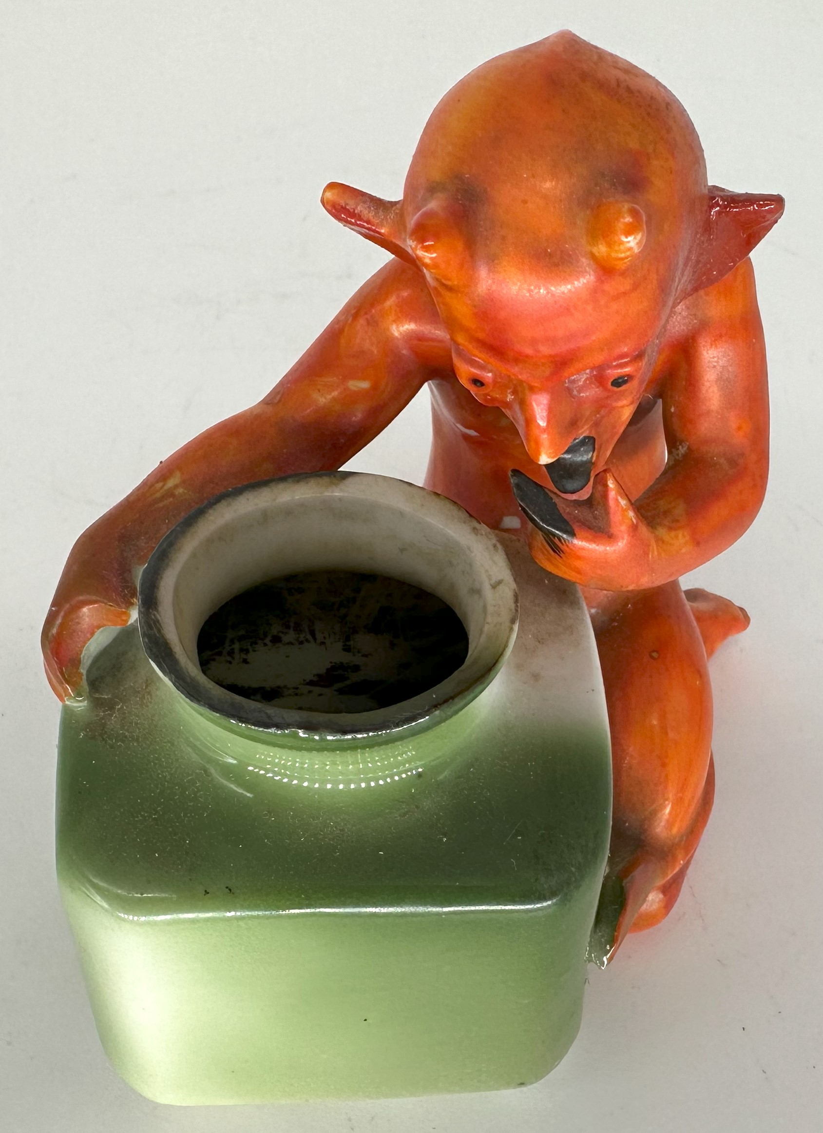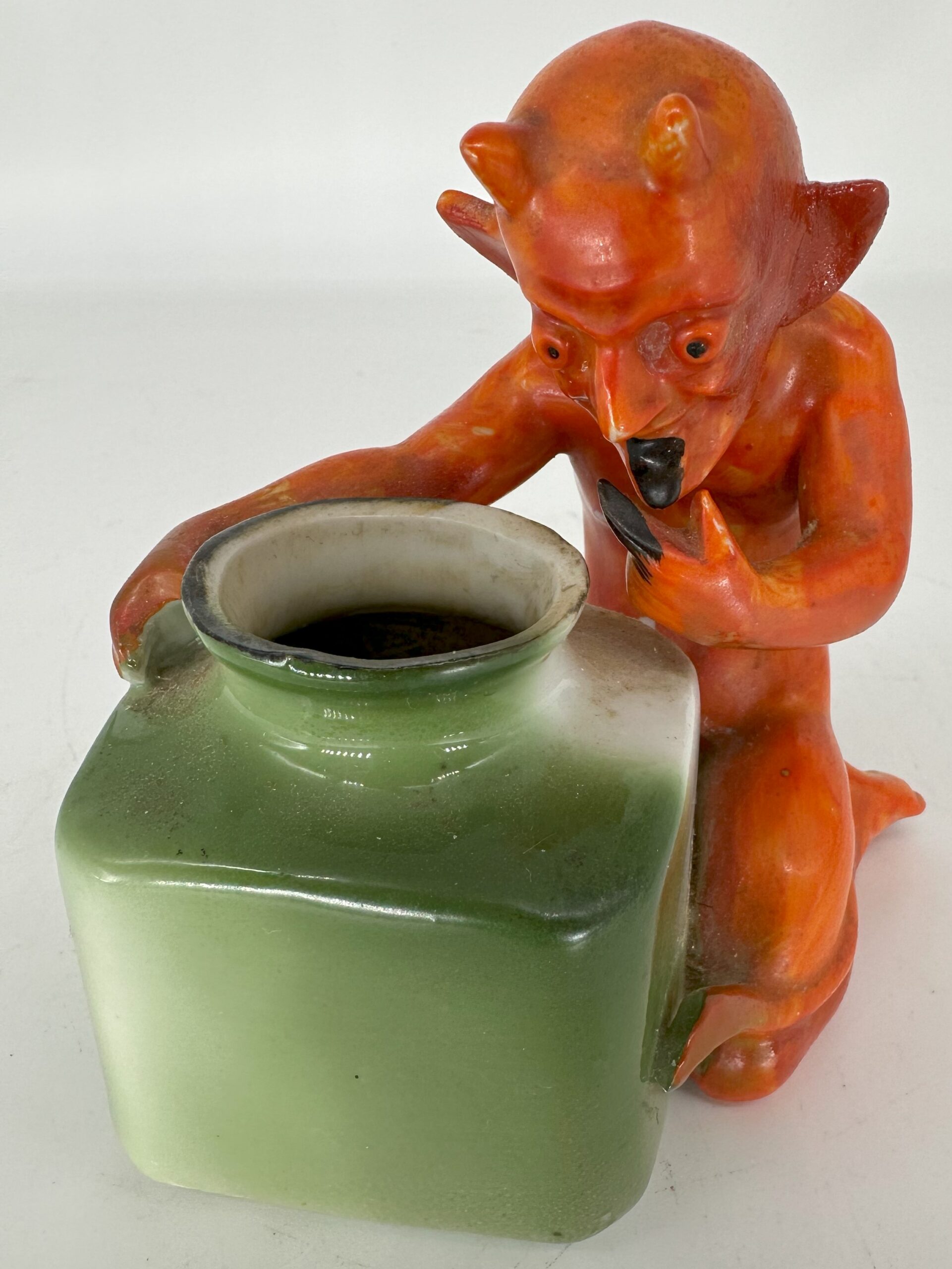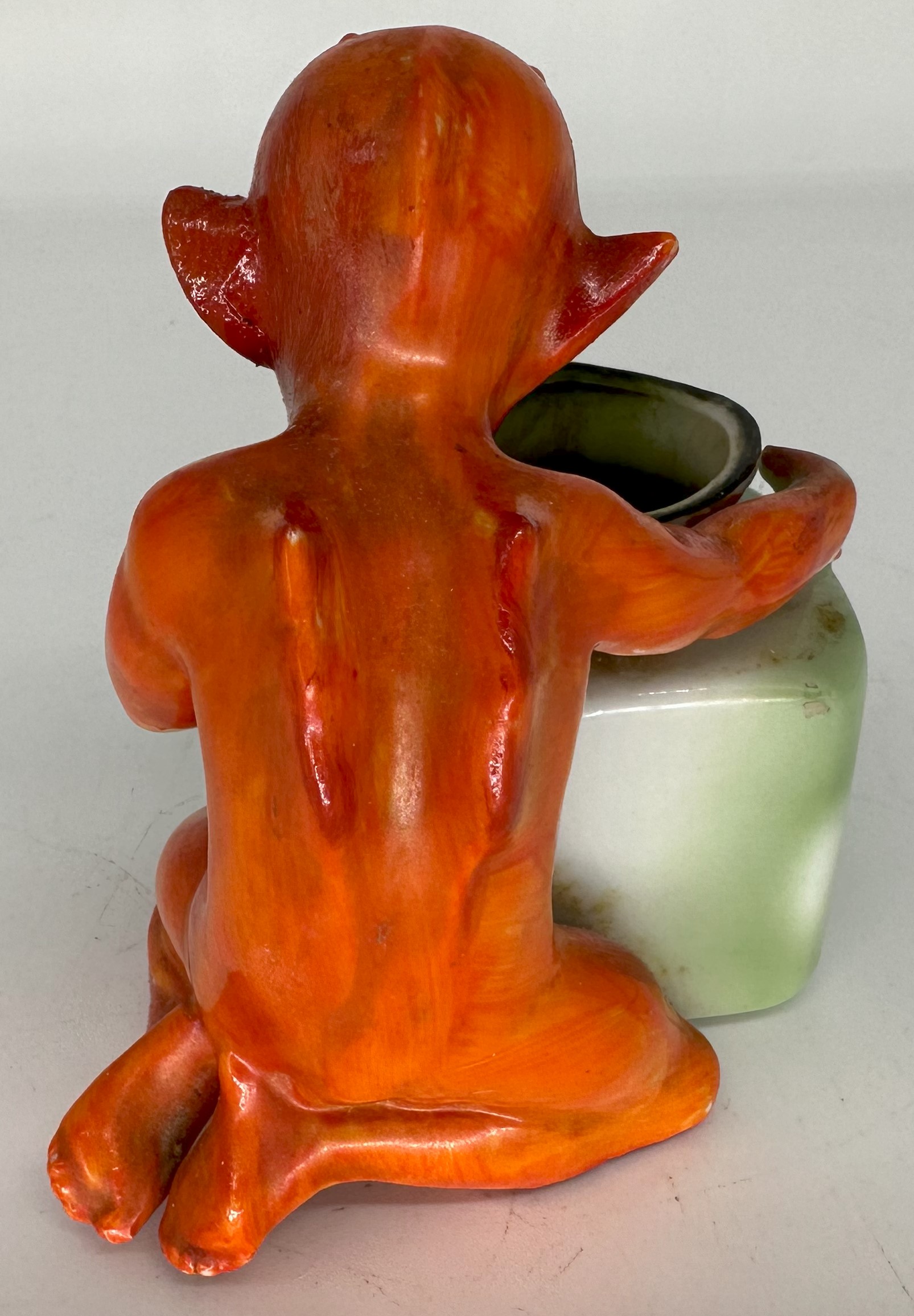 An orange-red porcelain devil with horns, pointed ears, and a ridged back kneels before an inkwell and dips into and tastes the ink. This piece most likely was never used as an inkwell, but rather served as a knickknack. It may have been made by Royal Bayreuth in Germany.