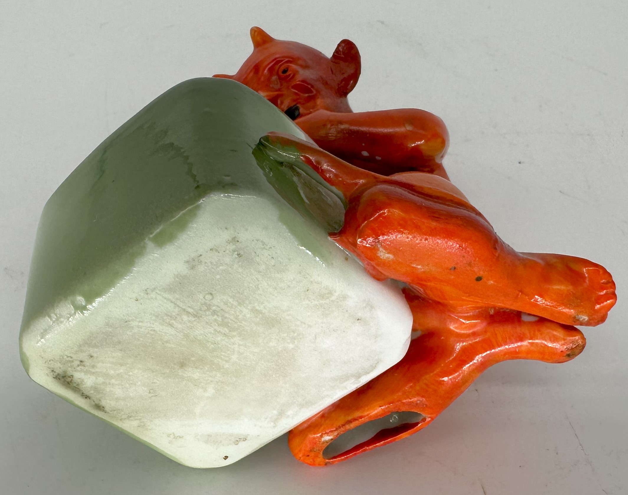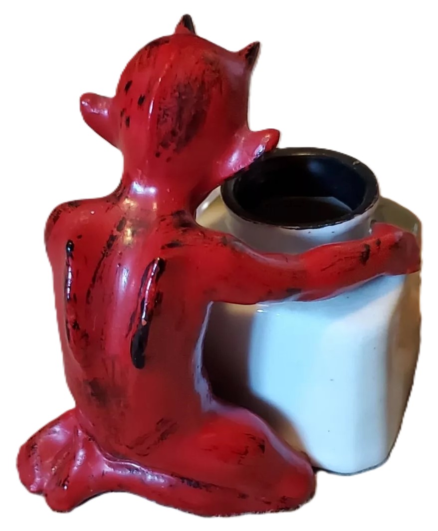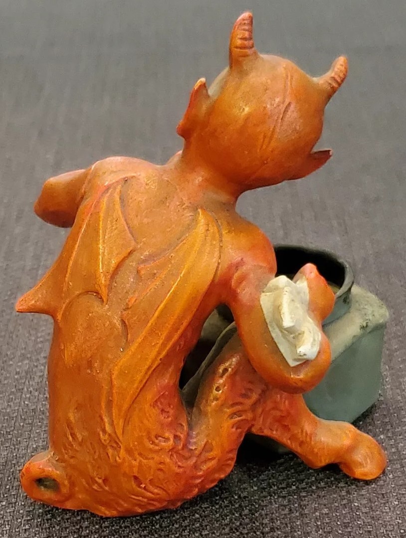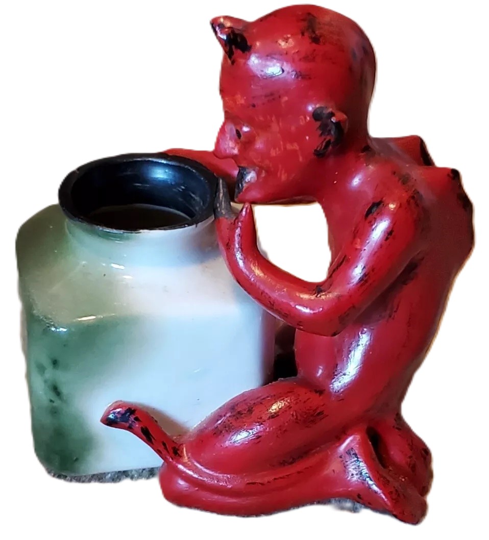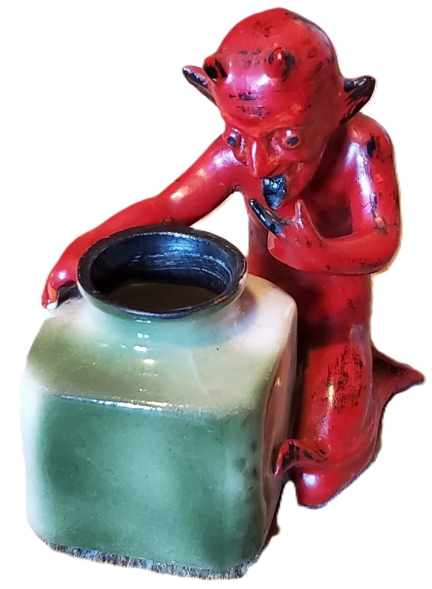 An orange-red porcelain devil with horns, pointed ears, and a ridged back kneels before an inkwell and dips into and tastes the ink. This piece most likely was never used as an inkwell, but rather served as a knickknack. It may have been made by Royal Bayreuth in Germany.