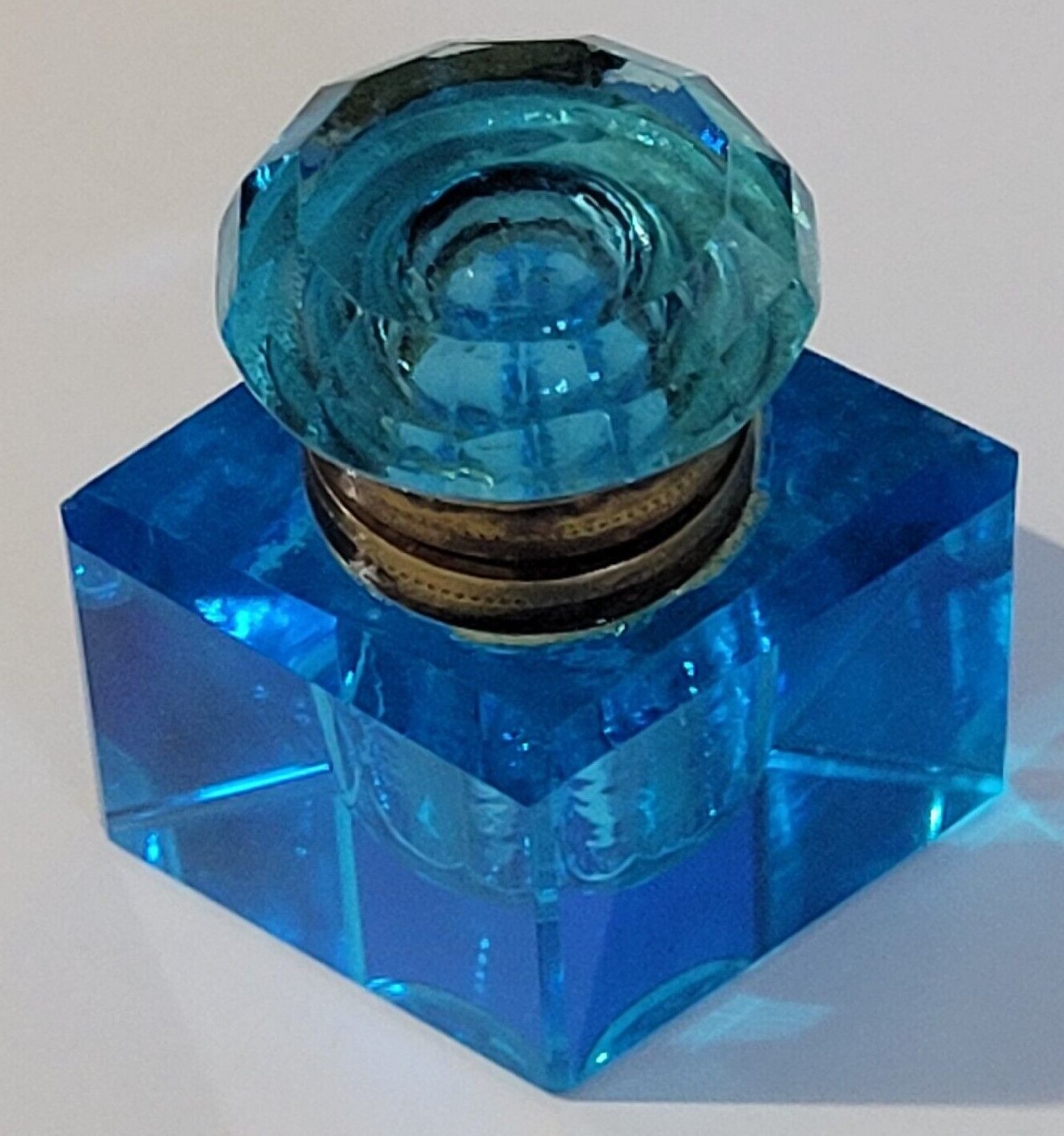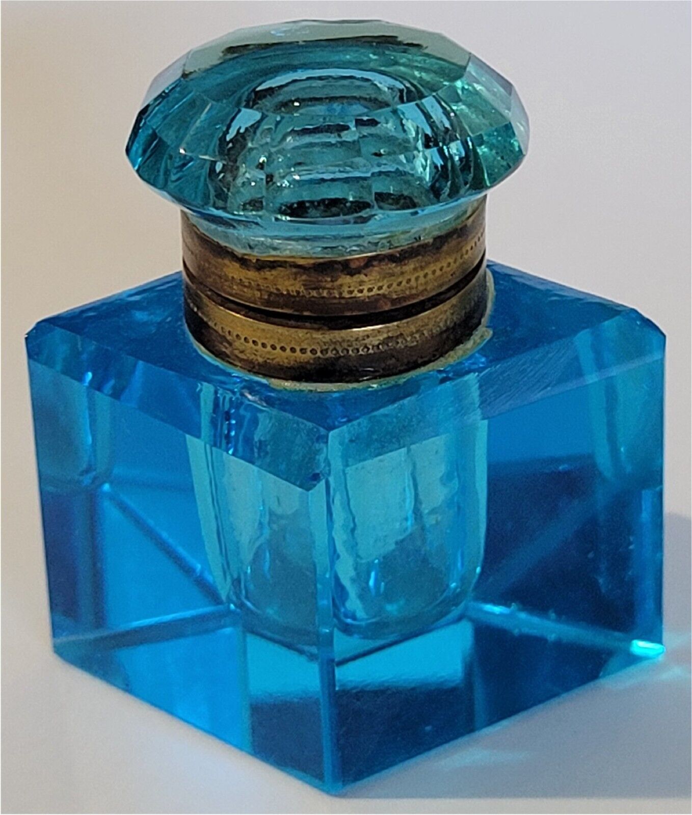 Diamond-shaped, sapphire blue, cut glass inkwell with brass mountings.