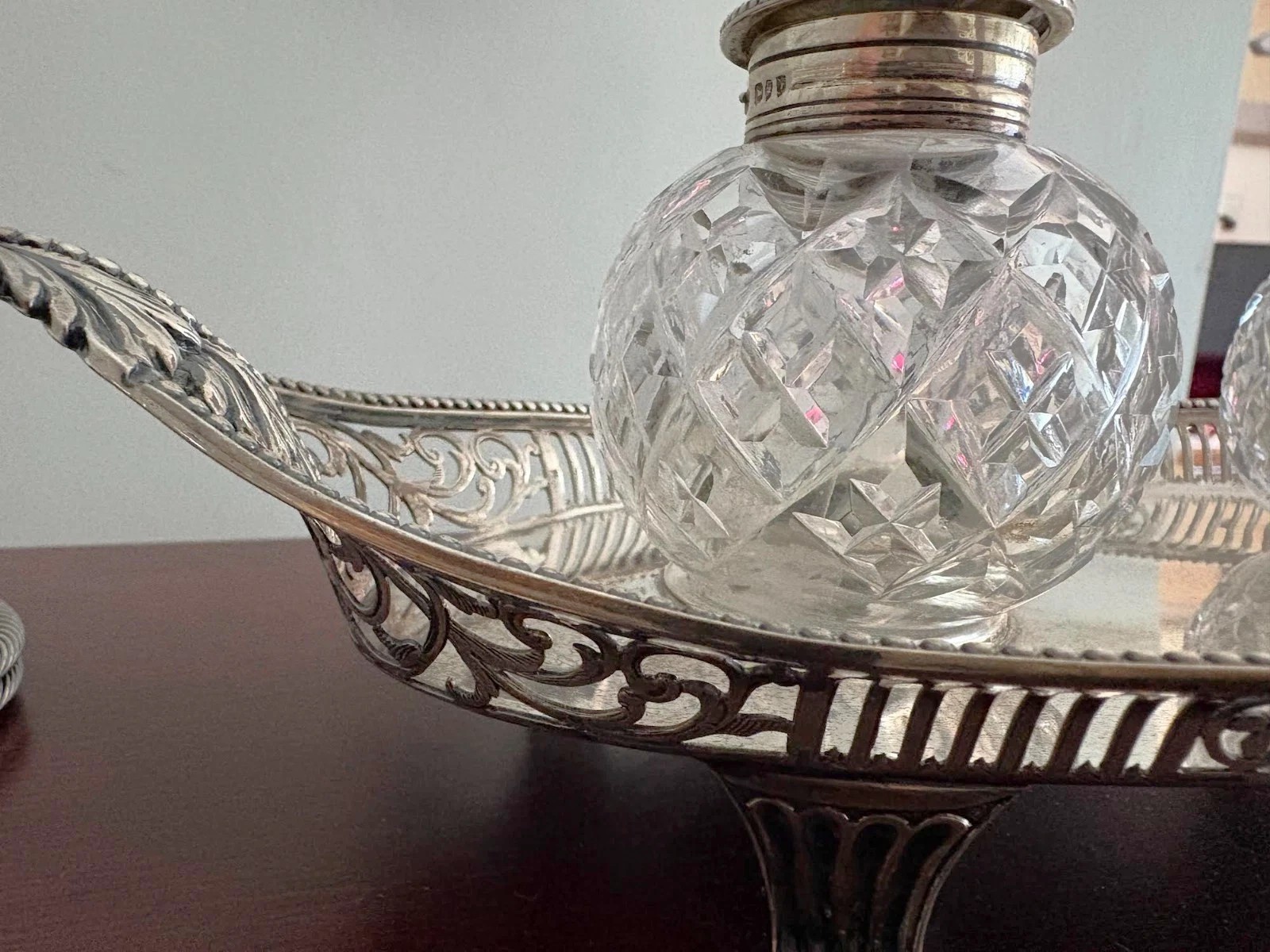 This boat-shaped inkstand is typical of the high-end “Old English” and Neo-Classical revival styles popular in the 1890s.