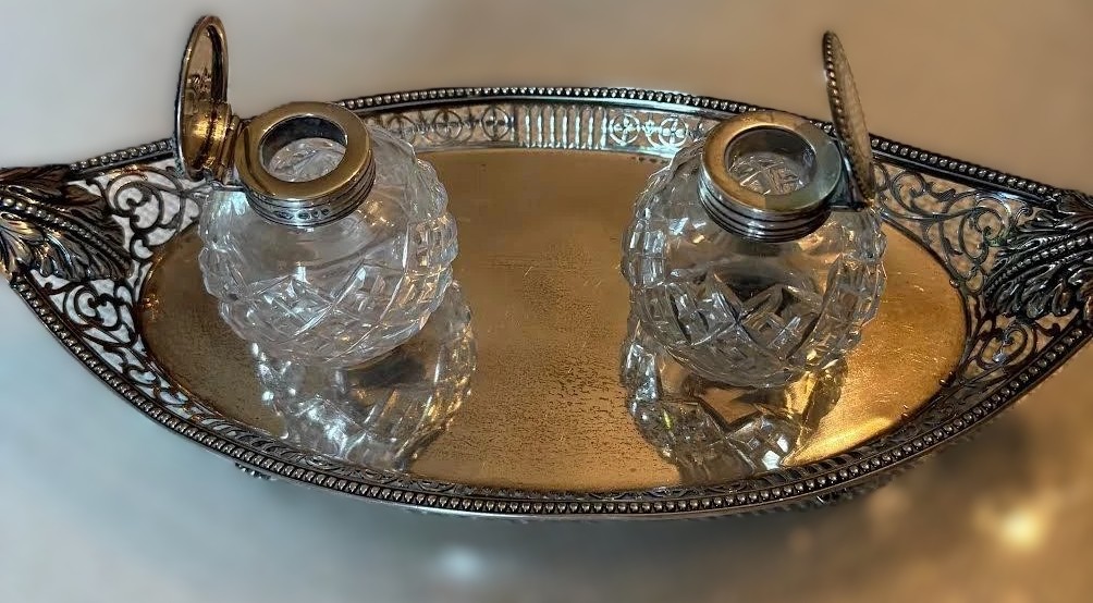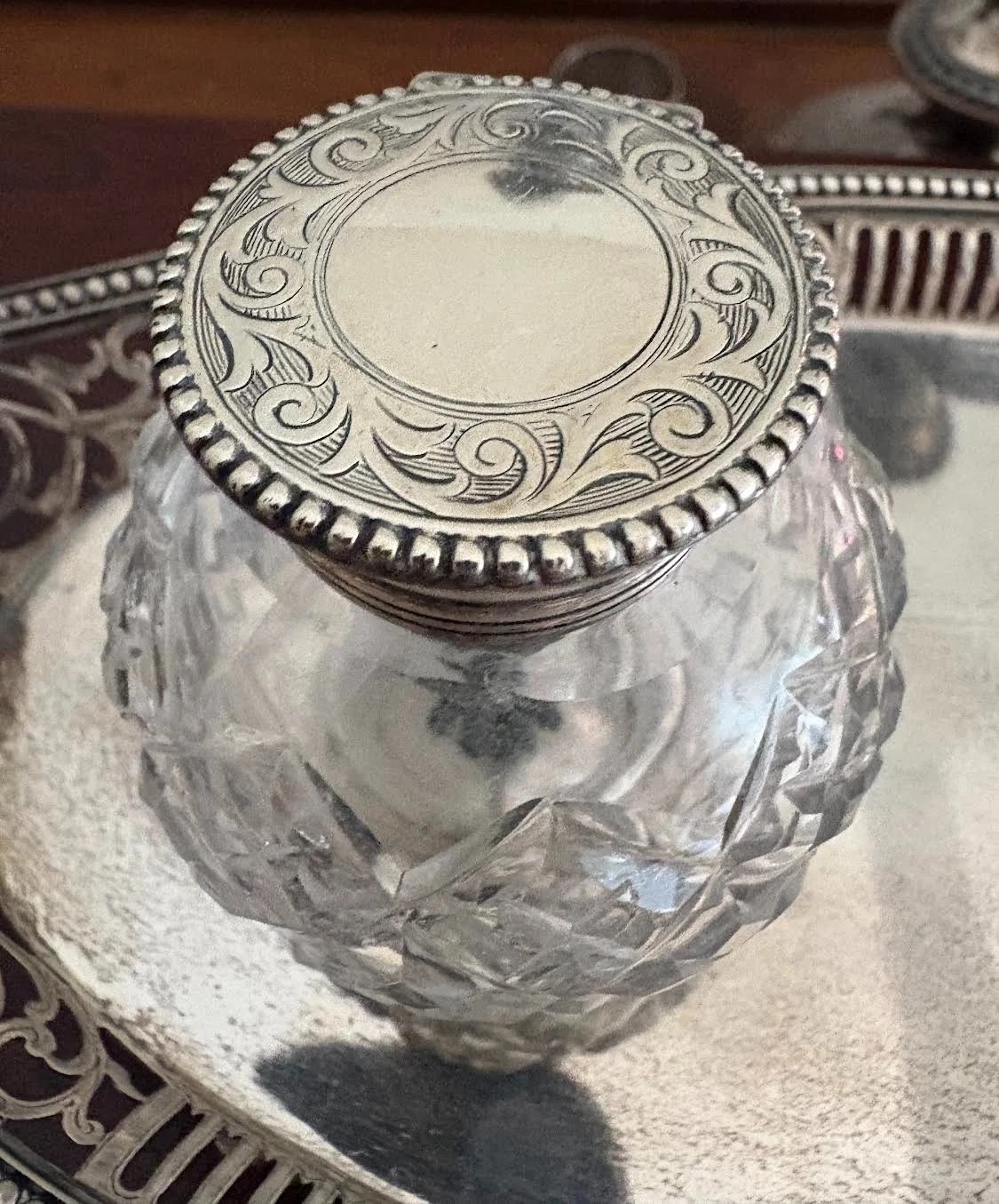 - The Inkwells: The two heavy faceted crystal bottles are cut in a diamond/hobnail pattern. The silver lids are ornately engraved with scrollwork and feature beaded rims.