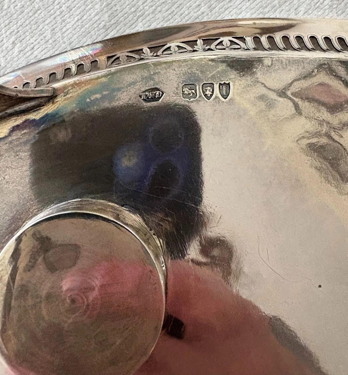 - Maker’s Mark (T.W.D): This mark, enclosed in a six-sided polygon, was registered by Thomas William Dobson of Dobson & Sons. The firm was established at 32 Piccadilly, London, which matches the “Dobson Piccadilly” stamp on the base of your tray.