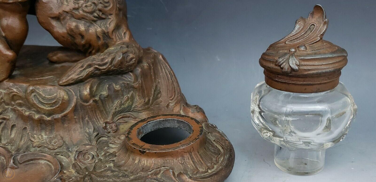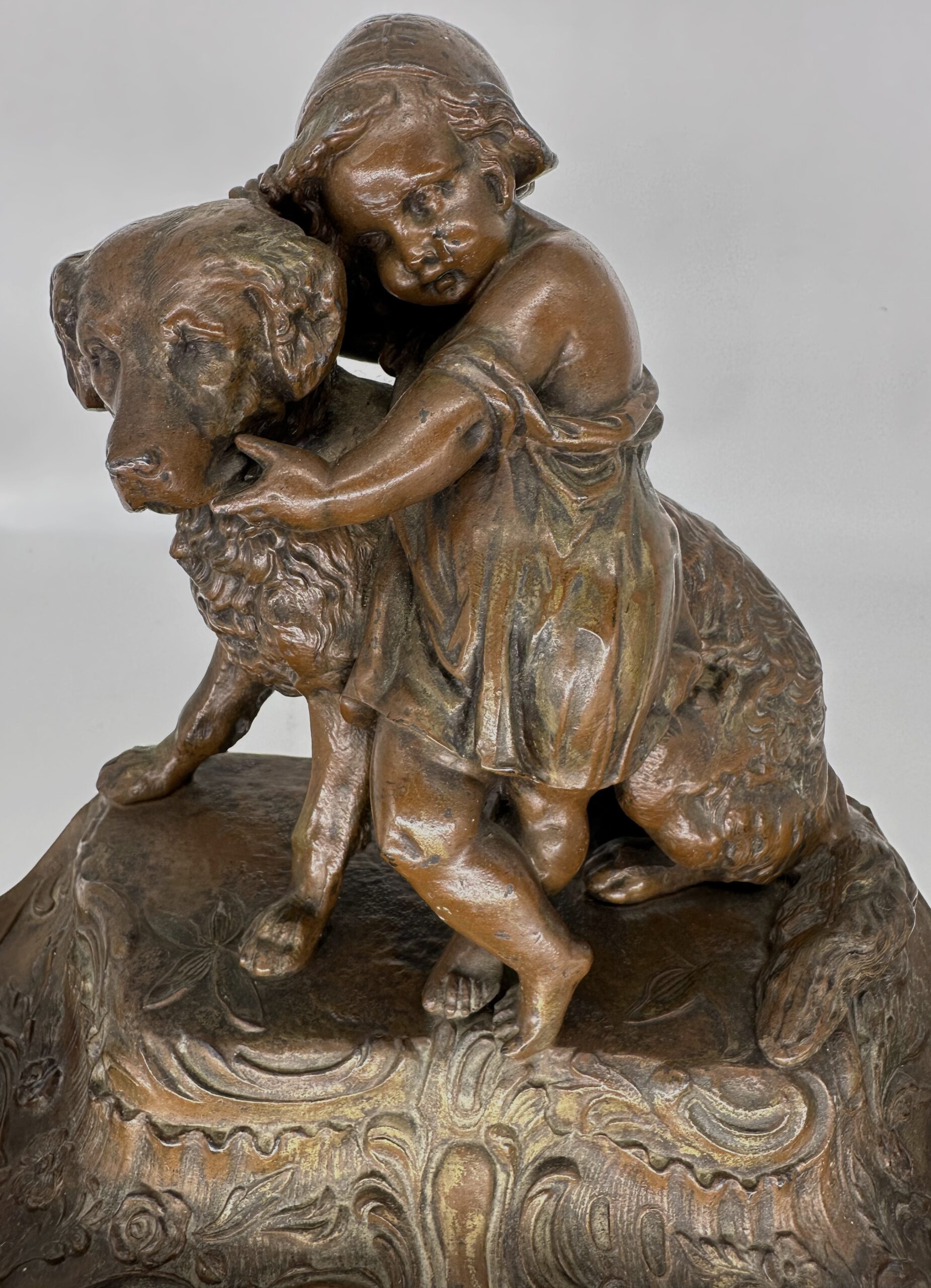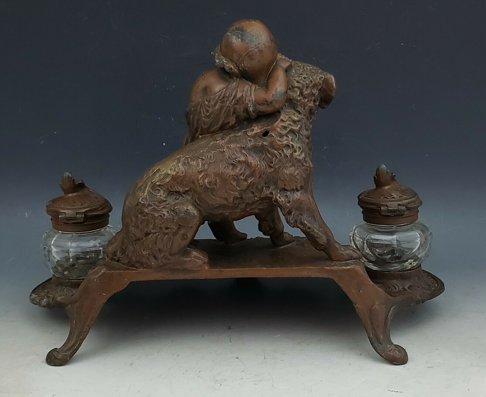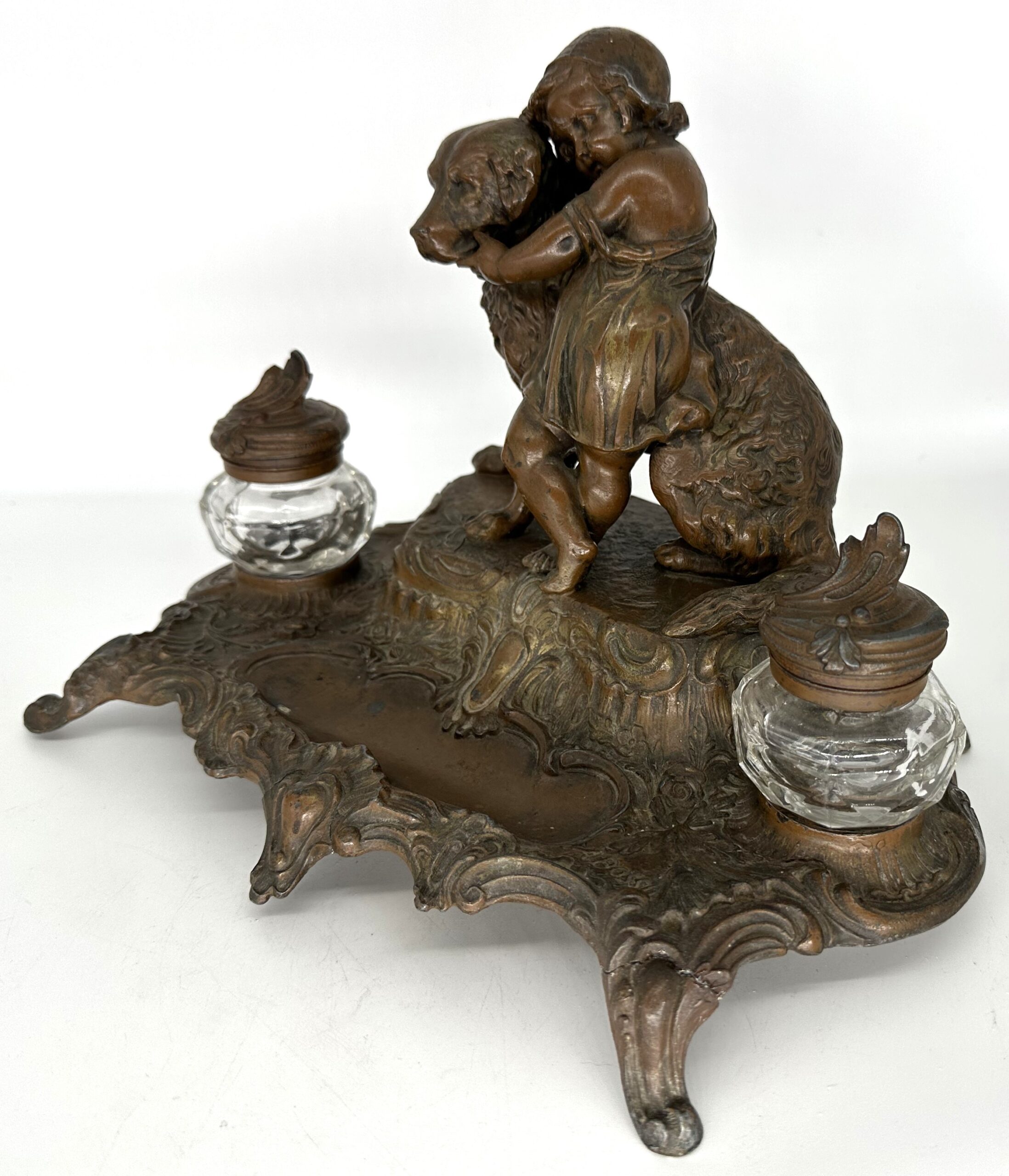 The curved lines shown in this bronzed spelter double inkstand, signed A. Bosssu, reflect the Art Nouveau style of the late 19th century. We enjoy seeing the child’s affection for her dog in this beautifully cast sculpture. The multiform glass inkwells have hinged lids and stems that fit into the inkstand.