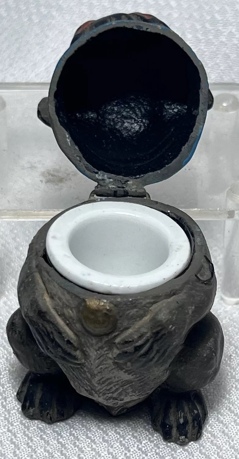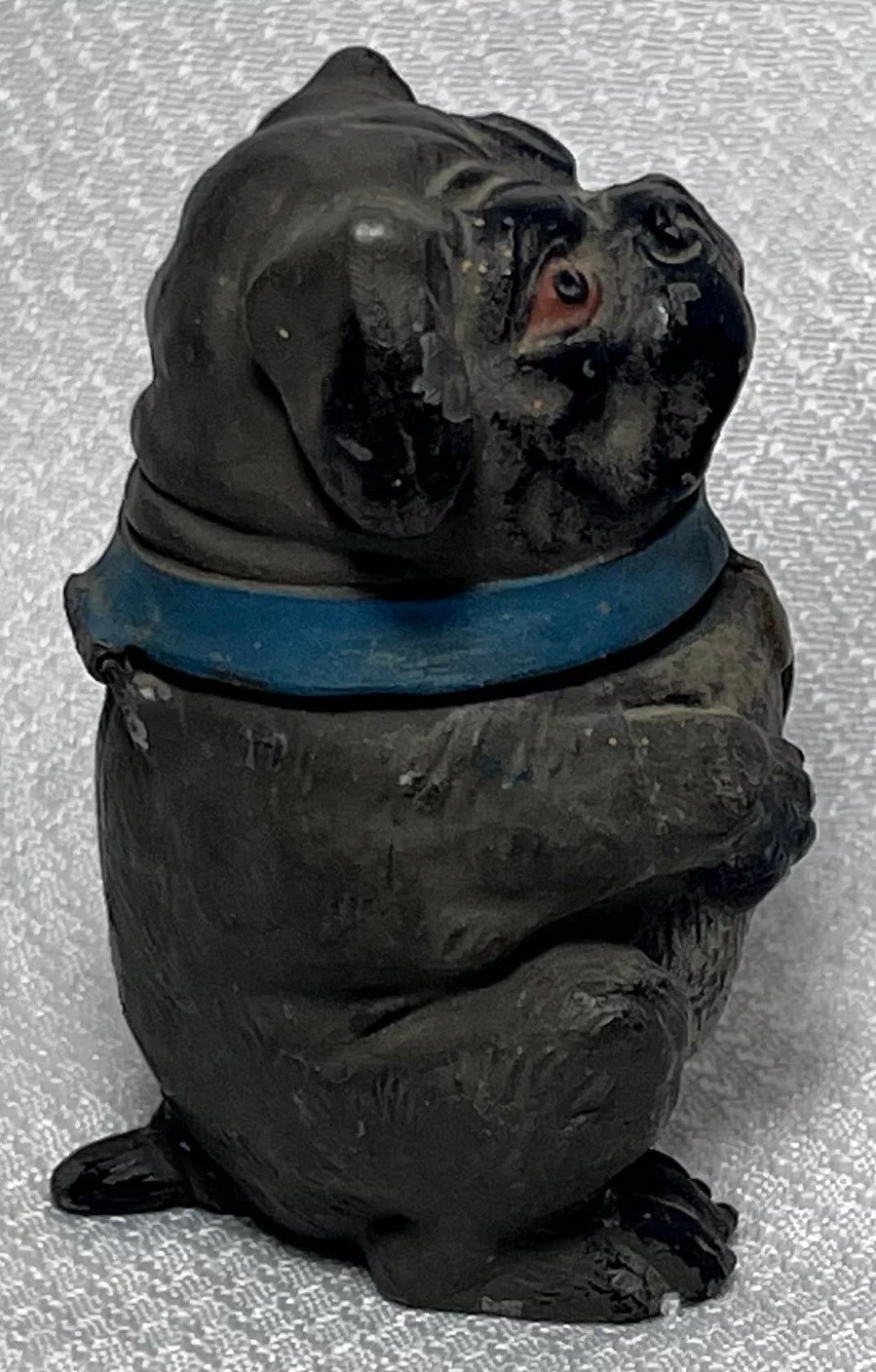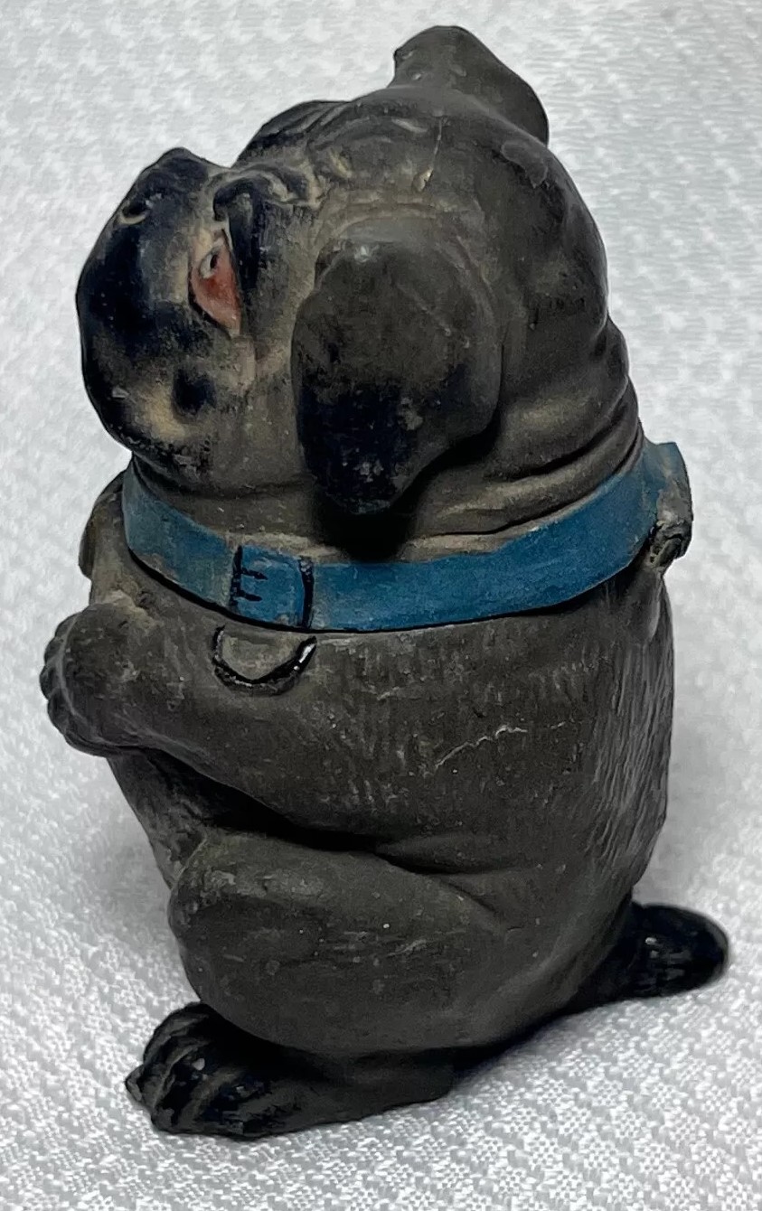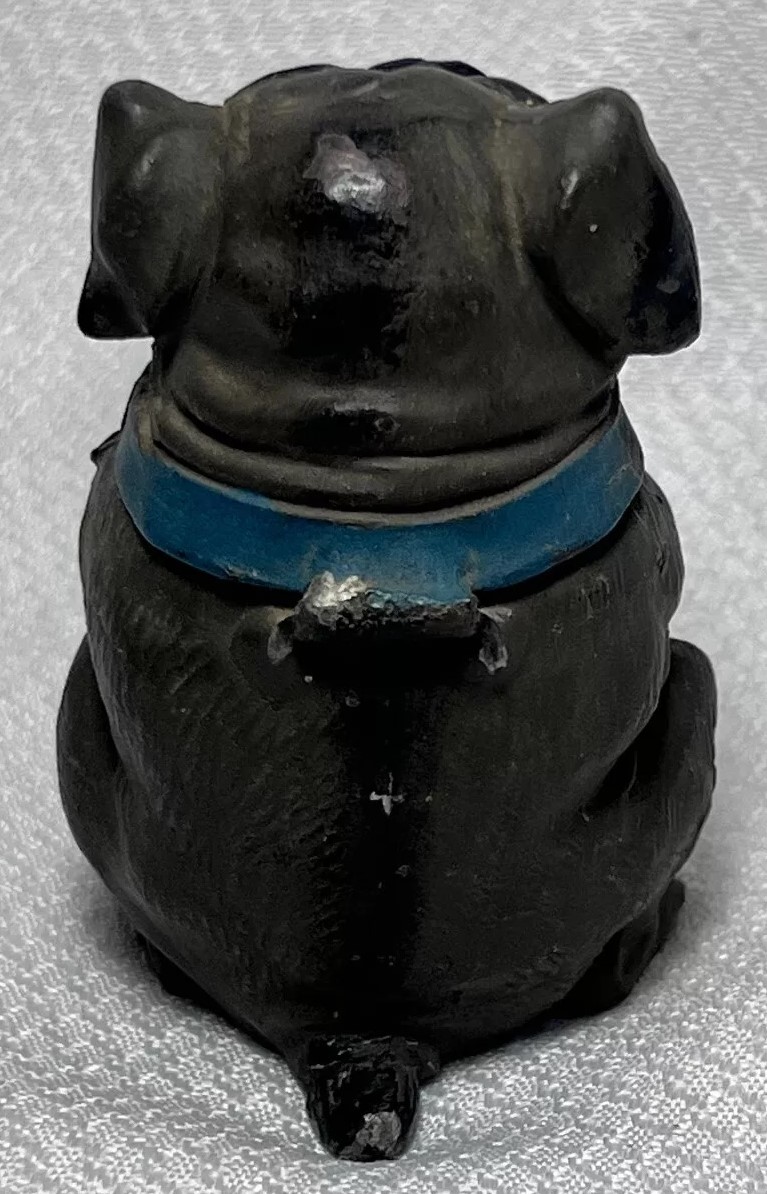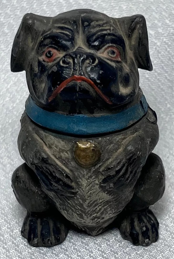 This figural dog inkwell is made of pot metal. He is sitting upright with its front paws positioned close together. He has a broad, flat face with wrinkles, and large round eyes – maybe a mix of pug and bulldog. The collar is hinged and opens to access the inkwell.