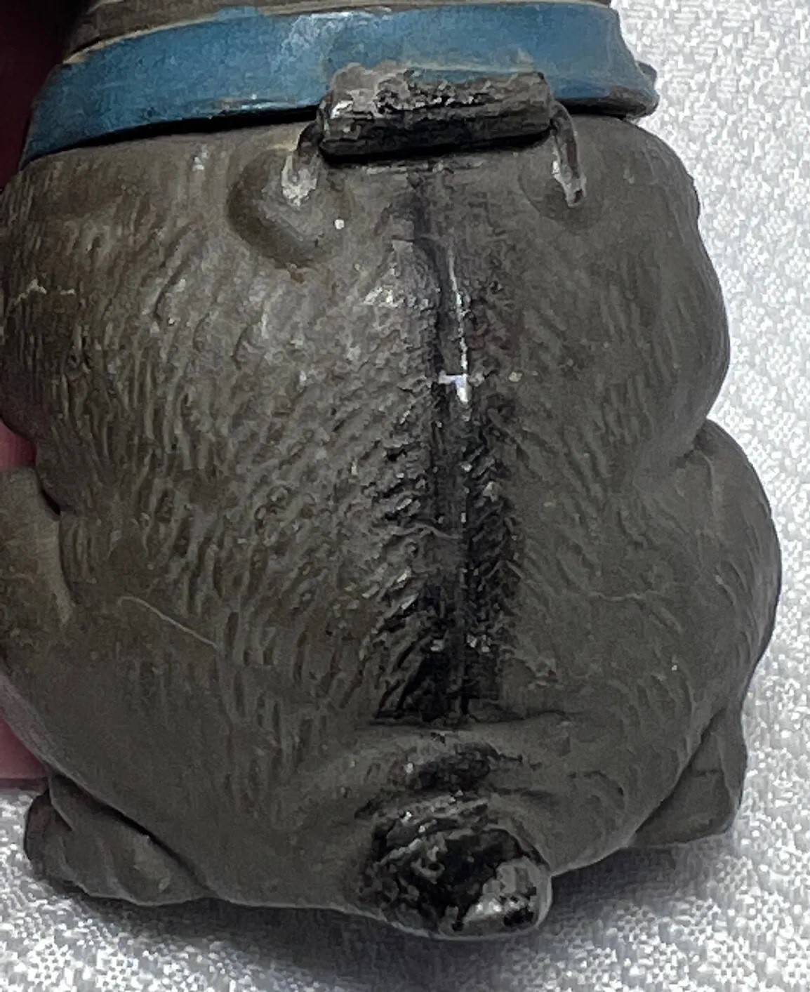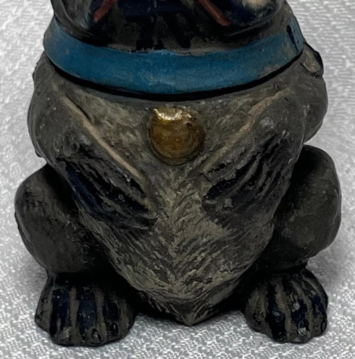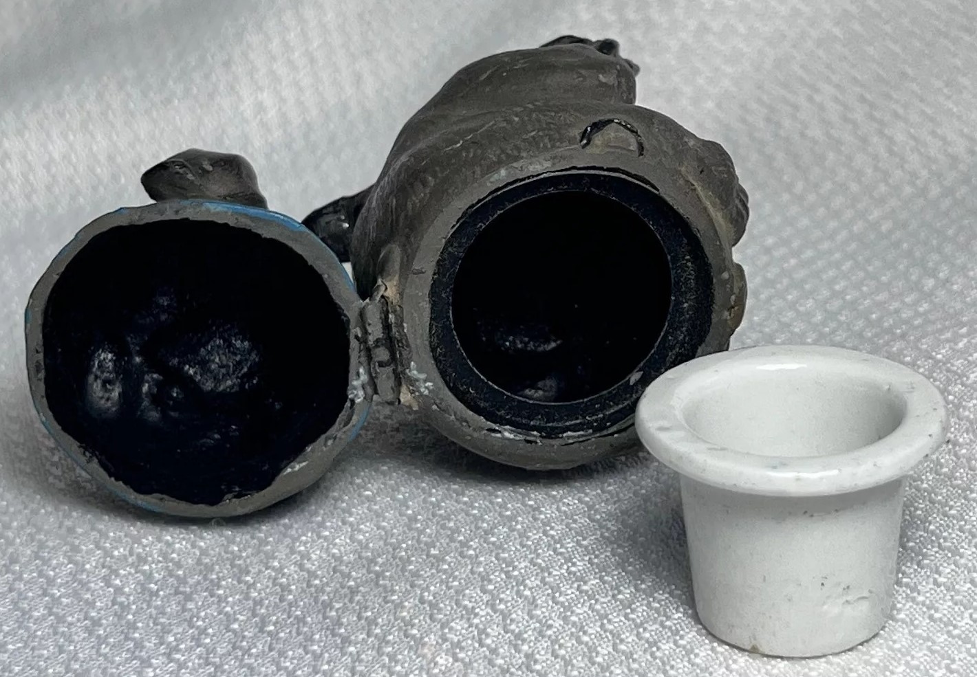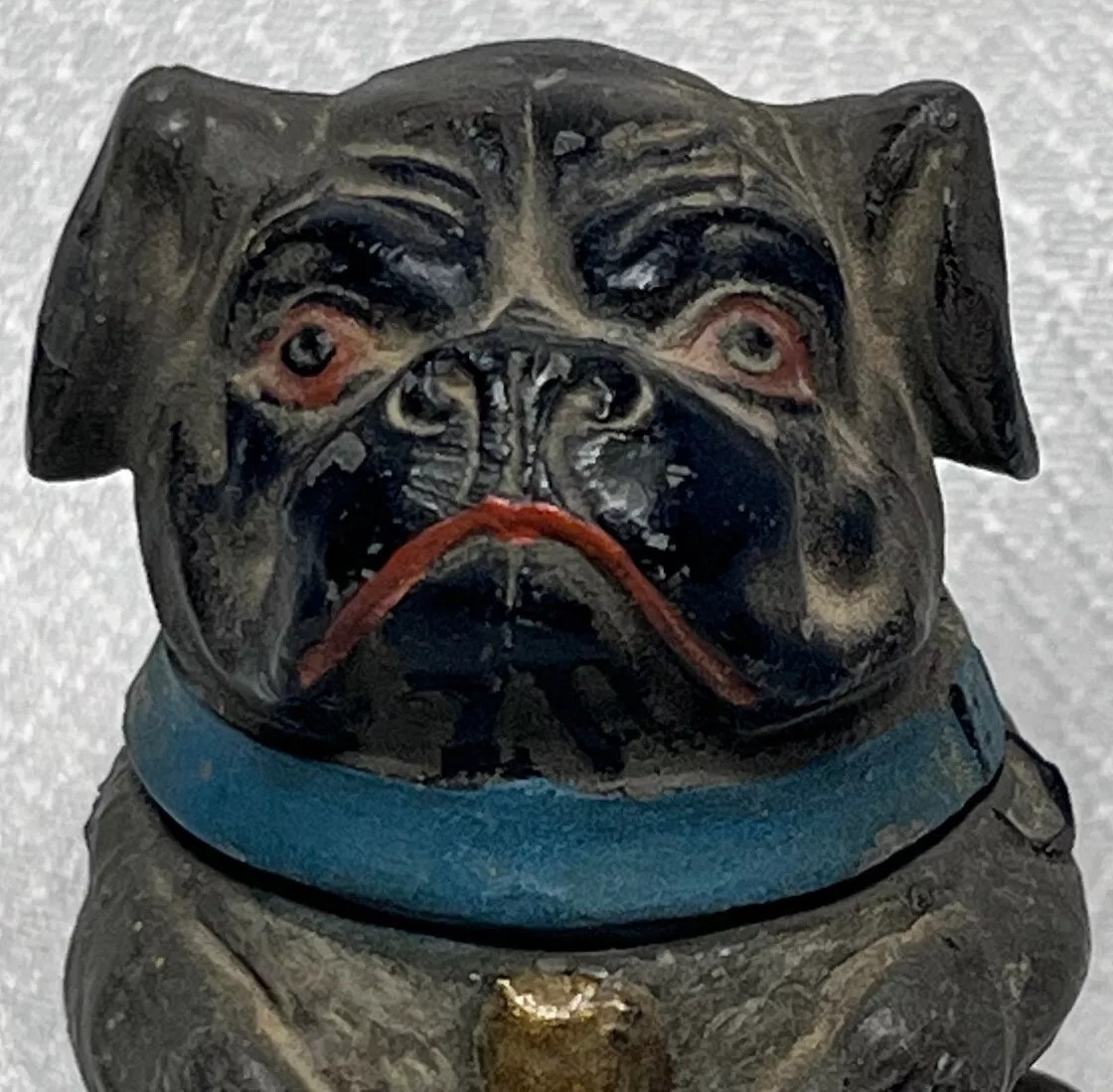 This figural dog inkwell is made of pot metal. He is sitting upright with its front paws positioned close together. He has a broad, flat face with wrinkles, and large round eyes – maybe a mix of pug and bulldog. The collar is hinged and opens to access the inkwell.