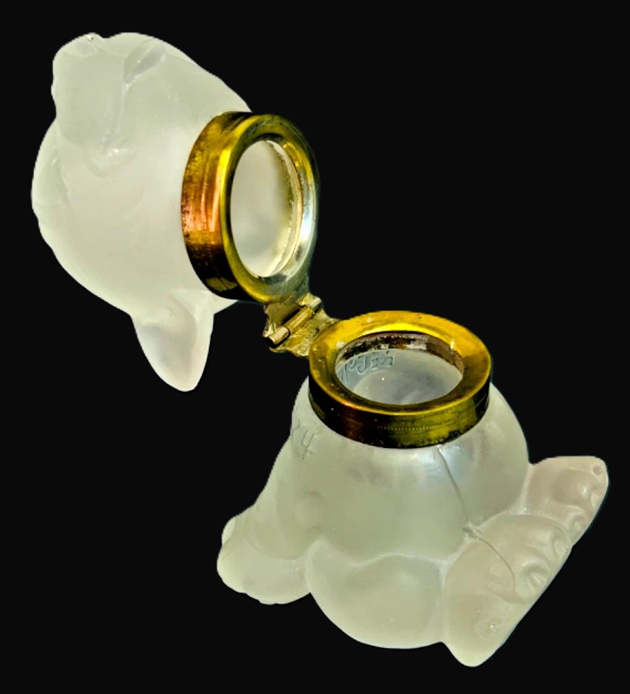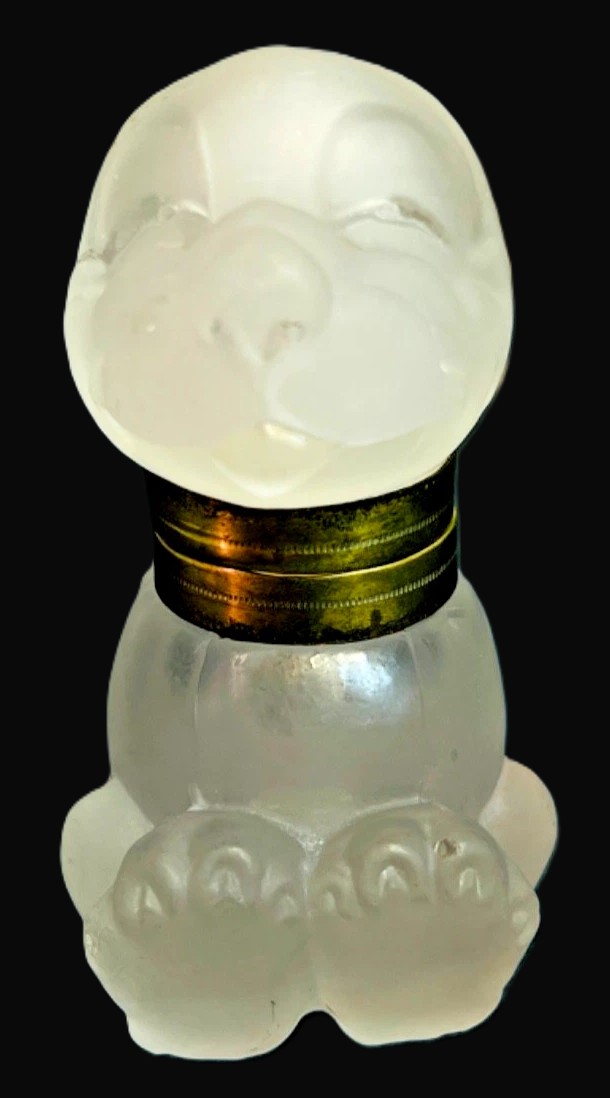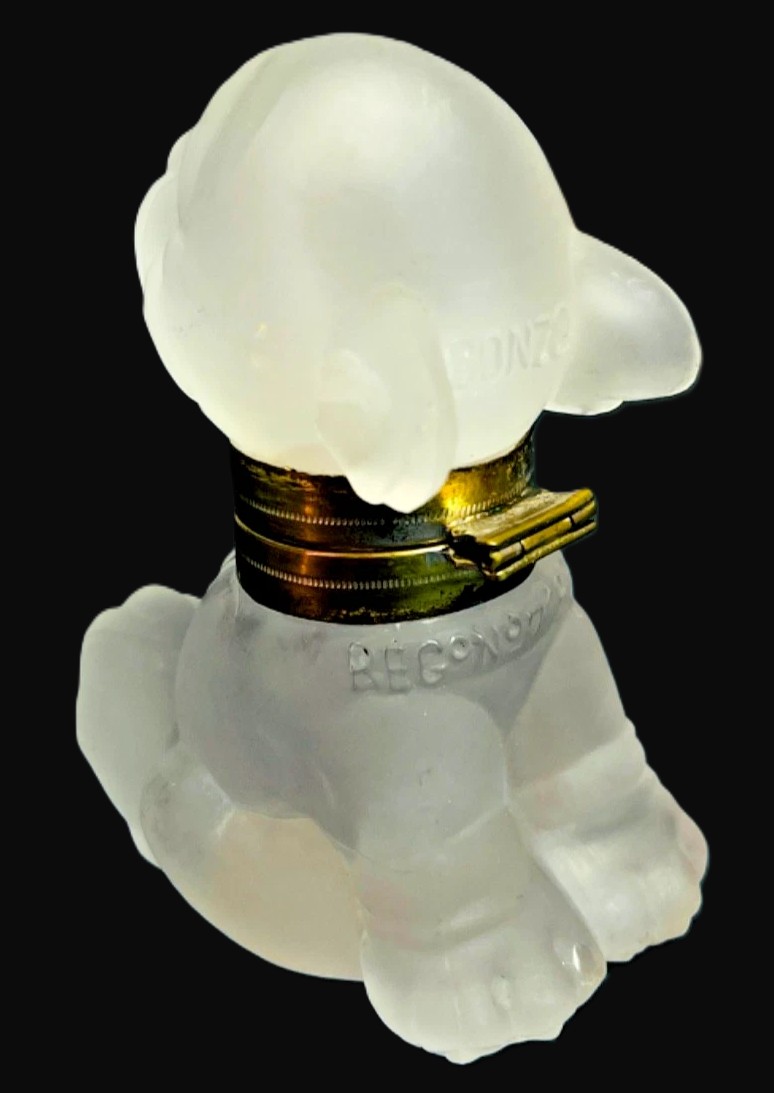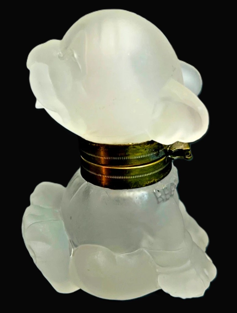 This piece is made of Czechoslovakian glass marked on the collar. The British Registration number is impressed into the glass mold, Registration No. 719074 (dating this to 1926). The word BONZO is impressed into the back of the dog’s head.